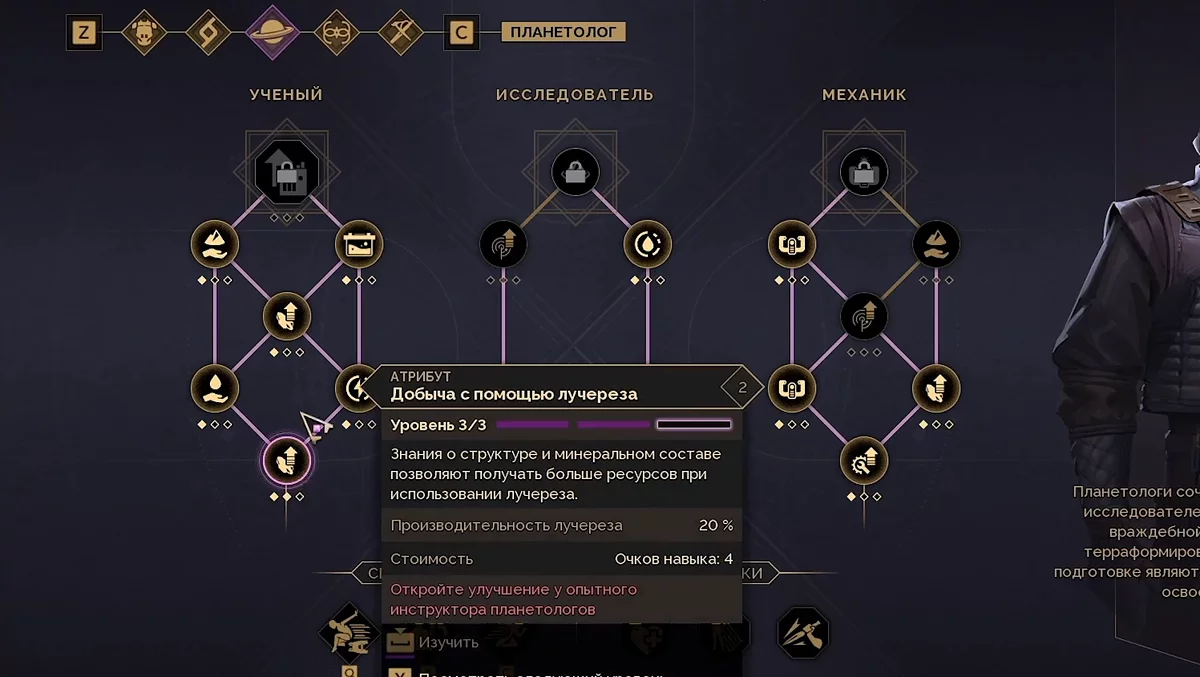 Планетолог — единственный класс в игре, который нельзя получить на этапе создания персонажа. Развитие ветки позволяет оптимизировать добычу ресурсов и расход материалов в ремонте, а также открывает навыки ускорения регенерации воды и расширения области сканирования.