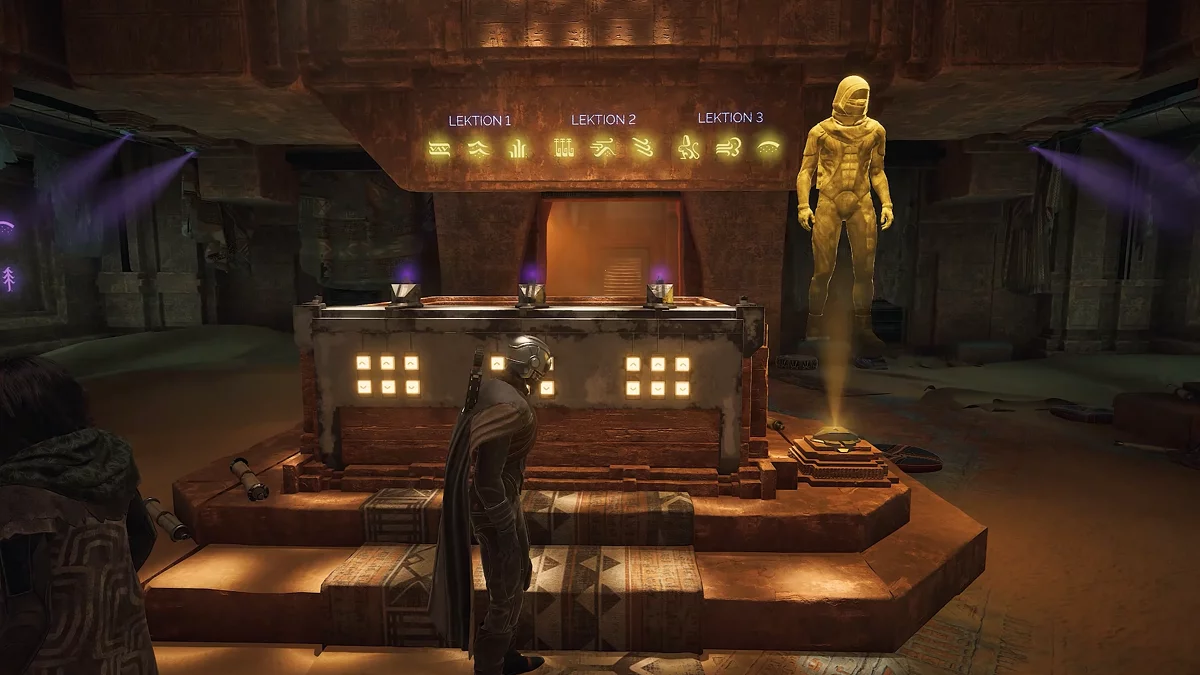 Дальше вас встретит следующая головоломка. Нужно три раза правильно расставить ряд знаков, используя кнопки на пьедестале. Чтобы понять, какие символы должны быть на месте, внимательно слушайте реплики голограммы справа.