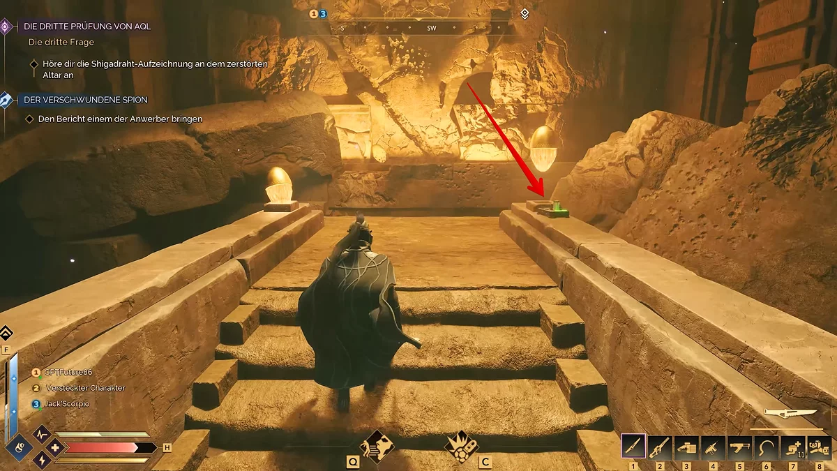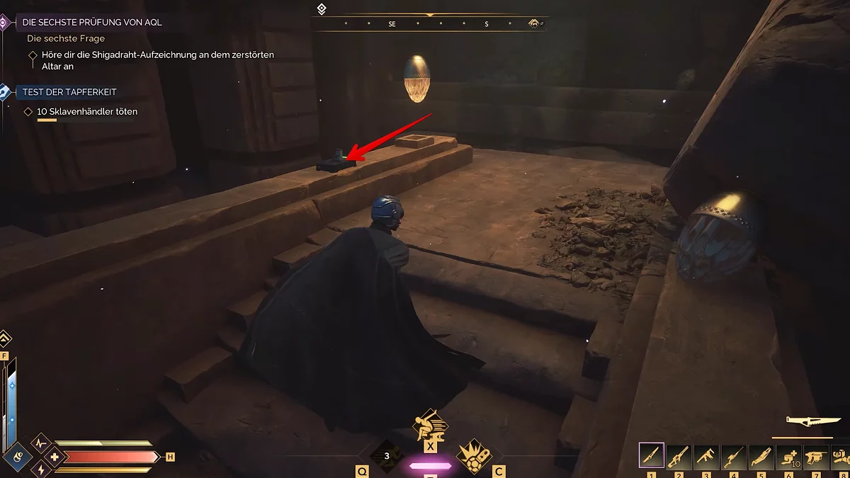 Войдите в пещеру и перебейте всех врагов. Учтите, что среди обычных пехотинцев будет два разведчика и один тяжеловес. Отыщите гробницу в конце локации и прослушайте аудиозапись, что лежит на правом парапете перед руинами святилища.