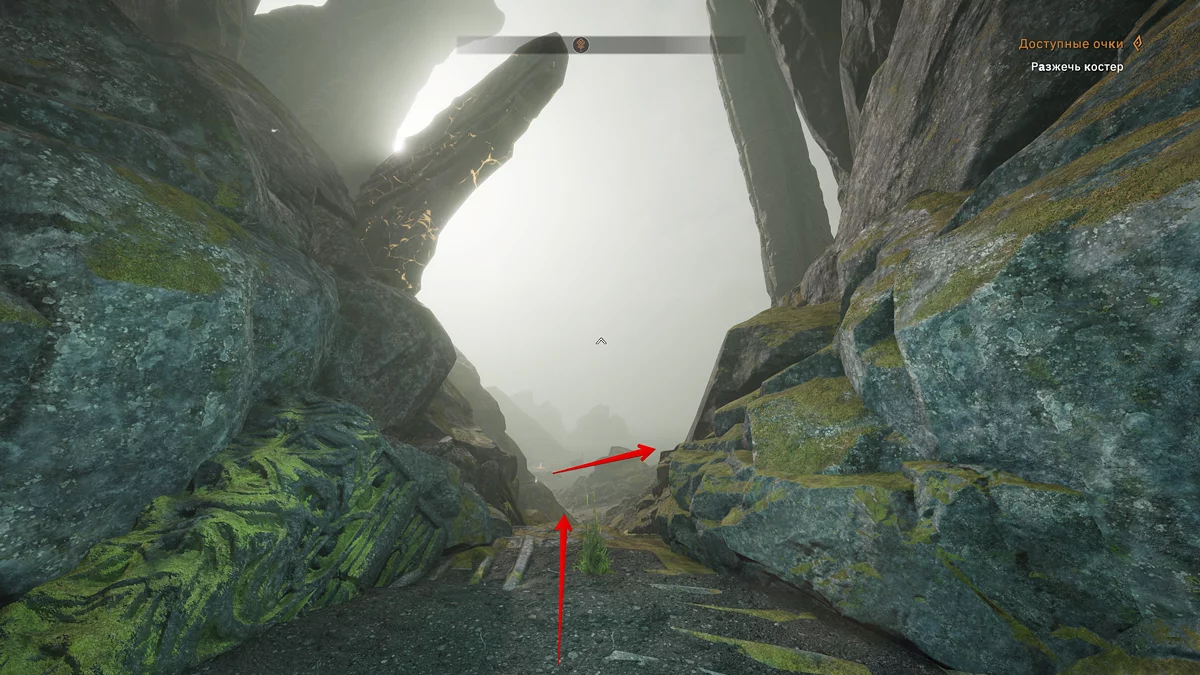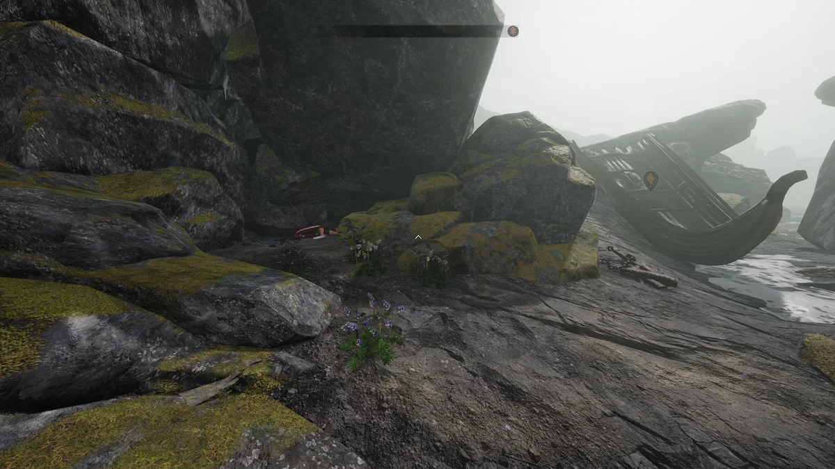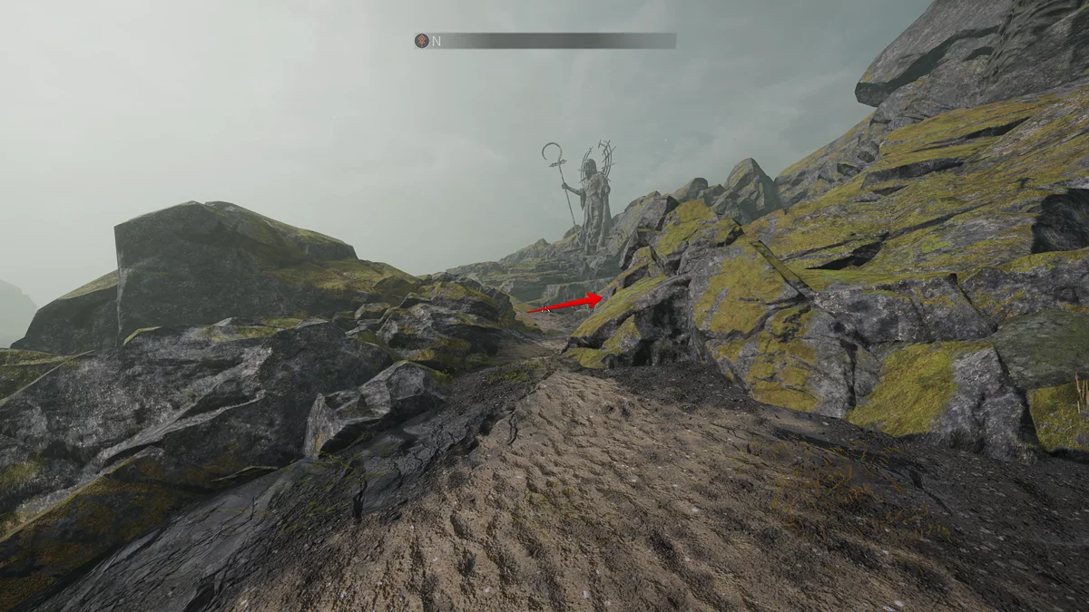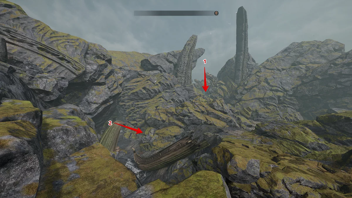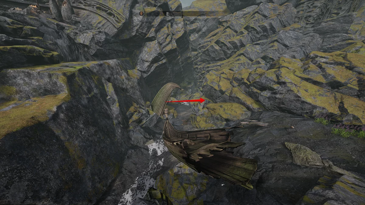 Увидев гигантскую статую, пройдите по тропе до разрушенных лодок и повернитесь перед ними направо.