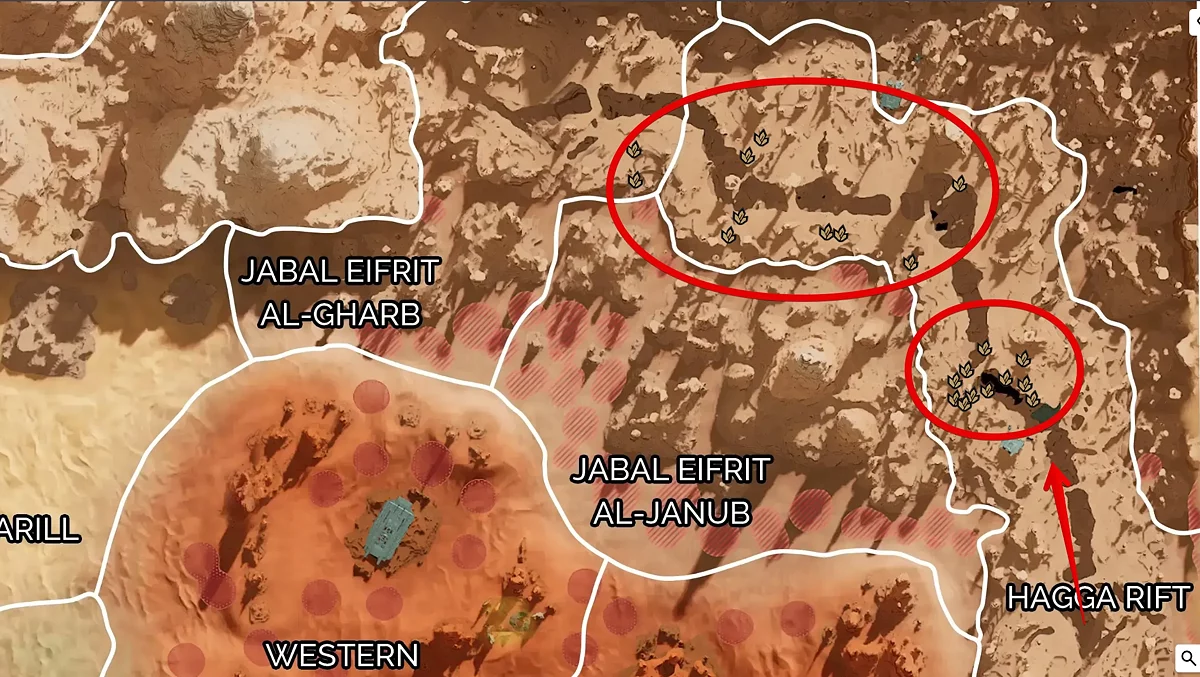 Месторождения минерала можно найти только в области «Котловина Хагга». Кристаллы расположены на дне ущелья. Чтобы туда попасть, от «Наковальни» двигайтесь на северо-восток в каньон и внимательно смотрите по сторонам.