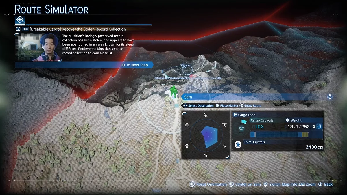 В этой миссии вам предстоит отыскать коллекцию пластинок — крупный груз, который оказался у подножия скалы. Вам предстоит достать хрупкий груз размером L, который находится рядом с терминалом. Приняв задание, вы услышите от Музыканта, что коллекция пластинок спрятана где-то на скале за его убежищем. Наиболее безопасный вариант добраться туда — воспользоваться якорями для подъема (climb anchors). От убежища Музыканта двигайтесь мимо терминала и спускайтесь по восточному склону.