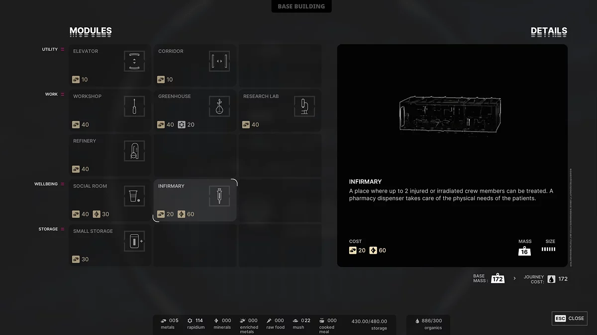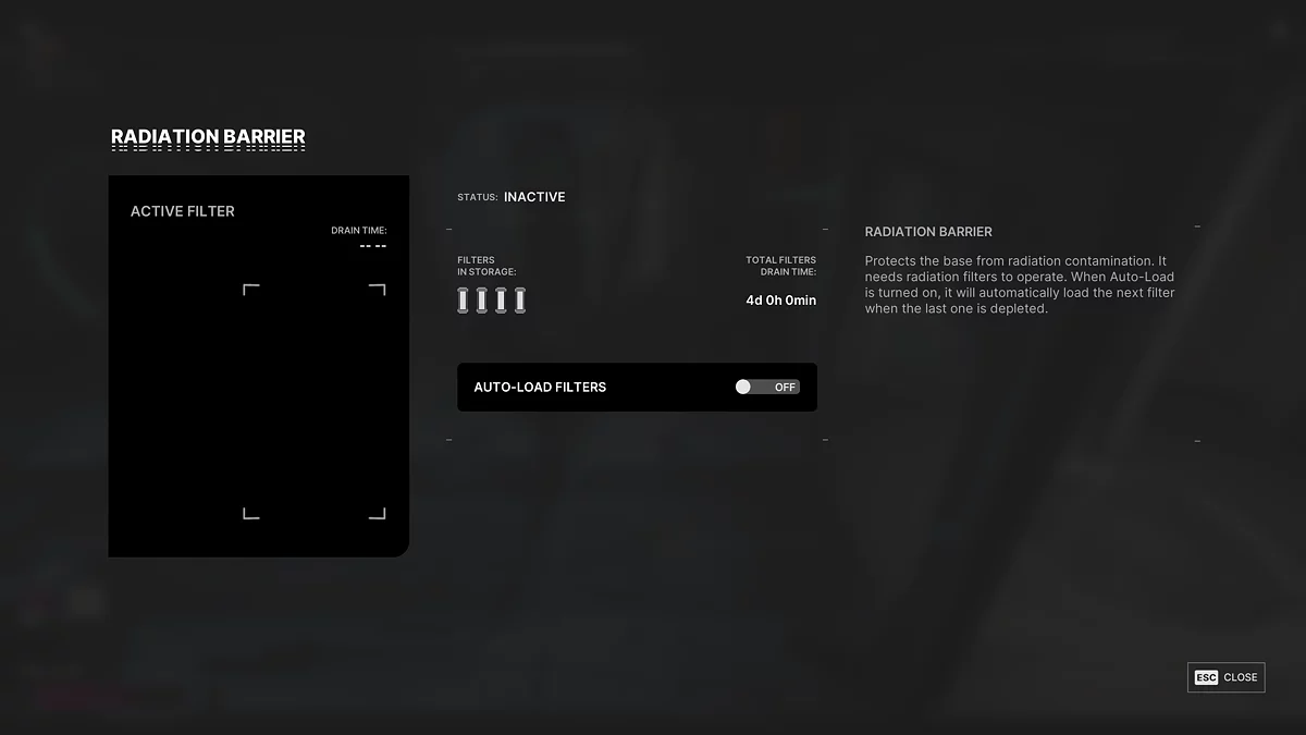 Как уже упоминалось ранее, планета радиоактивна, поэтому база нуждается в бесперебойной работе воздухоочистительной станции в машинном отделении. Система потребляет ежесуточно один противорадиационный картридж, который можно собрать в Мастерской (Workshop).