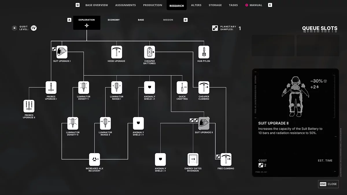Также есть три исследования «Защита от аномалий» (Anomaly Shield), которые позволят несколько раз попасть в инопланетную ловушку. Чтобы получить всю защиту, нужно сначала изучить все улучшения скафандра.