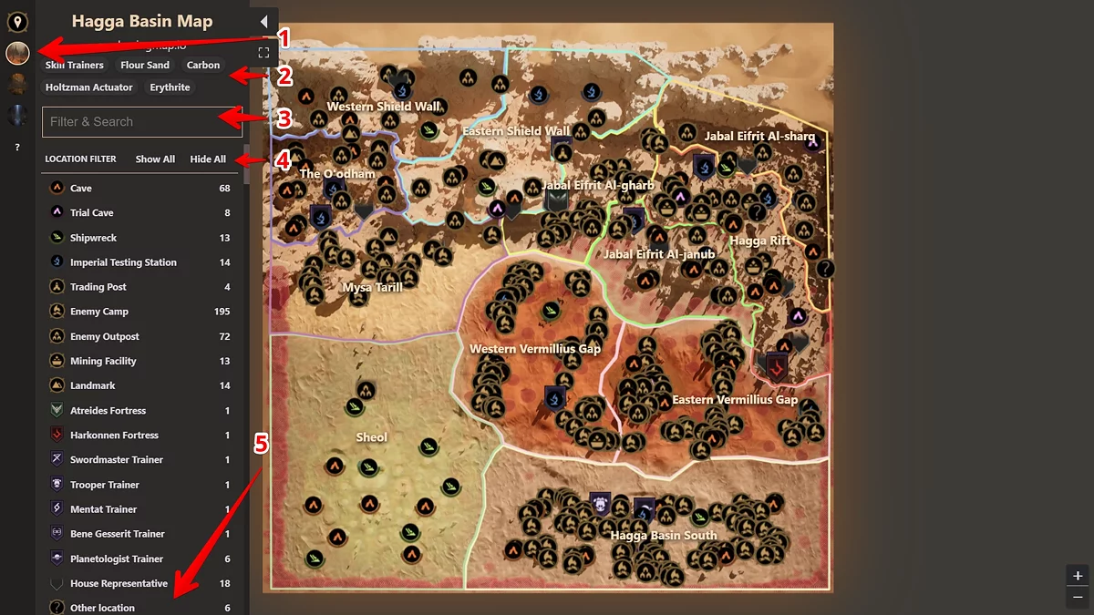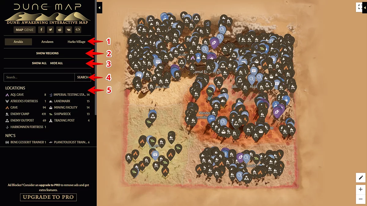 Во второй версии фанатской интерактивной карты представлены все регионы, кроме «Глубокой пустыни» (Deep Desert). Отличается этот вариант присутствием возможности посмотреть ареал распространения, месторождения руд и локаций спавна редких материалов для крафта.Дальше разберёмся с функционалом карты.