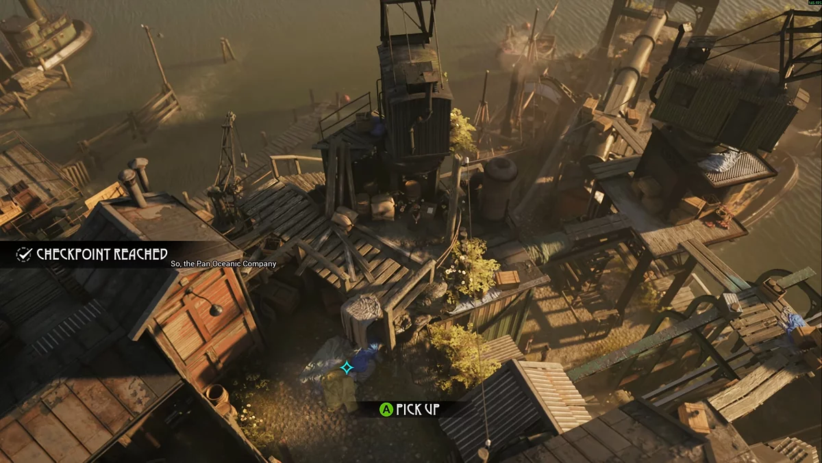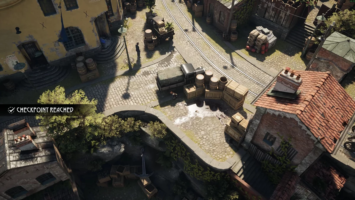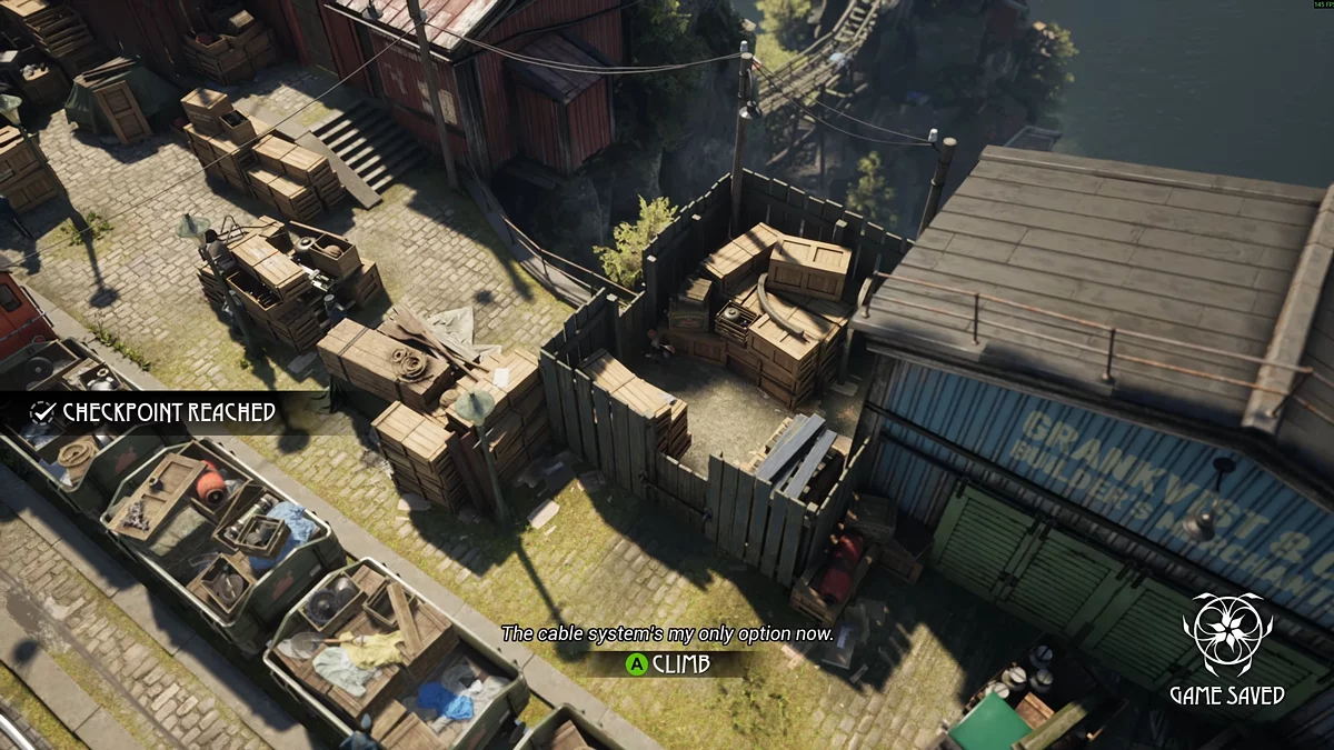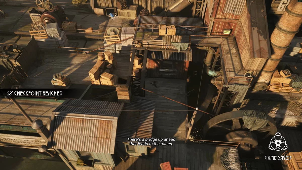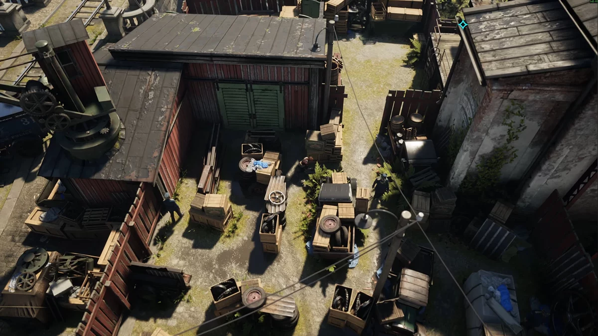 Перепрыгнуть забор нужно ровно в тот момент, когда слева поедет очередной вагон. Он заслонит вас от врагов по ту сторону рельс. Параллельно движению вагона дойдите до синей метке. Игра сохранится автоматически, обозначив следующую сюжетную точку.