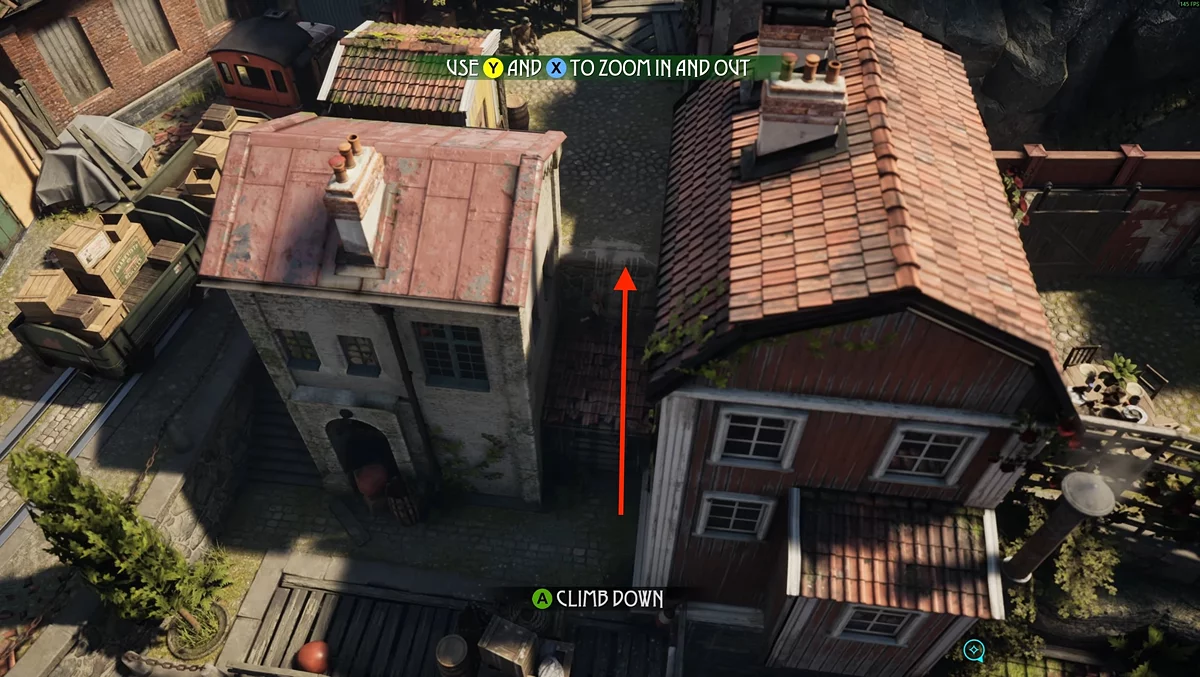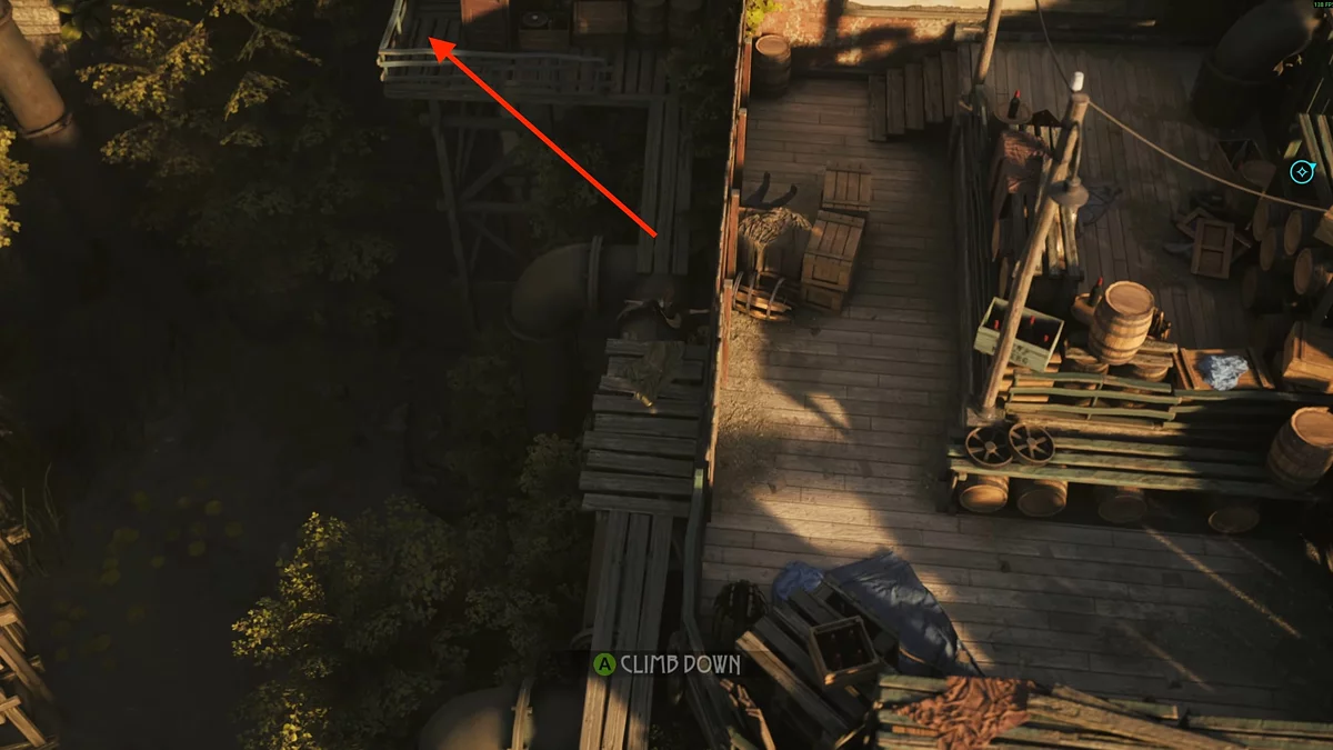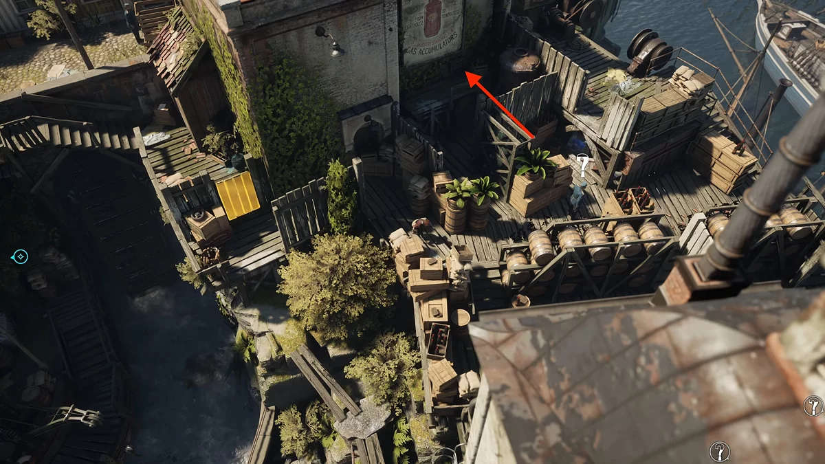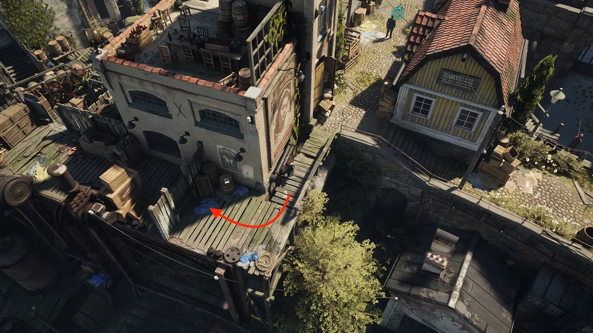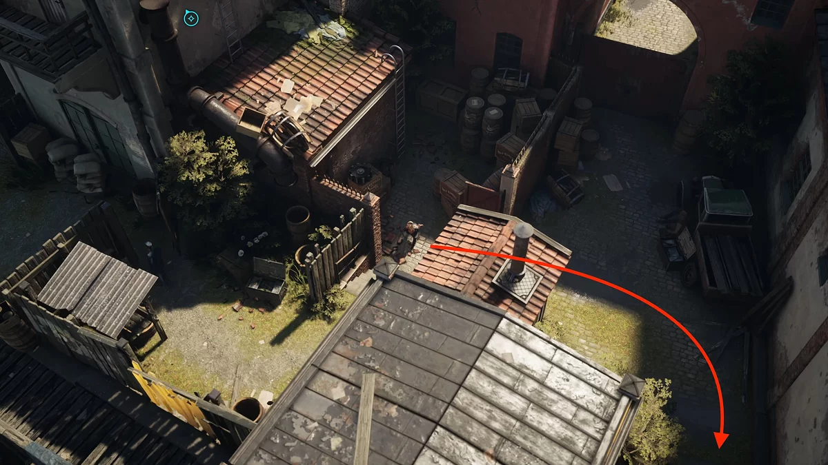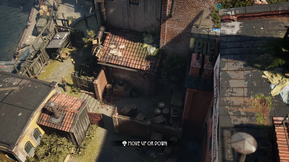 Перейдите на верх соседнего здания. Туда, как некстати, наведались местные рабочие и констебль. Когда первые отойдут, нам придется усыпить полицейского, чтобы незаметно пройти мимо.