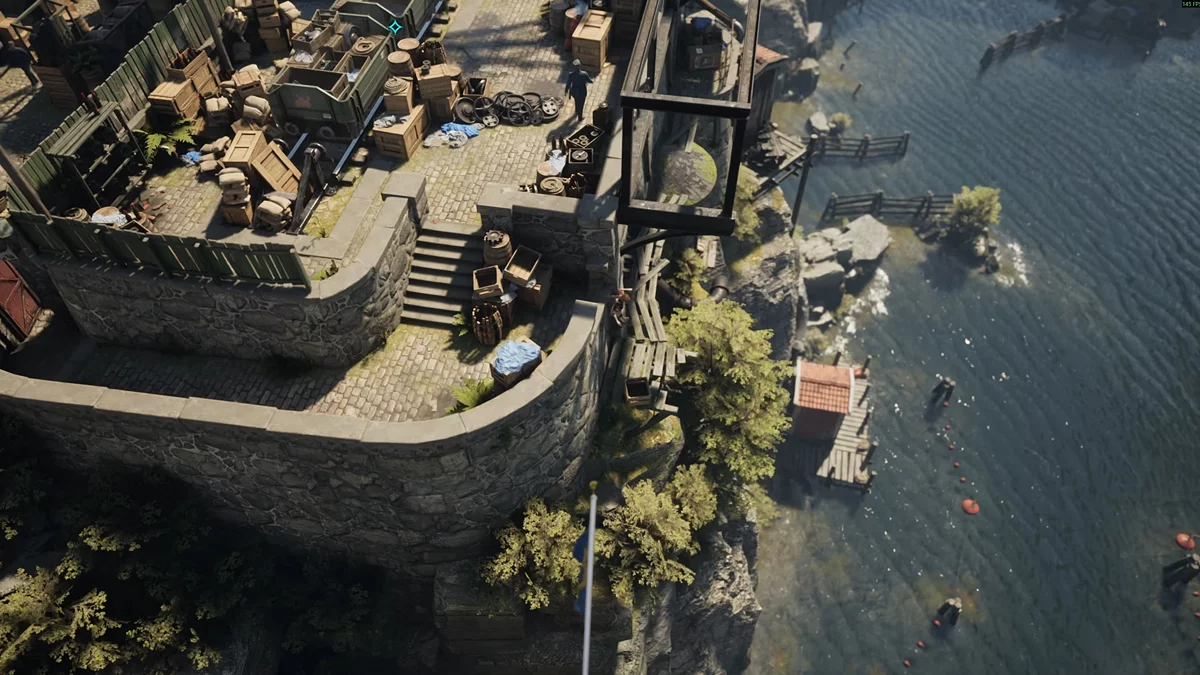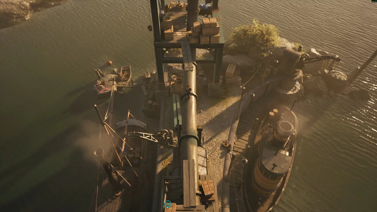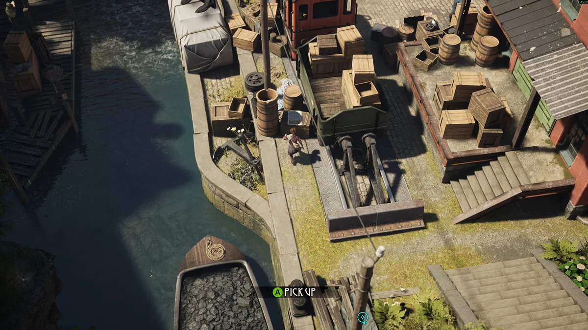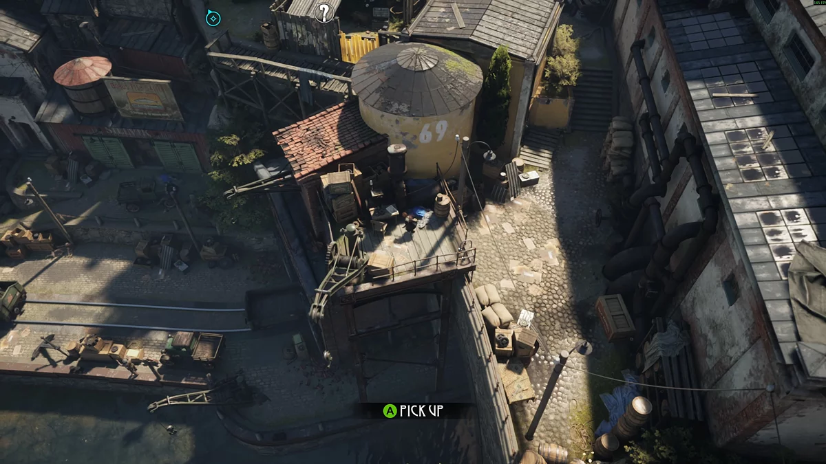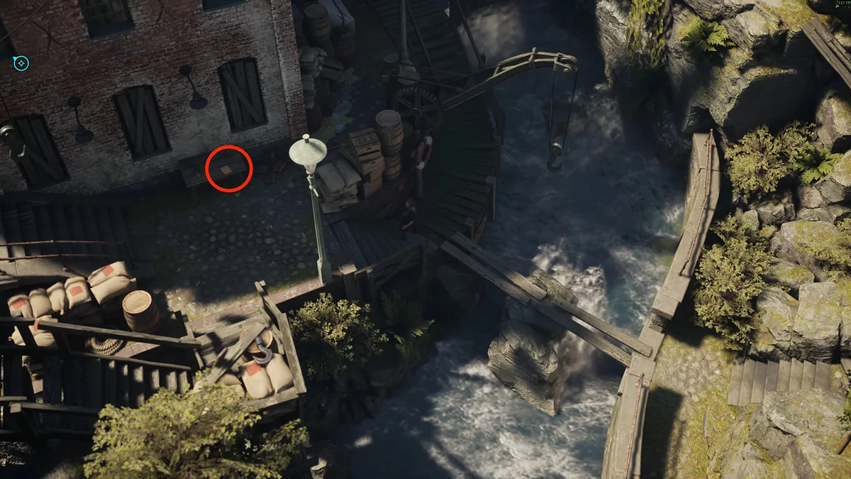 Здесь же можно спуститься вниз, к пристани. Пробегите всю пристань и вернитесь по подъему обратно в город. Не пропустите пятнадцатую записку, лежащую на ящиках справа от якоря.