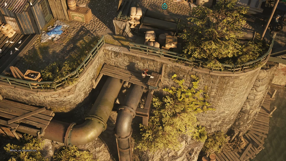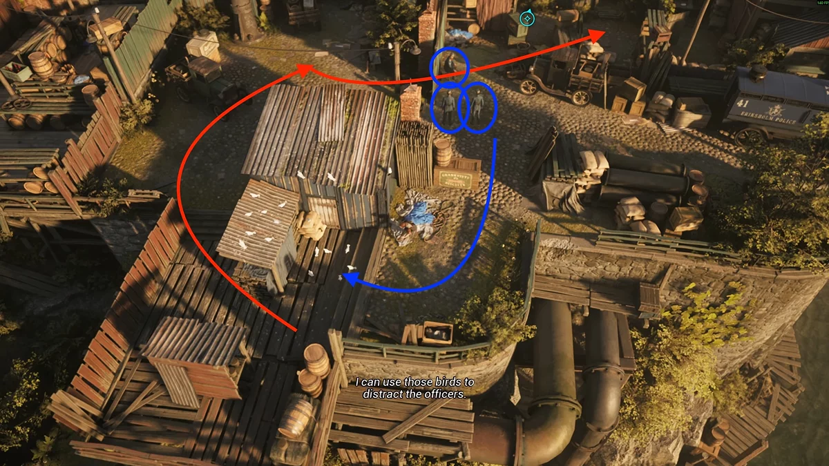 Наверху вам надо каким-то способом отвлечь всех констеблей. Сидящие рядом птицы отлично подойдут для этого.
