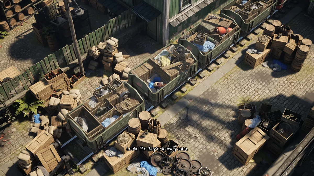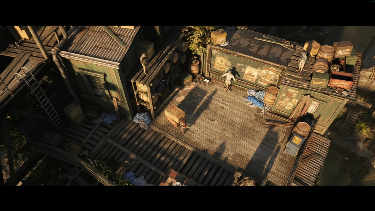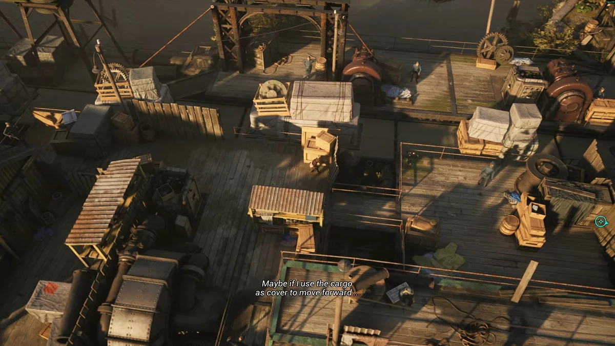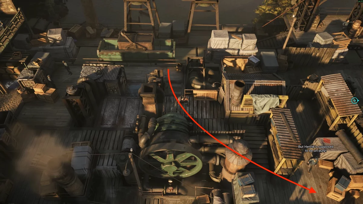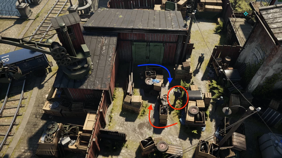 Будьте осторожны, ведь трудяга слева смотрит прямо на вас. Дождитесь, пока по рельсам проедет новый груз, который ограничит обзор врага. Это откроет путь к лестнице.