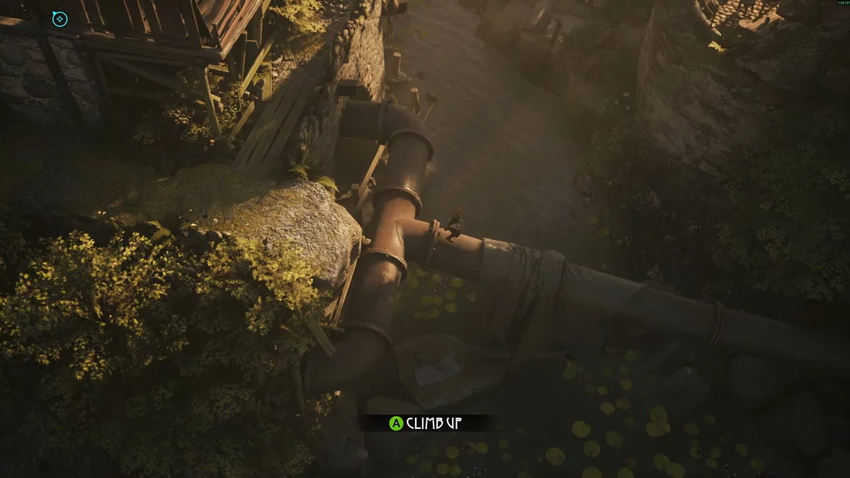 Теперь можно раскрутить вентиль, привлекая внимание полицейских. Аккуратно взберитесь по выступам и сверните направо, обходя вокруг сам механизм. В этот момент враги уйдут с дороги, поэтому вы сможете избежать неприятного столкновения и пройти дальше.