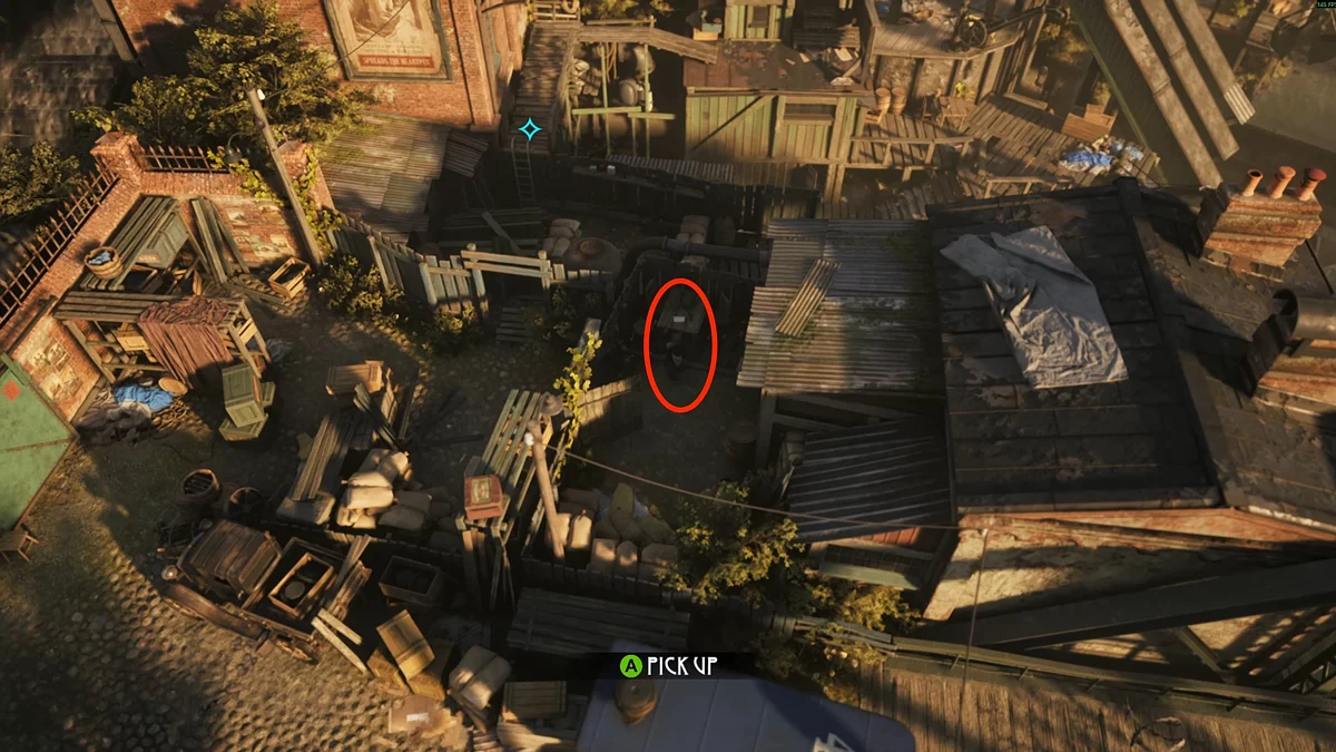 Пока полицейские сбегутся к этой стороне сарая, вы можете обойти его с другой и спрятаться среди ящиков. В правом краю этого дворика не пропустите еще одно письмо. После этого направляйтесь к синей метке.