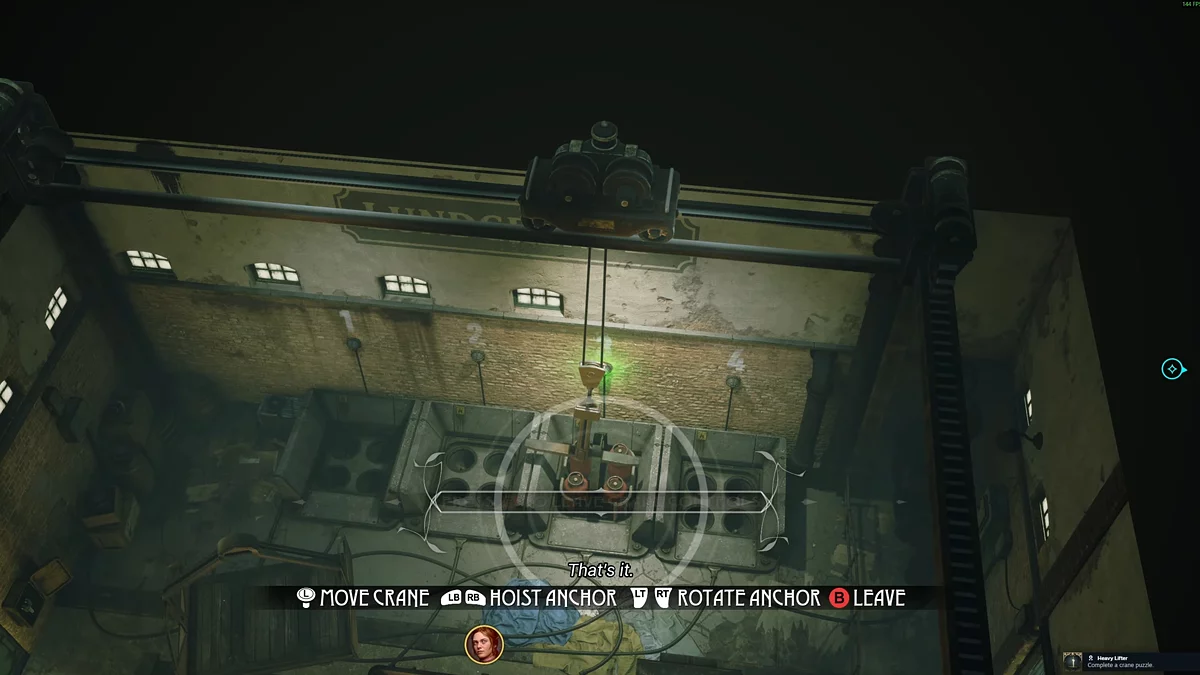 Подойдите к стойке управления краном. Вам надо зацепить груз посередине и перенести его в третью ячейку. Это не самая простая задача, ведь вам придется балансировать и долго искать идеальный угол захода. После того, как вы правильно вставите содержимое, вам выдадут соответствующее достижение.