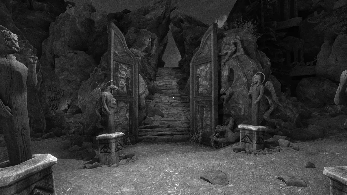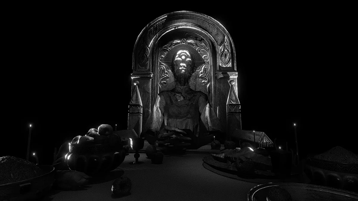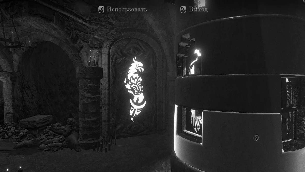 По такому же принципу сожгите ещё два идола, вернитесь, подберите серп и с его помощью откройте замок на двери.