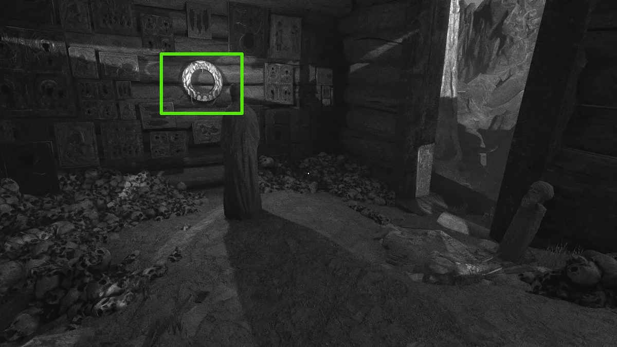 Оказавшись перед избой, идите в левую сторону и подберите ключ рядом с вороном. С его помощью откройте навесной замок и заходите в здание.