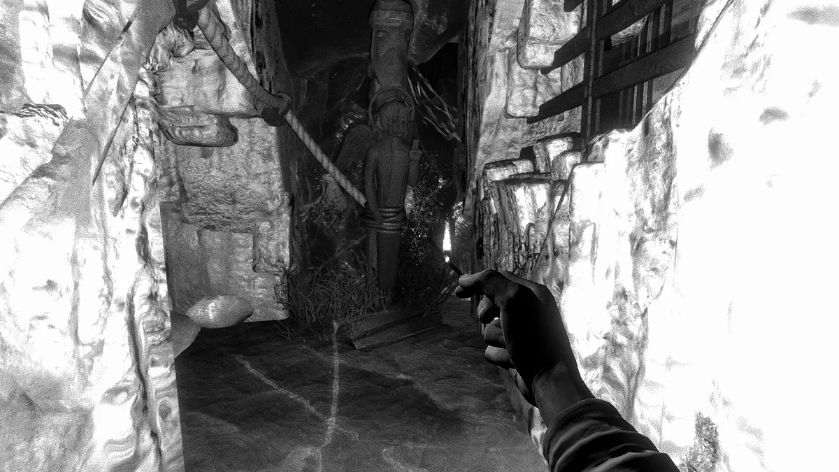 Следуйте в противоположную сторону. В воде подберите идол Птицы, затем пройдите по мелководью немного дальше и войдите в пещеру. Здесь будет запертая решётка. Открыть её можно, если подняться выше и бросить спичку в большое дерево. Оно должно упасть на другой берег, позволяя вам перебраться по нему и добраться до сундука. Однако сперва сожгите куст, который удерживает последний идол Быка.