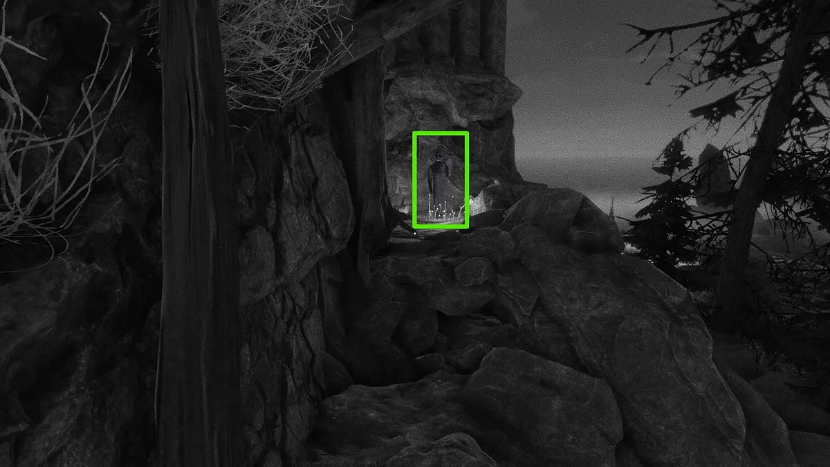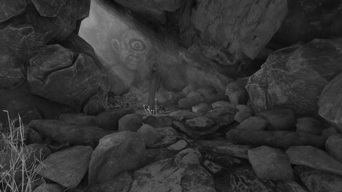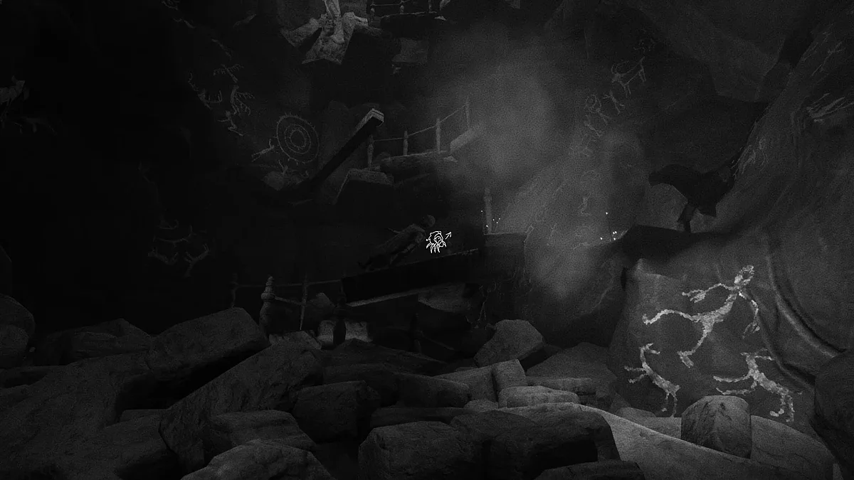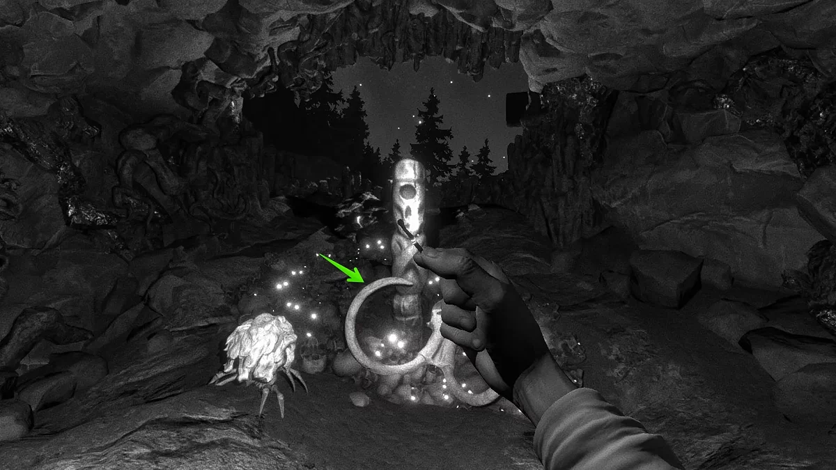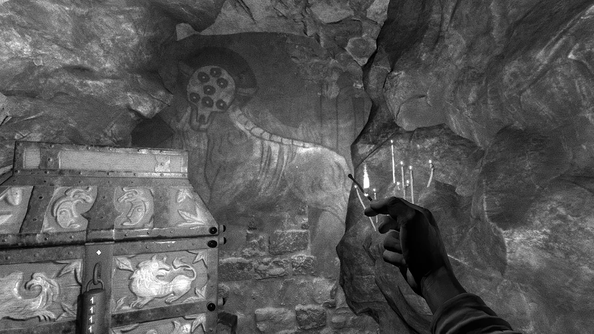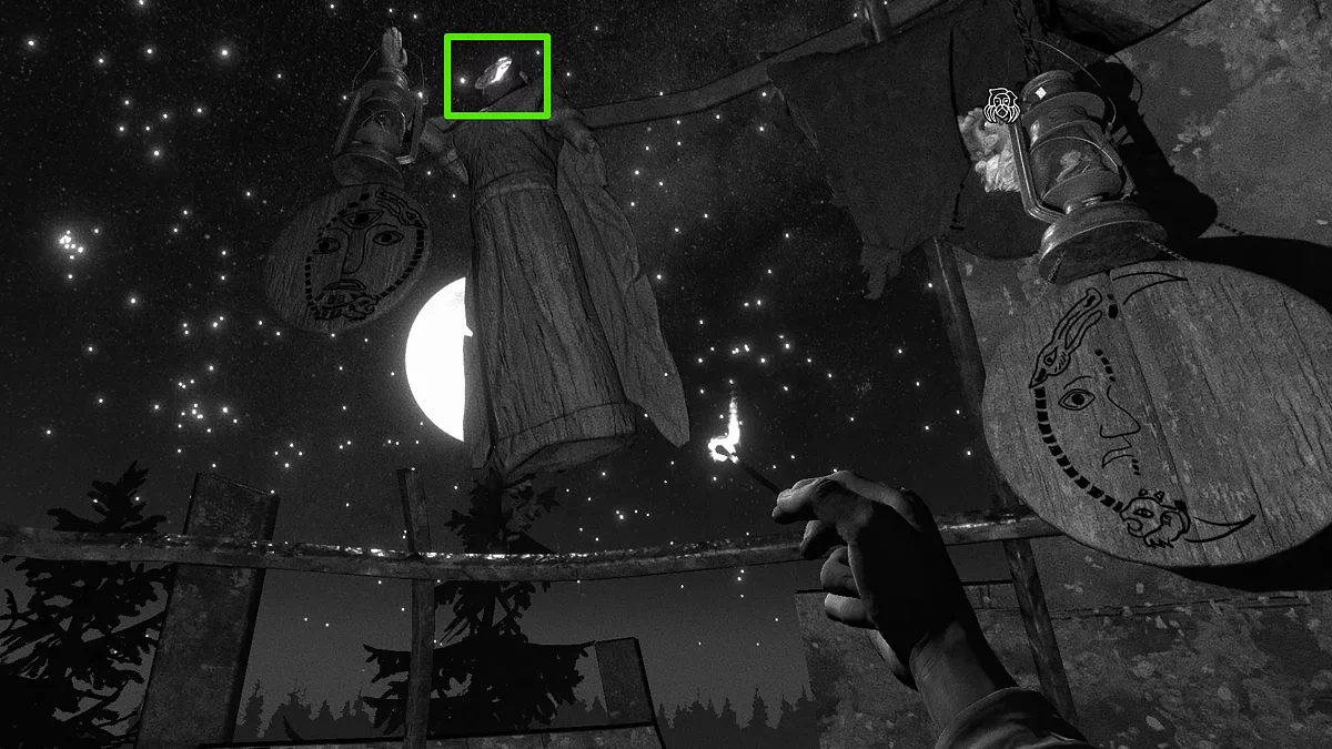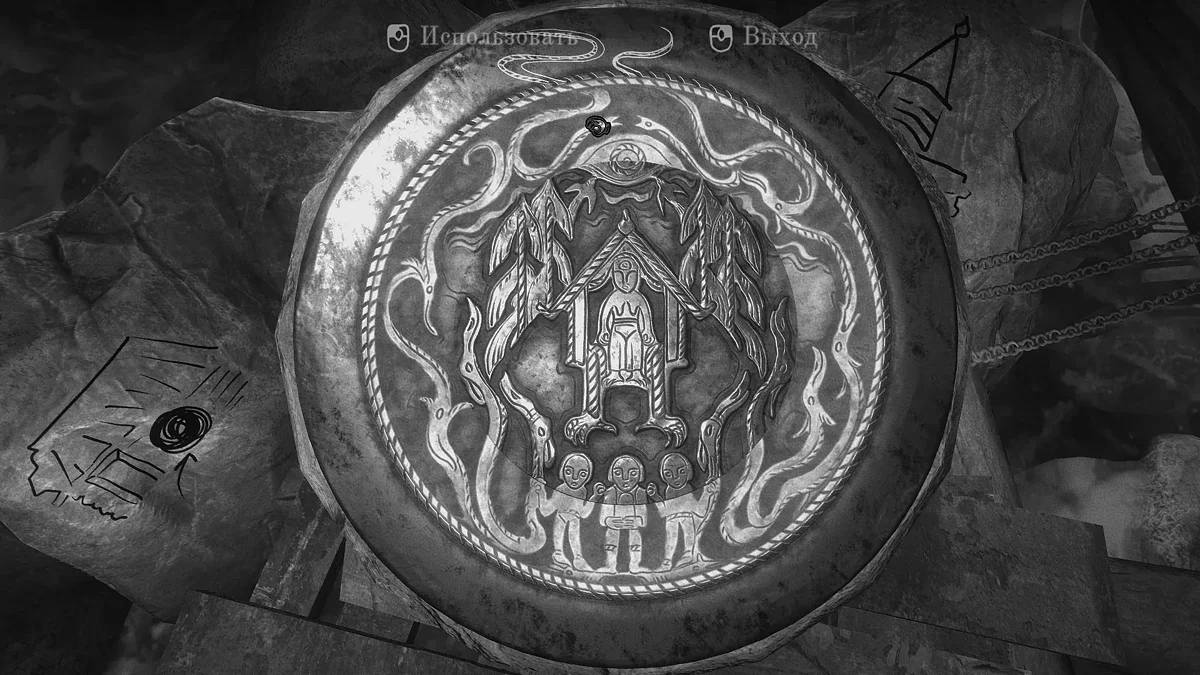 Справа прочтите заметку «Великая жертва» и осмотрите сундук немного левее. Чтобы узнать комбинацию, бросайте спички в глаза нарисованным животным. Откроется табличка с кодом — 2917. Если вы ещё не забыли о матрёшке на деревянной балке, о которой мы писали ранее, она находится по правой стороне перед обрывом. Помимо этого, ранее вы получите достижение «Одиссей» за 15 найденных историй для Книги Миров.