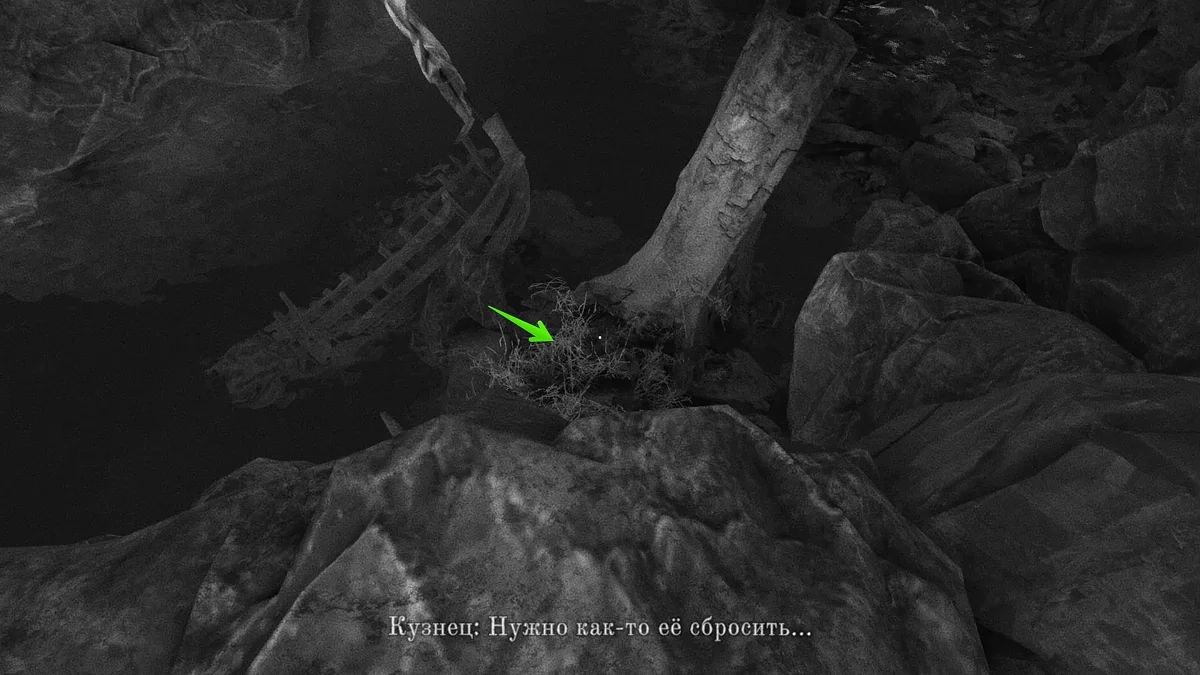 Выбравшись наружу, осмотрите лодку и пройдите налево. Немного правее от лестницы, ведущей к дому, есть заметка «Переправа». Сожгите идолы перед входом в разрушенную избу, заберите кольцо от механизма. Если вы до этого прочли все описанные заметки, то получите достижение «Ученик».