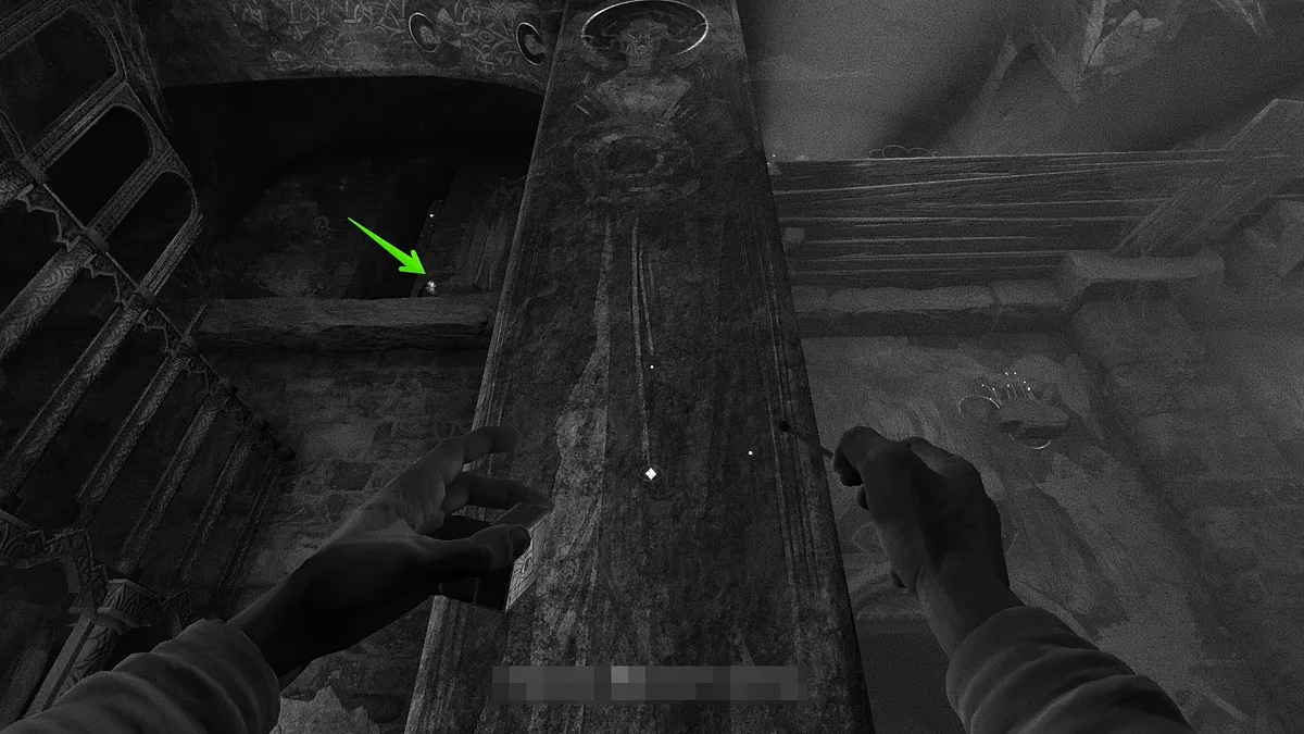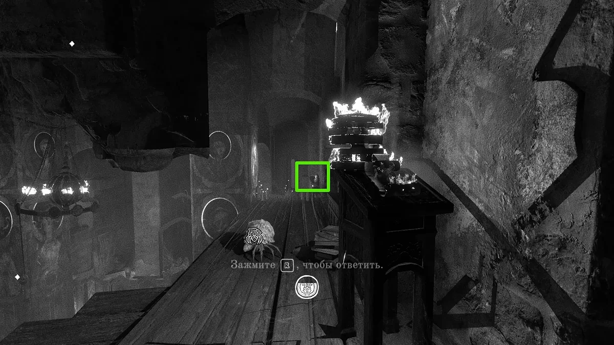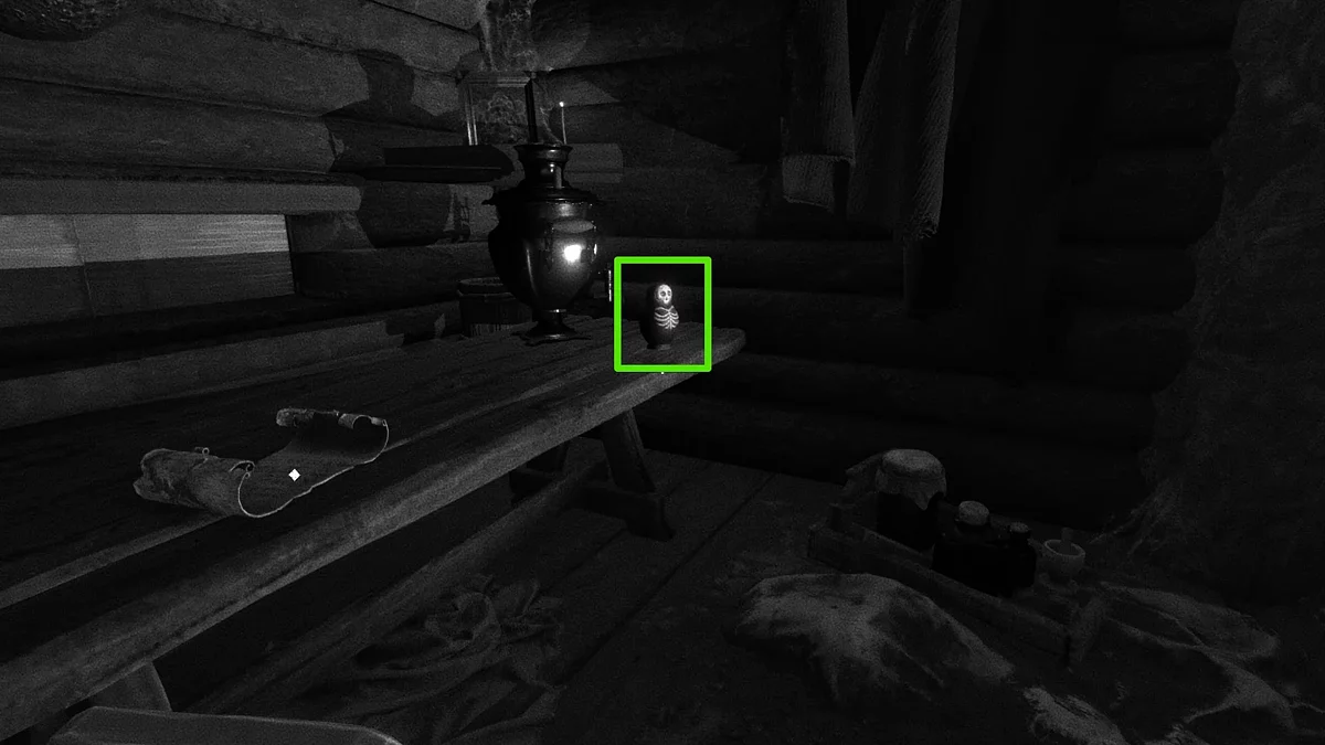 Также осмотрите основной зал и на одной из перевернутых скамеек отыщите матрёшку. Ещё один предмет для коллекции находится немного выше, на деревянной балке. Однако сейчас тренировать меткость не стоит, так как немного позже по сюжету вы сможете забраться туда и без особых проблем сжечь матрёшку. Главное — не забыть об этом.