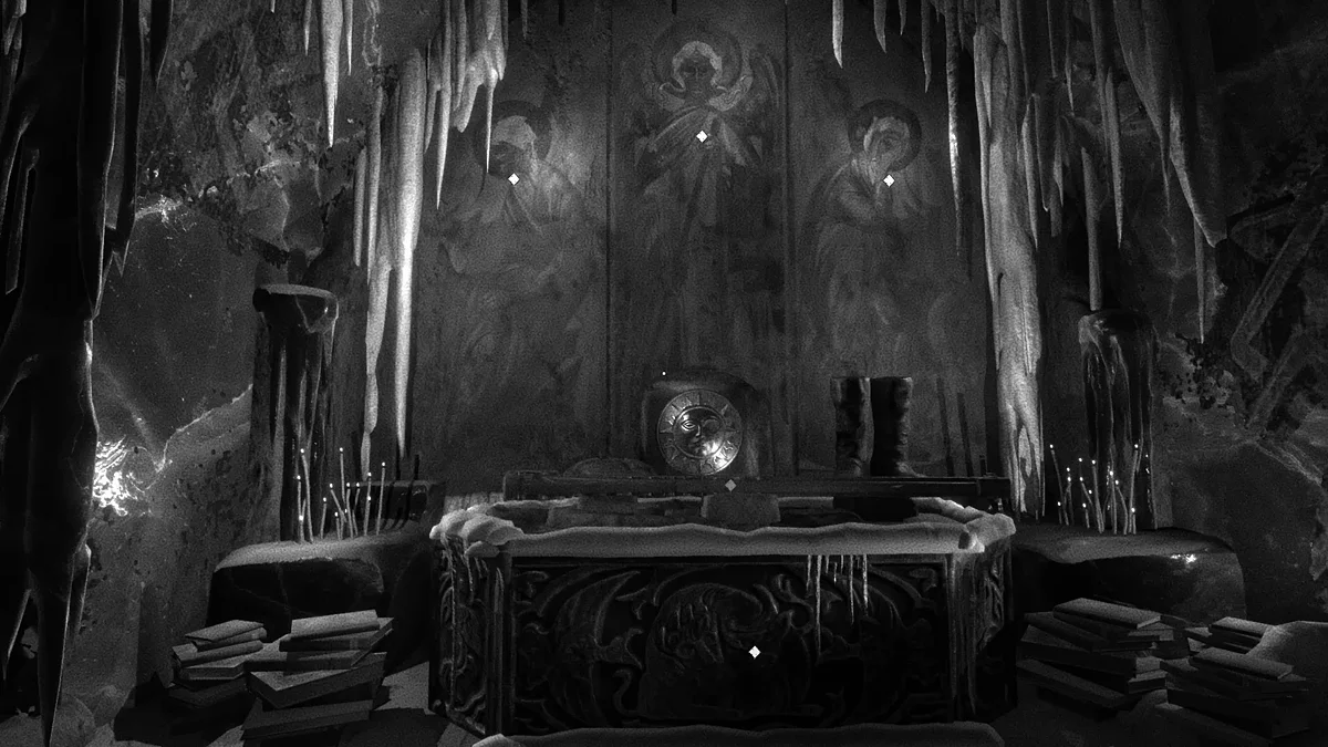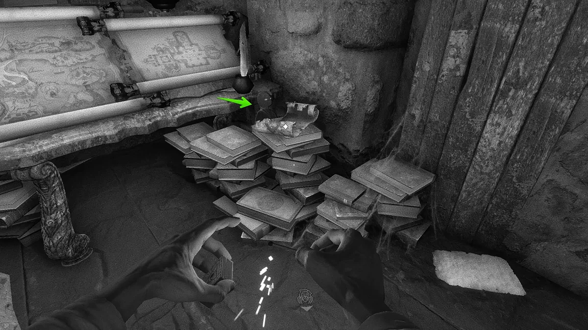 - Следуйте в комнату с противоположной стороны (дверь также между двух статуй). Прочтите заметку «Древний обряд» и сожгите рукопись вместе с книгами. Справа также есть книги — под ними находится первая часть оклада.