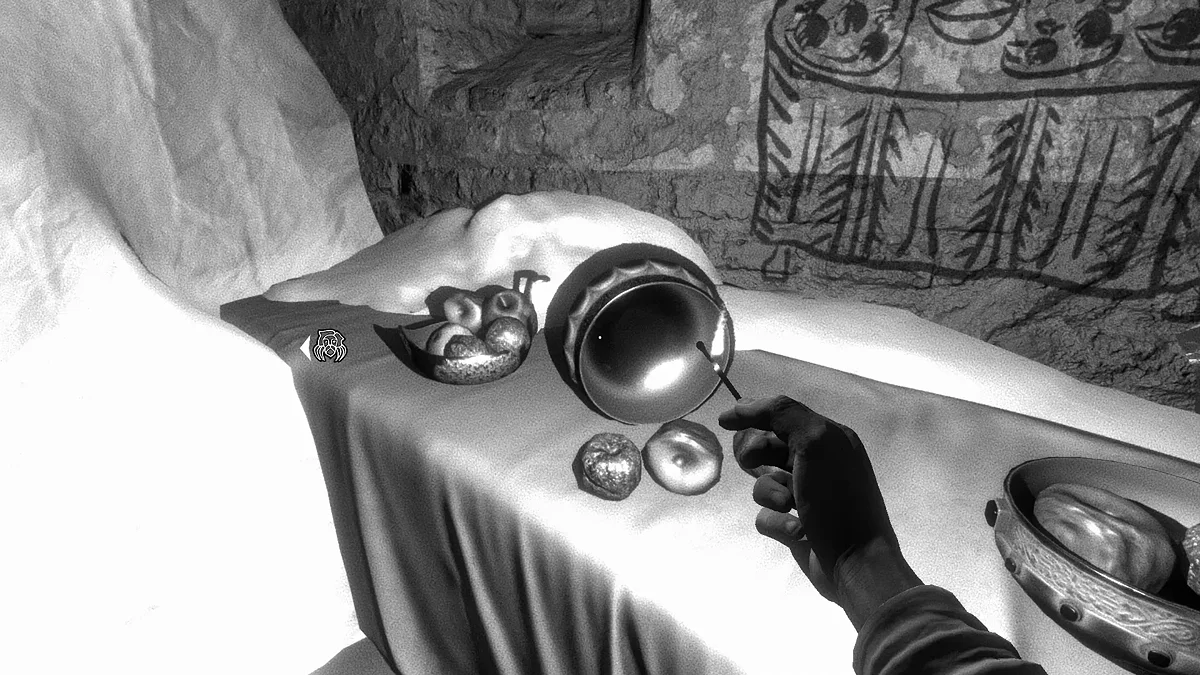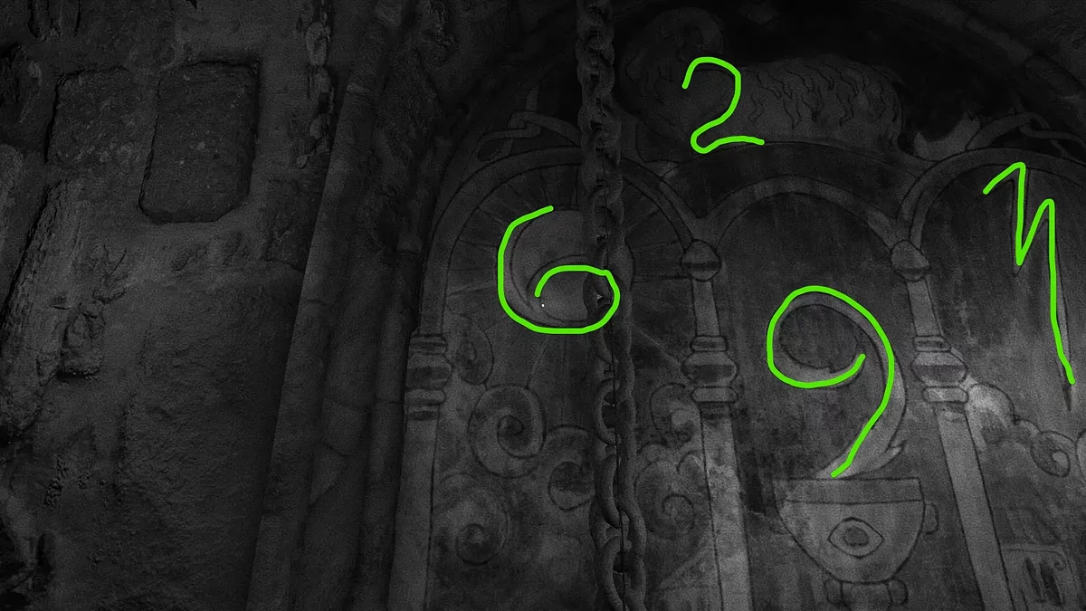 Следуйте в противоположную сторону, вставьте жезл в механизм и откройте решётку. Здесь будет ждать сундук. На этот раз загадка будет посложнее предыдущих, нужно сложить все яблоки, находящиеся в чашах, как на столе, так и на изображении на стене. Код — 8045.