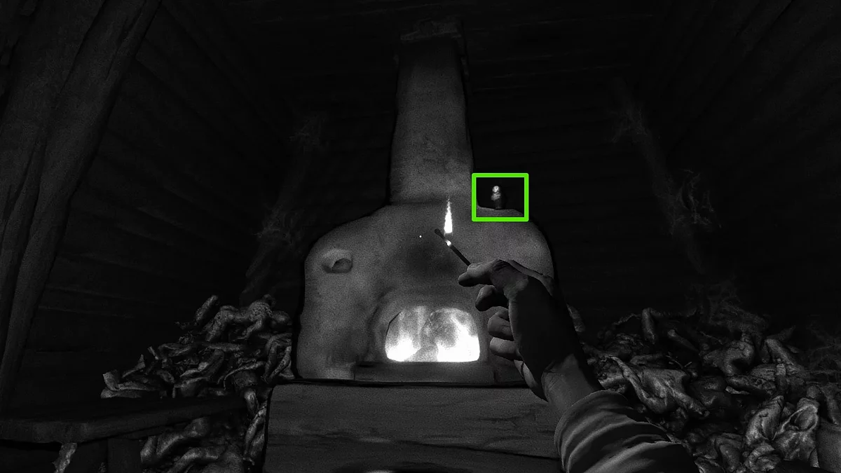 Поднимайтесь по лестнице и посмотрите сцену с Портным, во время которой вам нужно быстро нажимать на клавишу действия, чтобы открыть решётку. В этой же комнате, где вы видели приятеля, есть много предметов для сожжения, а также одна матрёшка — она стоит на печи.