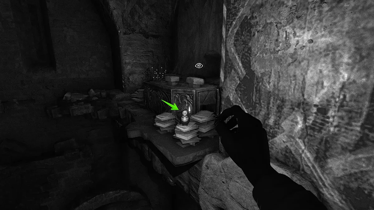 Первый коллекционный предмет будет ждать в комнате за решёткой — Одноглазый череп. Достаточно просто осмотреть его, чтобы вариант появился в обсуждении в столовой. Здесь же прочтите заметку «Бегство».