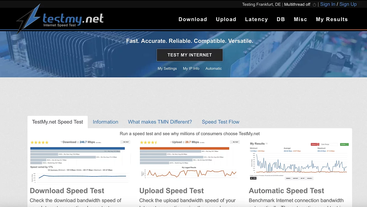 Открыв этот сайт, на его верху согласитесь с использованием cookies, иначе портал не будет работать. Эта утилита потратит больше времени на сбор данных, чем предыдущие варианты, поэтому ее средние значения будут ближе к действительности. Из других плюсов: вы можете поделиться своим результатом или сравнить его с предыдущими своими показателями на крайней правой вкладке. Пользуйтесь тестом, нажав сюда.