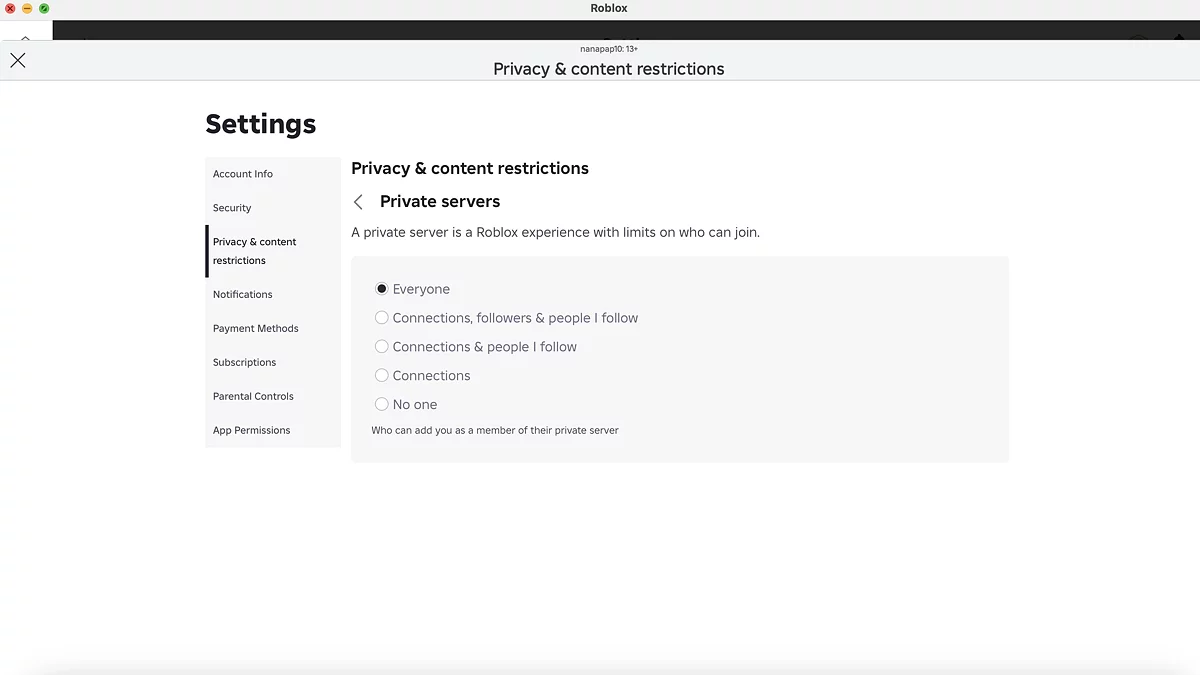В настройках Roblox есть отдельный пункт, посвященный подключениям к чужим играм. В разделе «Конфиденциальность и ограничения контента» перейдите к сегменту «Приватные сервера». Там вы можете выбрать, у кого есть право добавлять вас в миры. Установите самое верхнее значение, дающее соответствующее разрешение любому пользователю