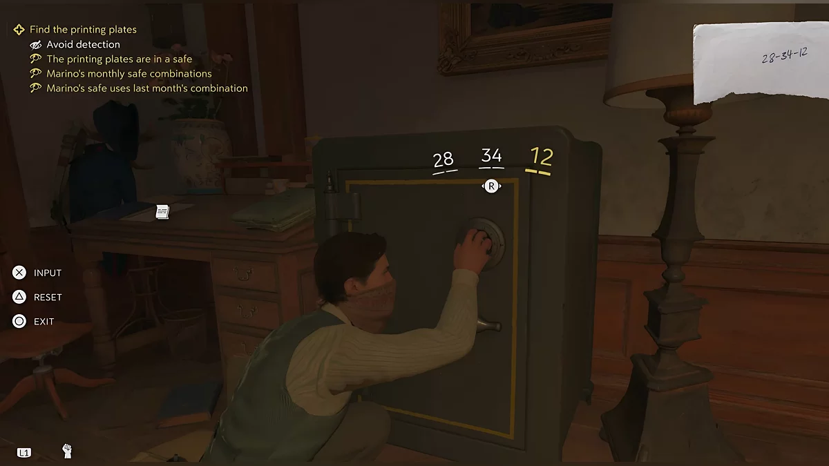 Этот сейф вам придётся открыть по сюжету. На столе лежат «Ежемесячные напоминания», где находится код — 02-19-62. Таким образом вы сможете забрать печатные пластины Джузеппе и 300 динаров.