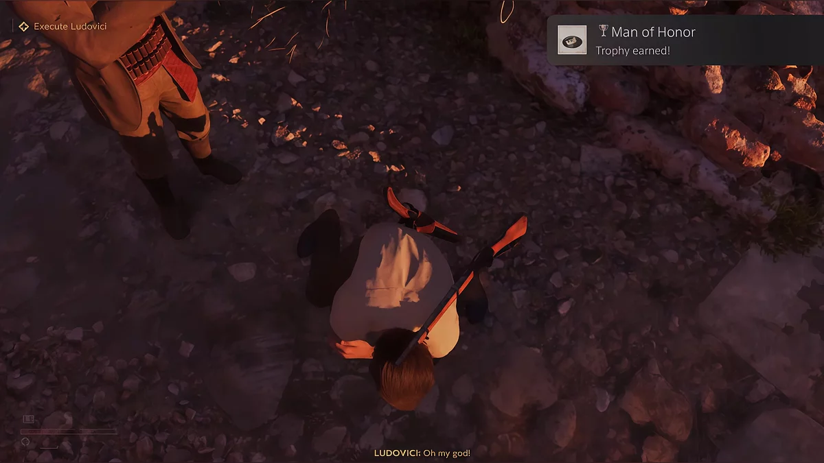 Во время прохождения 5-й главы под названием «Вендетта чести» (Vendetta D'Onore) вам нужно убить Джироламо Лудовичи. Это владелец серной шахты, на которой работал Энцо в самом начале сюжетного режима Mafia: The Old Country. Мужчину приведут на нужное место, после чего главному герою прикажут пустить ему пулю в лоб. Если вы не выполните распоряжение босса, опустите оружие или просто будете ждать, Тино Руссо застрелит протагониста игры. Вы вернётесь к предыдущему чекпоинту, но успеете получить достижение «Человек чести» (Man of Honor). А убить Лудовичи всё-таки придётся, ведь без этого действия продолжить прохождение не получится.