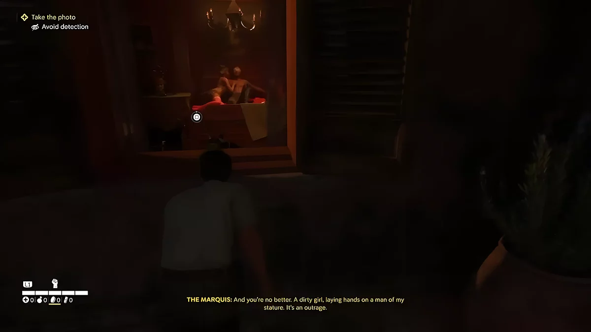 Подойдите к игровой метке, оставшись незамеченным. Аккуратно запечатлите происходящее за окном.