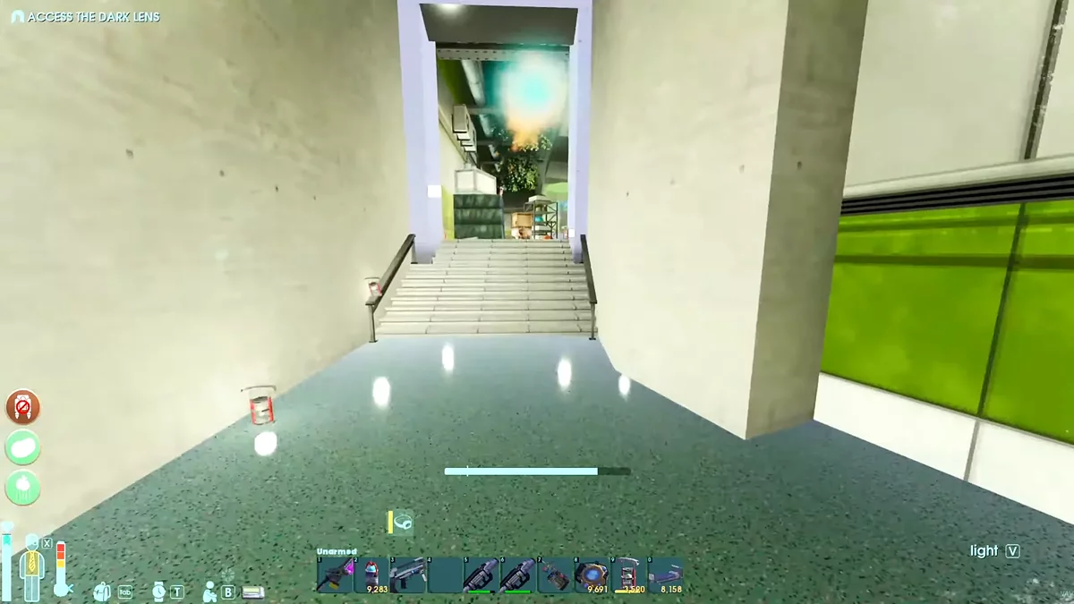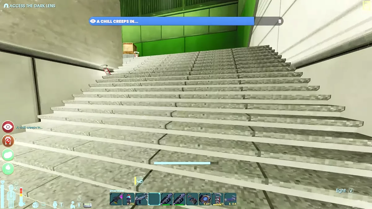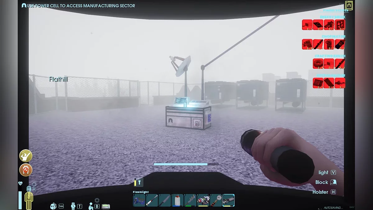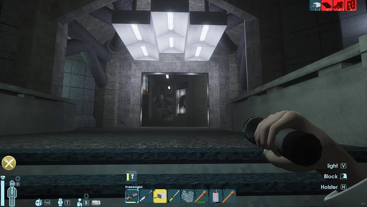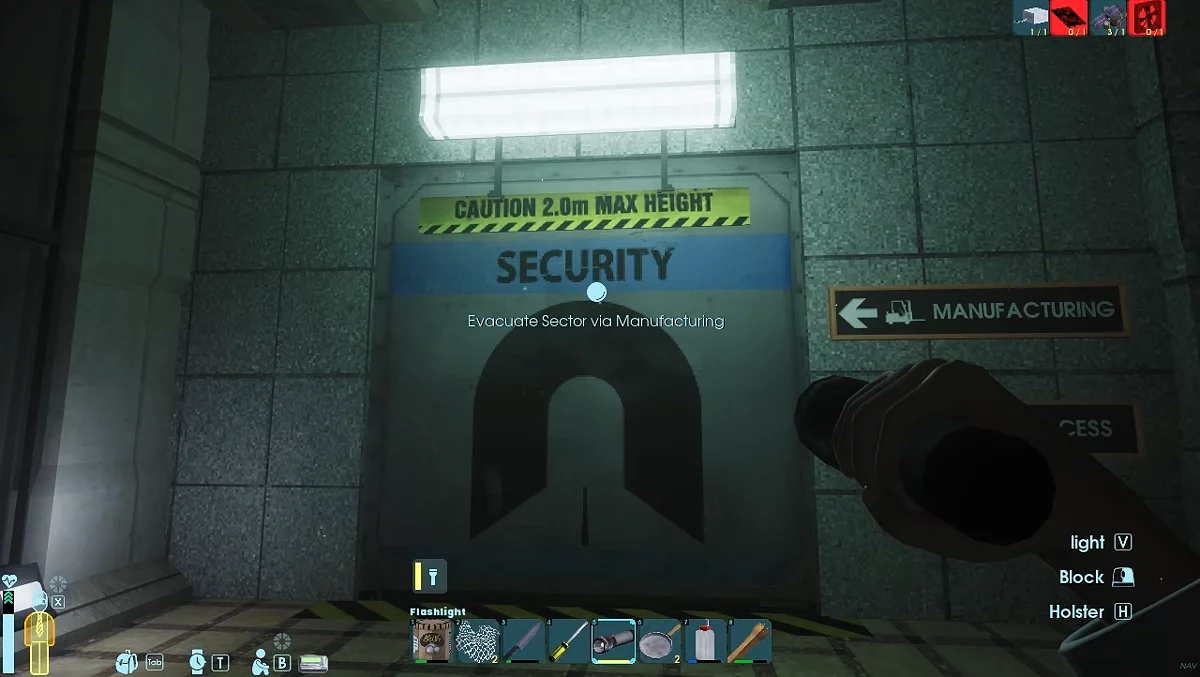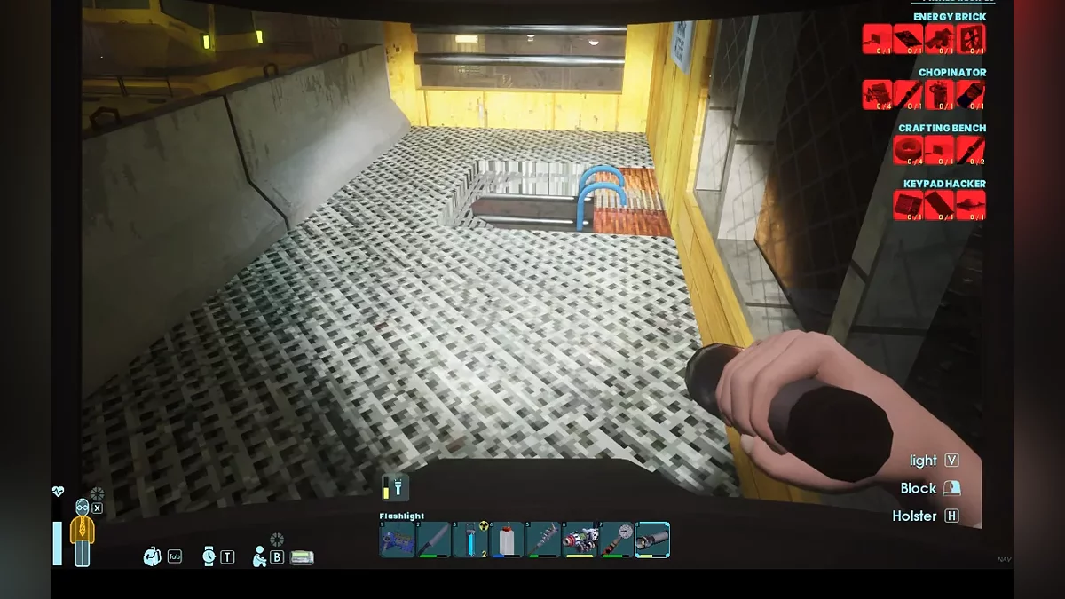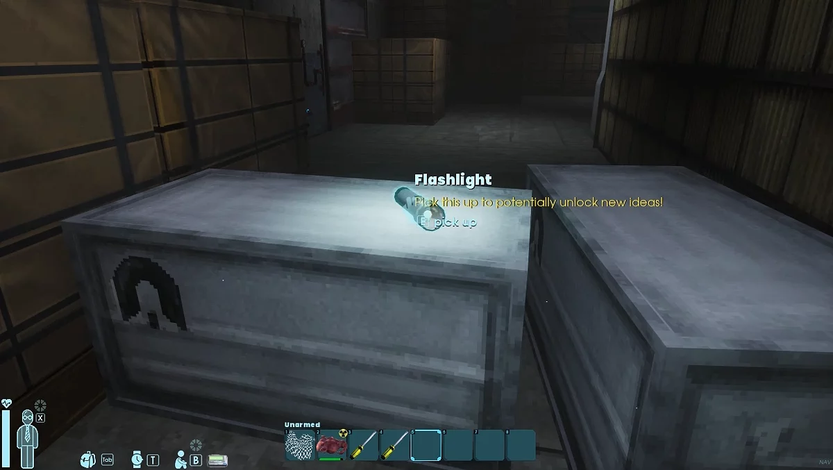 Пройдите через дверь справа от лифта. Спустившись, через лестницу попадите в закрытый отсек и заберите слева фонарик. Кроме того, тут вы узнаете об интересной механике переработки и разрушения объектов.