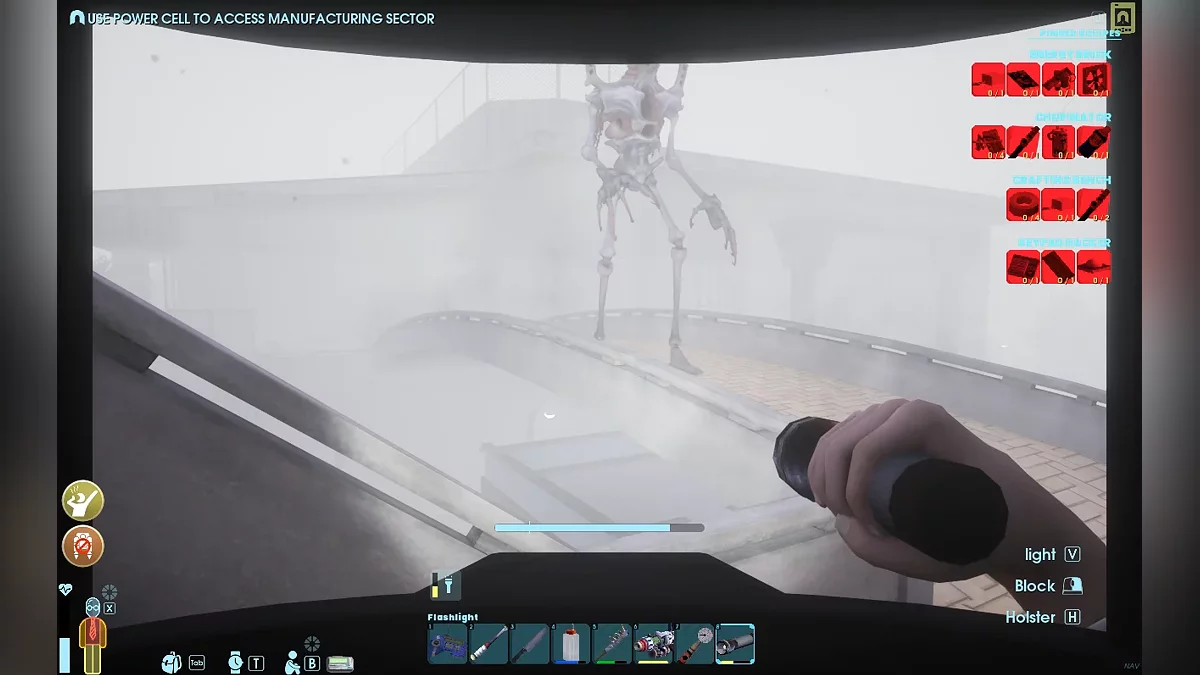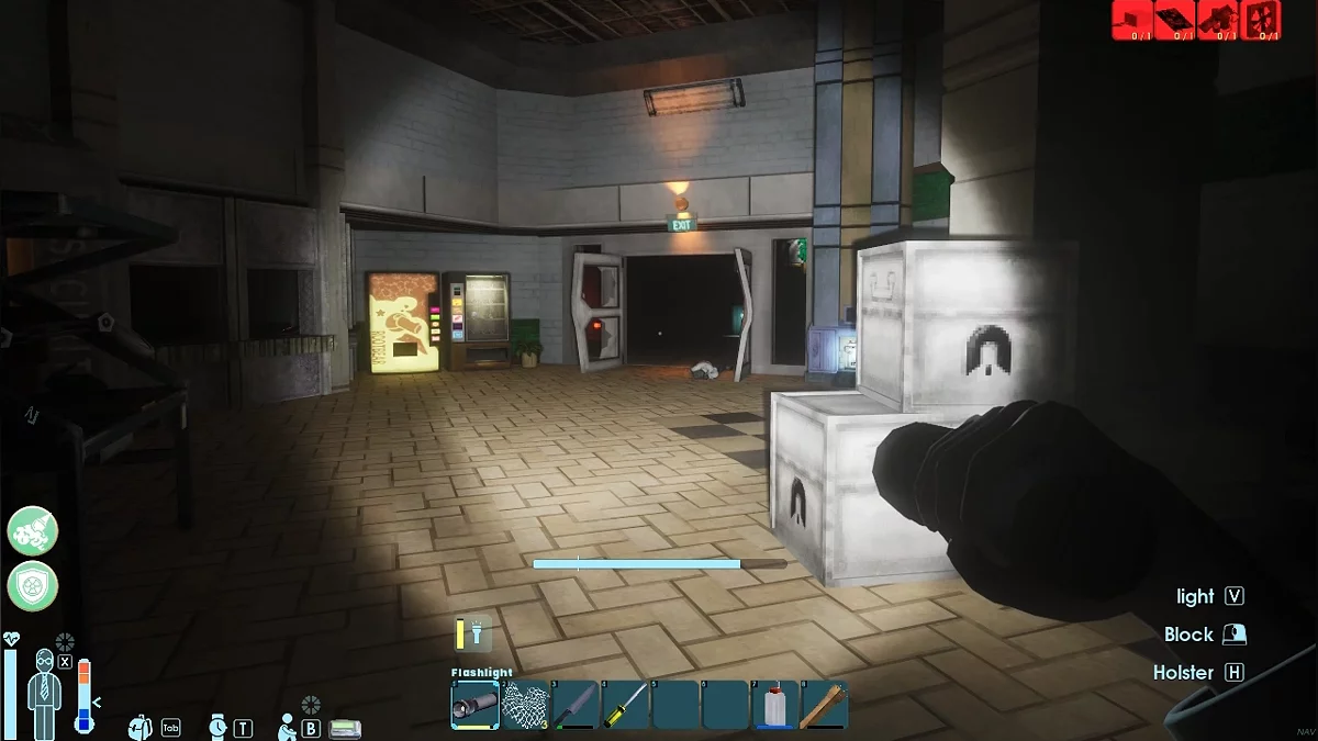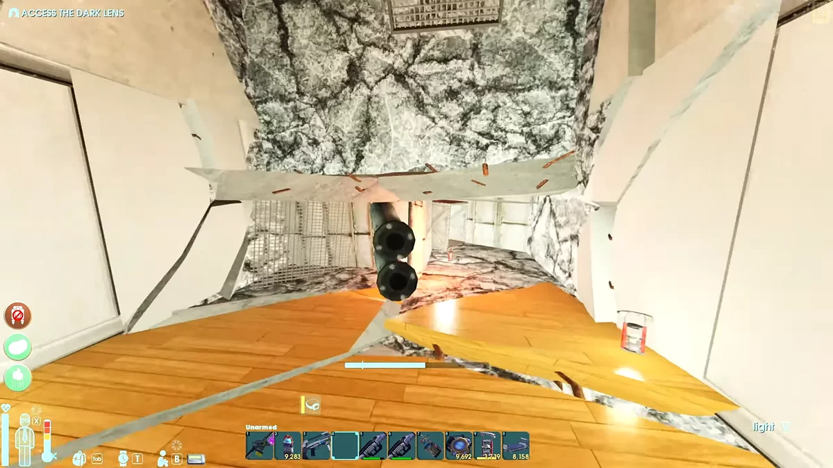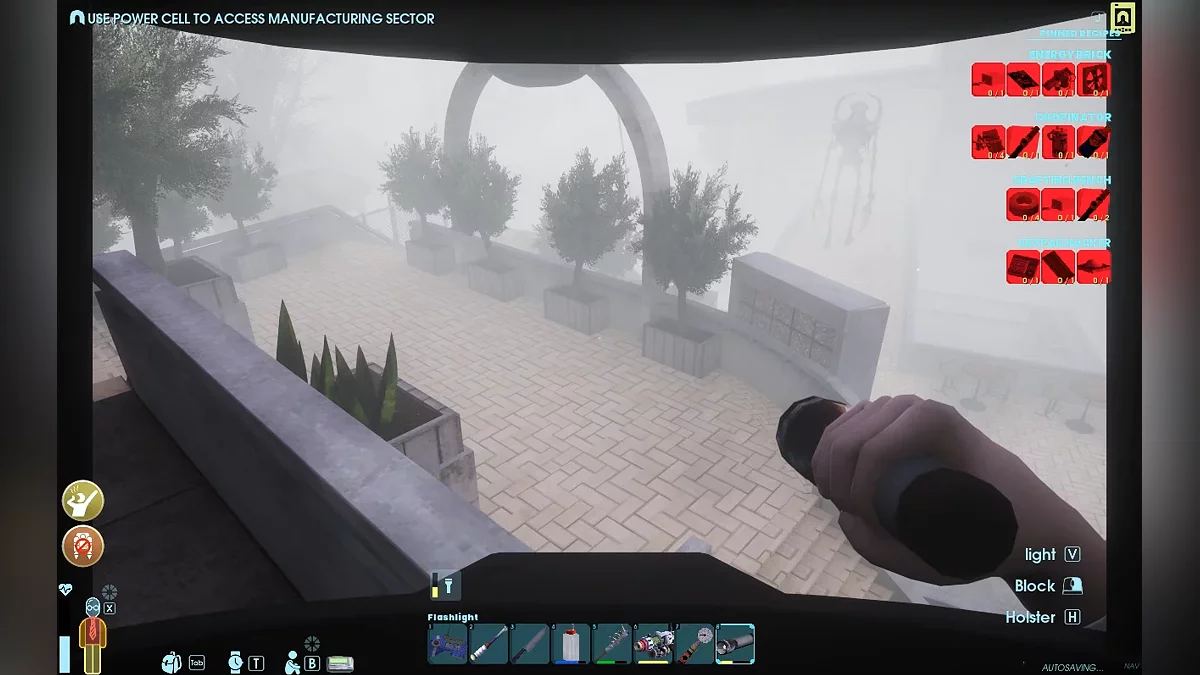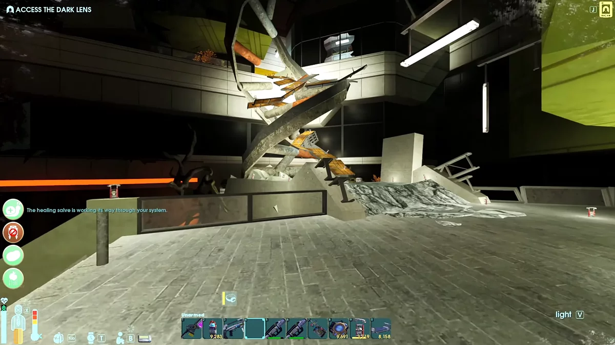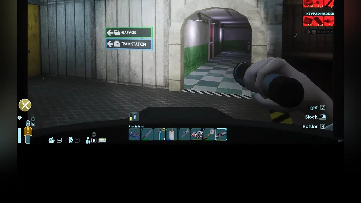 Пройдите через дверь справа от лифта. Спустившись, через лестницу попадите в закрытый отсек и заберите слева фонарик. Кроме того, тут вы узнаете об интересной механике переработки и разрушения объектов.