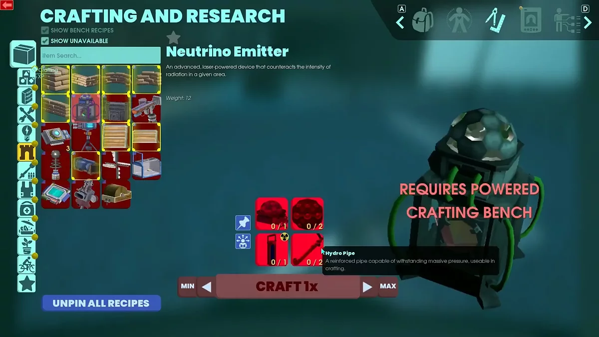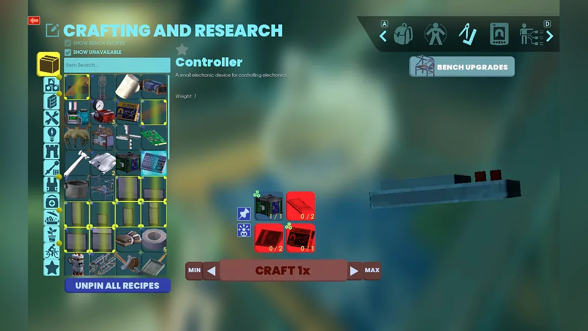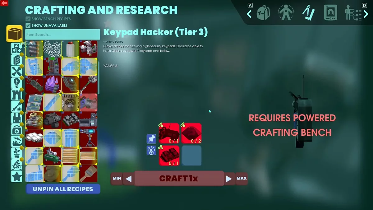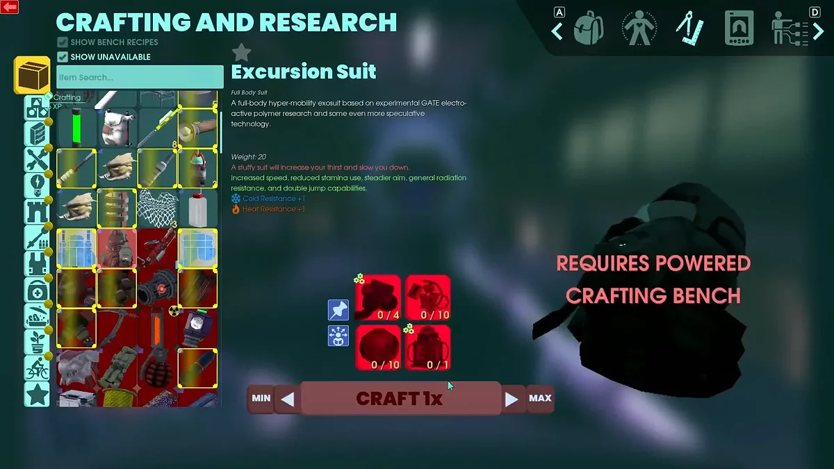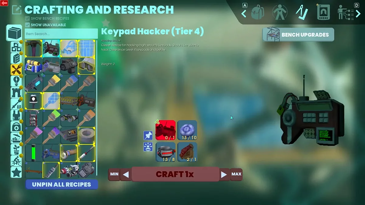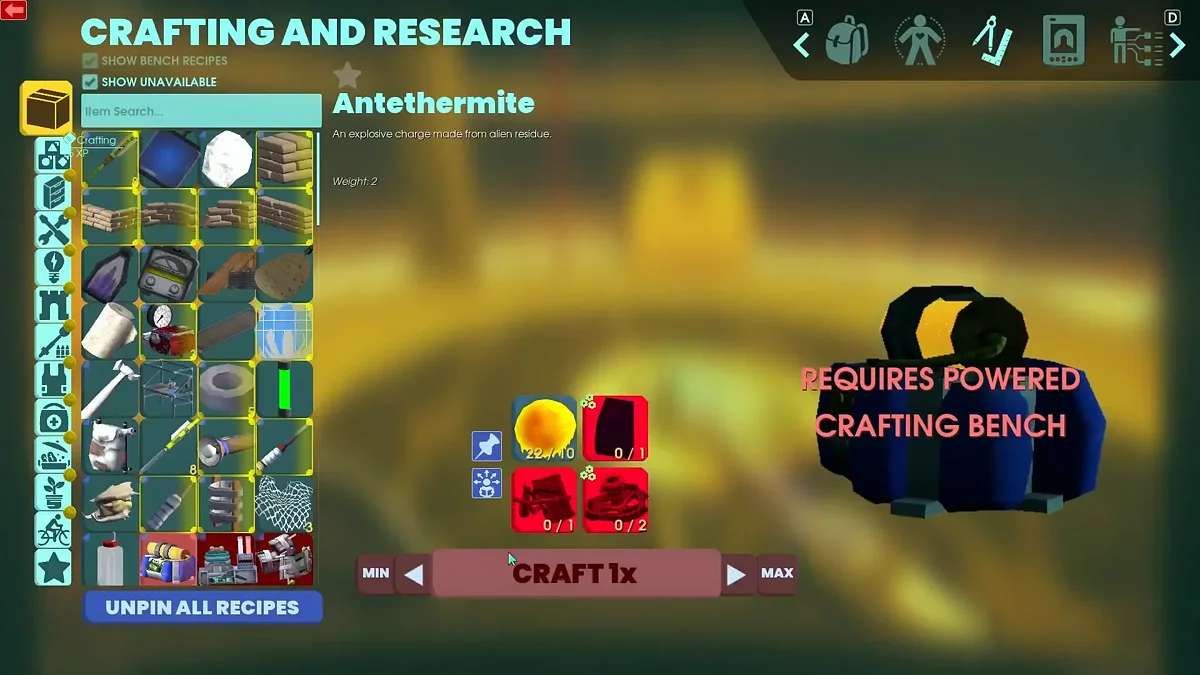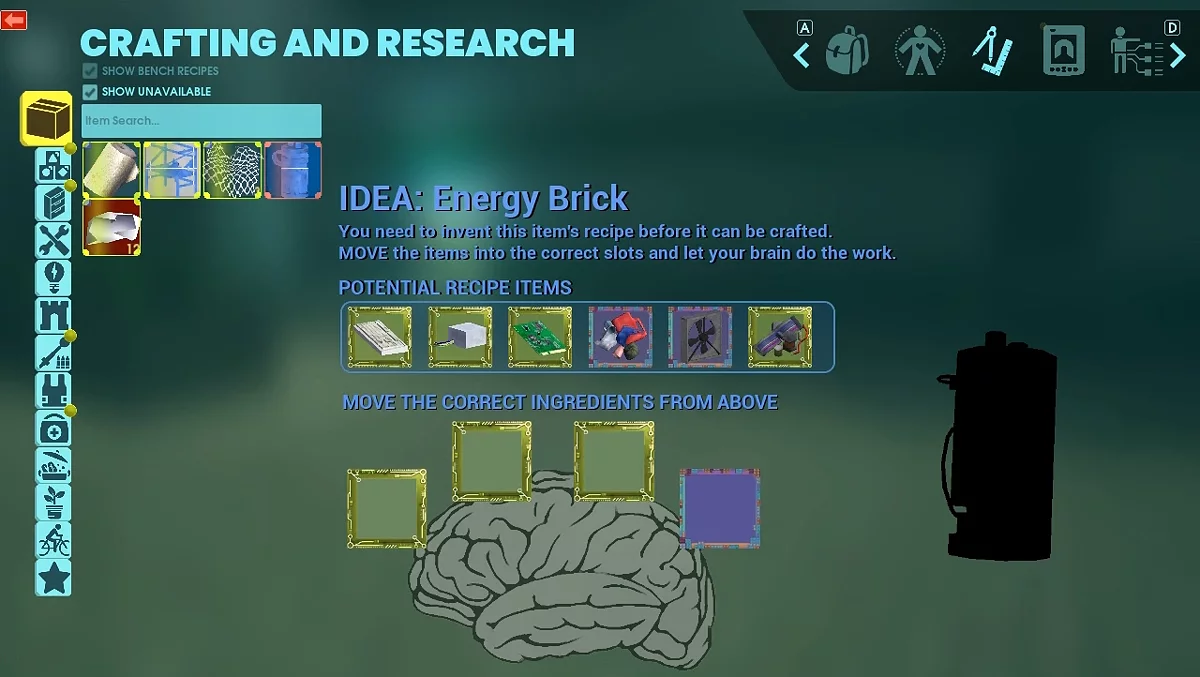 Еще одна важная механика игры — это изучение чертежей. В этом нет ничего сложного, вам просто надо подобрать подходящие детали и объединить их, используя небольшую подсказку в виде характеристик материала. Abiotic Factor не накажет вас за ошибку и укажет, какие ресурсы надо заменить. Когда все элементы будут верны, рецепт станет доступен для использования.