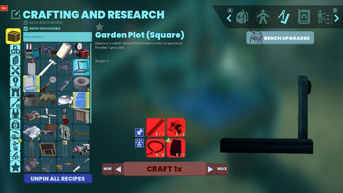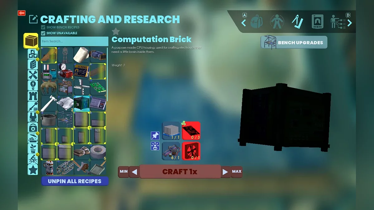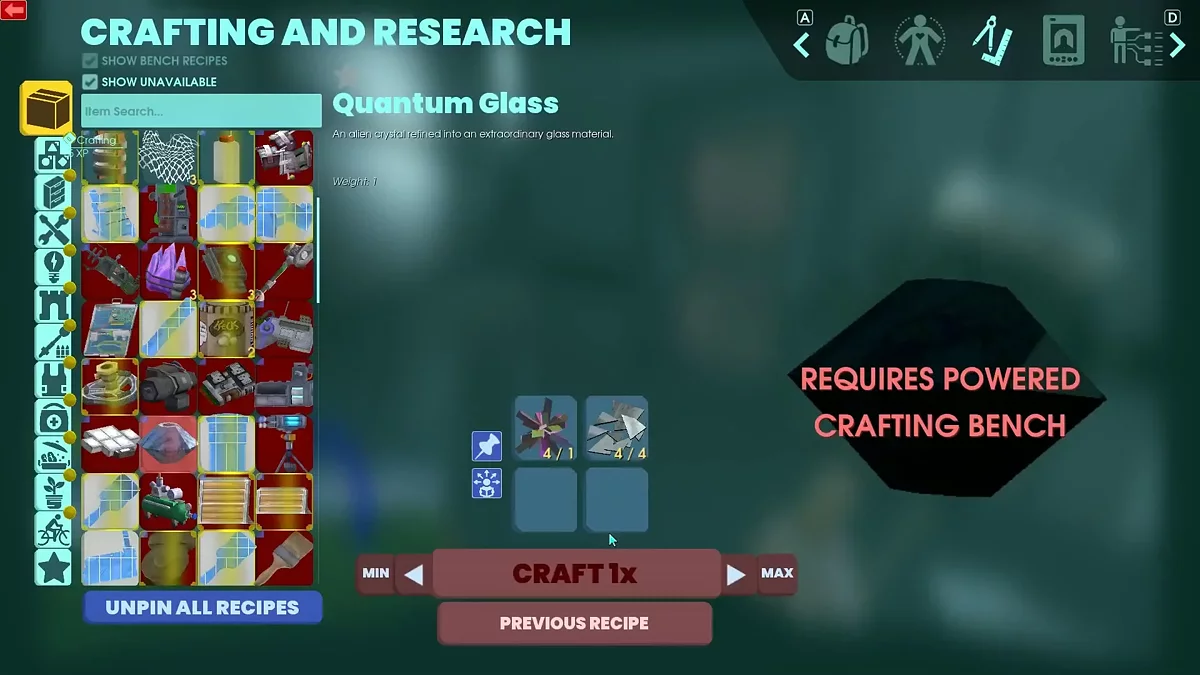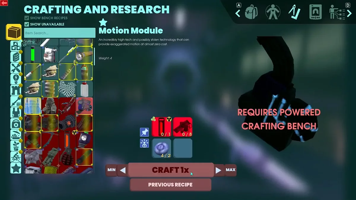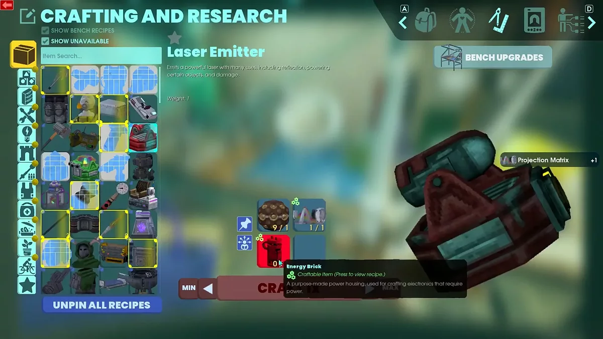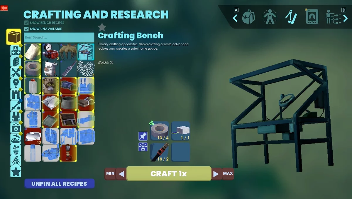 Еще одна важная механика игры — это изучение чертежей. В этом нет ничего сложного, вам просто надо подобрать подходящие детали и объединить их, используя небольшую подсказку в виде характеристик материала. Abiotic Factor не накажет вас за ошибку и укажет, какие ресурсы надо заменить. Когда все элементы будут верны, рецепт станет доступен для использования.