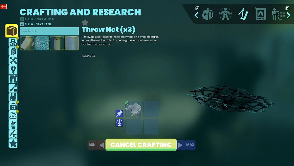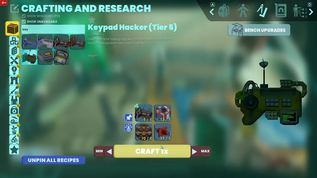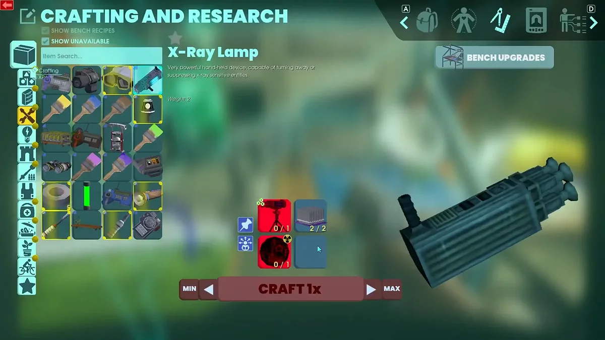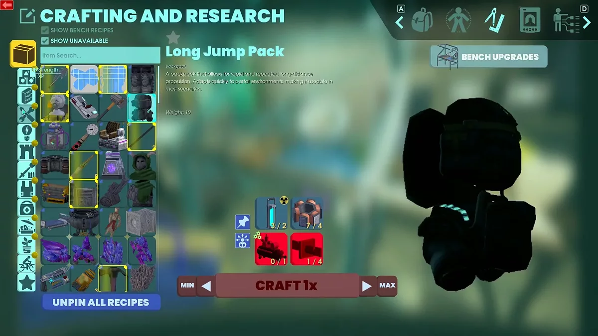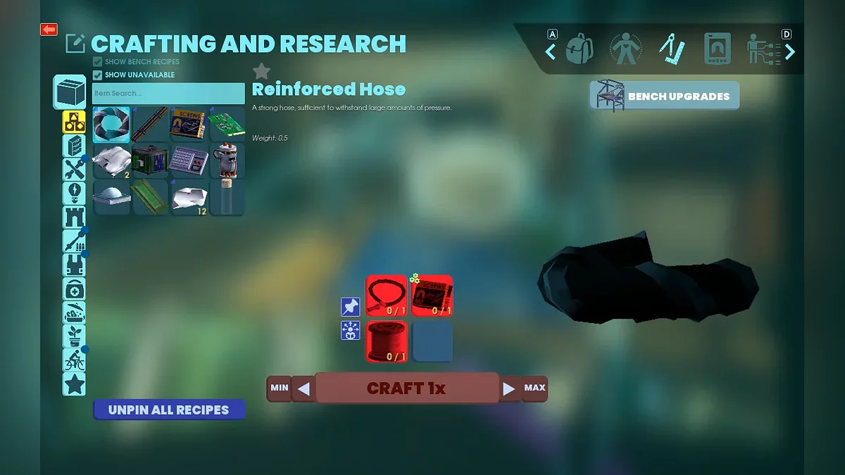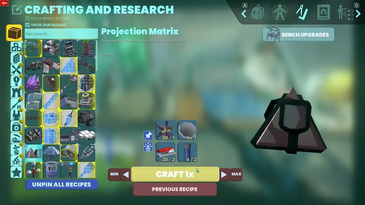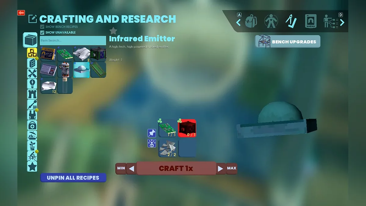 Еще одна важная механика игры — это изучение чертежей. В этом нет ничего сложного, вам просто надо подобрать подходящие детали и объединить их, используя небольшую подсказку в виде характеристик материала. Abiotic Factor не накажет вас за ошибку и укажет, какие ресурсы надо заменить. Когда все элементы будут верны, рецепт станет доступен для использования.