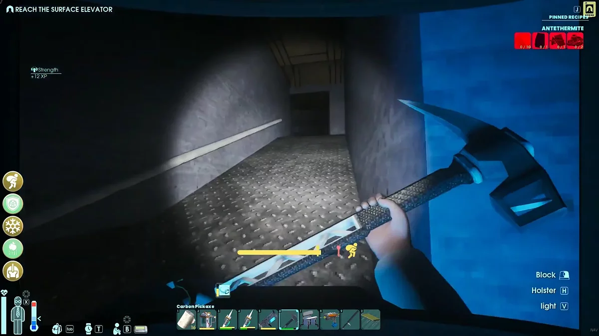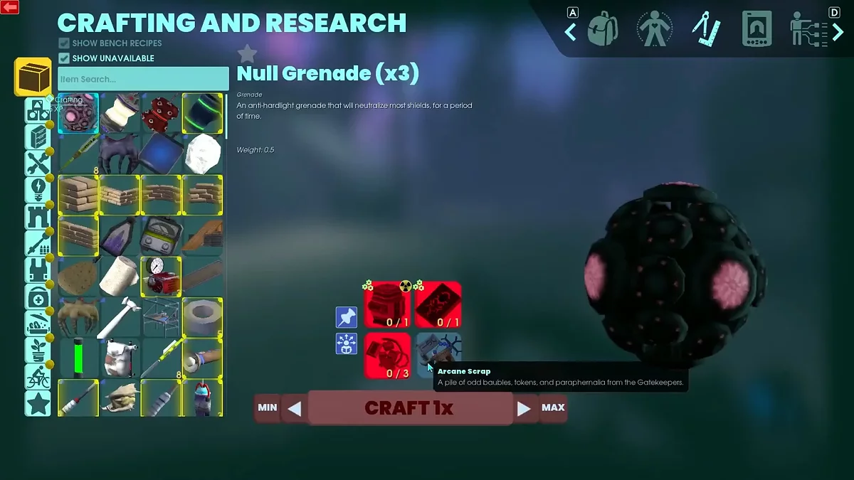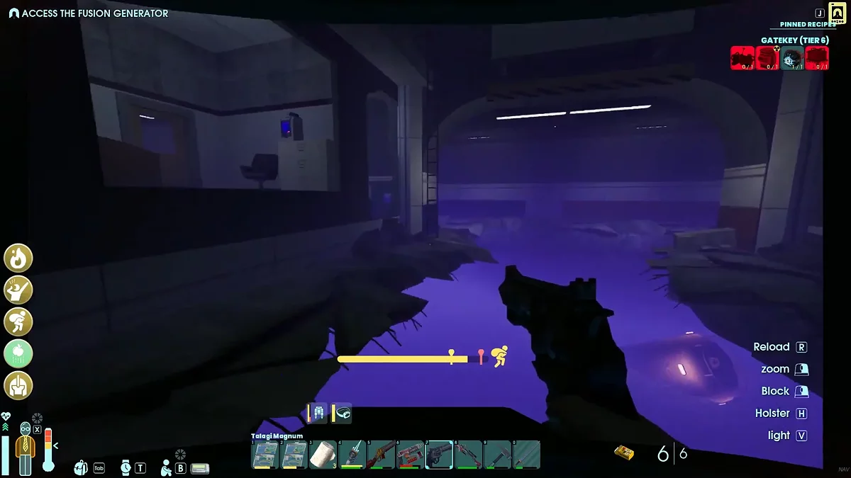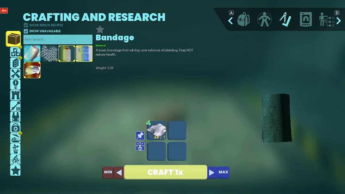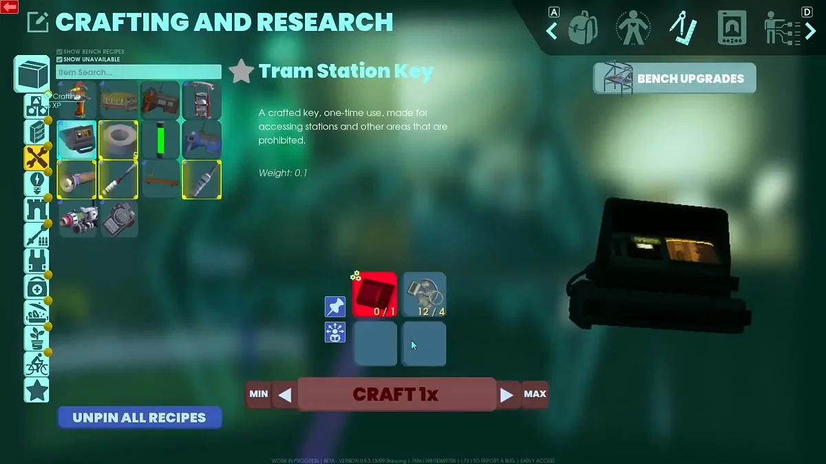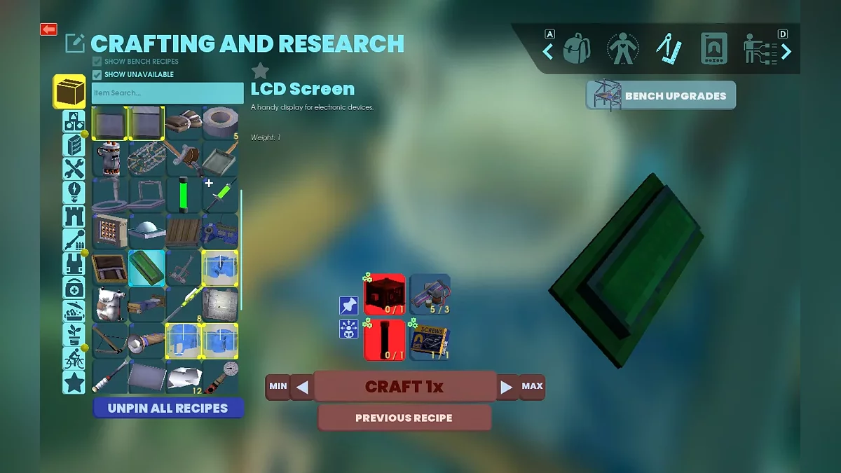 Еще одна важная механика игры — это изучение чертежей. В этом нет ничего сложного, вам просто надо подобрать подходящие детали и объединить их, используя небольшую подсказку в виде характеристик материала. Abiotic Factor не накажет вас за ошибку и укажет, какие ресурсы надо заменить. Когда все элементы будут верны, рецепт станет доступен для использования.
