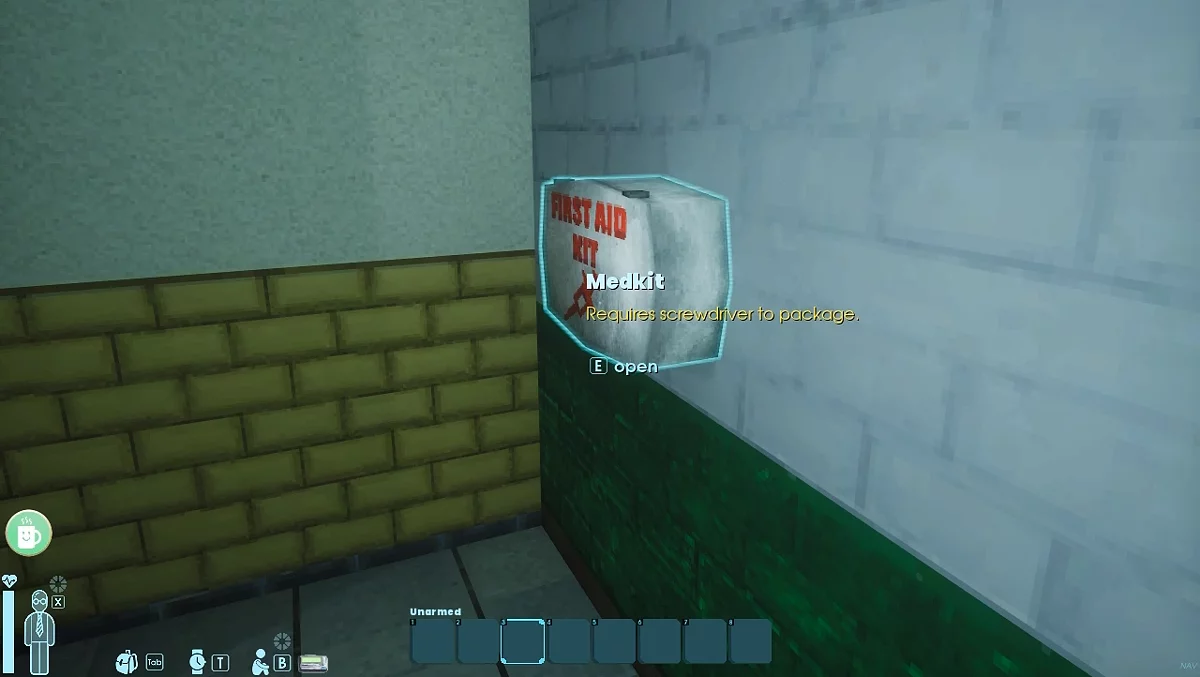 В туалете прямо перед вами найдите аптечку в правом углу. Старайтесь не проходить мимо: они разбросаны по многим локациям. Внутри могут лежать бинты, таблетки от радиации, лекарство и шину.