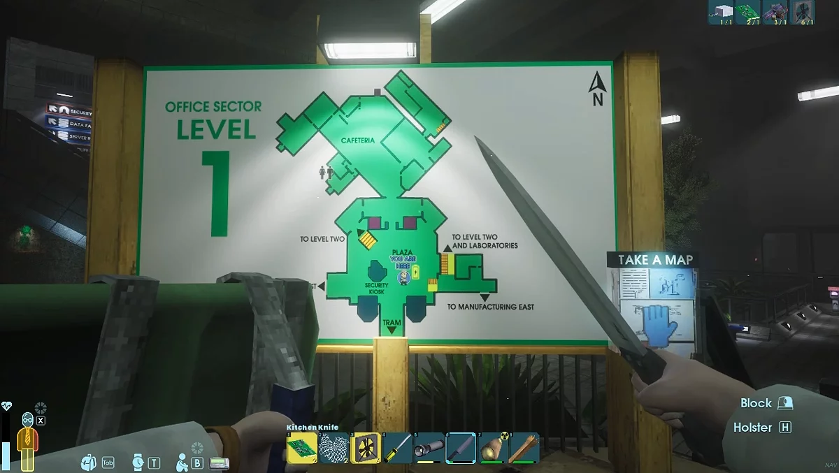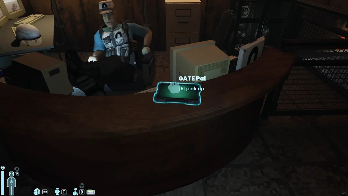 Если вернуться к стойке информации и пойти в этот раз налево, то перед проходом в офисы не пропустите небольшое складское помещение. Там спрятался местный работник, а также лежат улучшенный рюкзак и небольшие запасы вечно нужных степлеров и телефонов. Обязательно закройте за собой дверь.