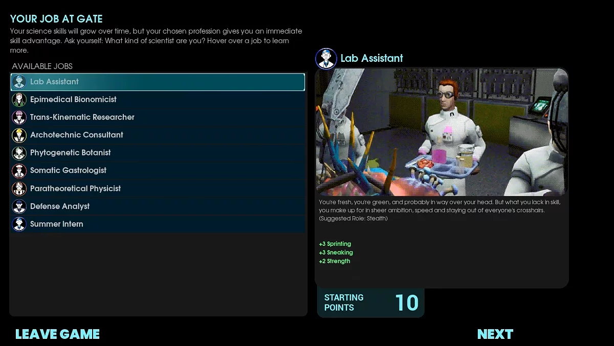 Сначала вам потребуется выбрать класс своего персонажа. Это повлияет на его характеристики и умения. Подбирайте профессию, подходящую под ваш стиль игры. Прочитайте все описания, не обращая внимание на заумные названия. Сами классы отличаются лишь более сильной начальным значением одного из навыков: строительства, борьба, стелса, изучения чертежей или готовки.