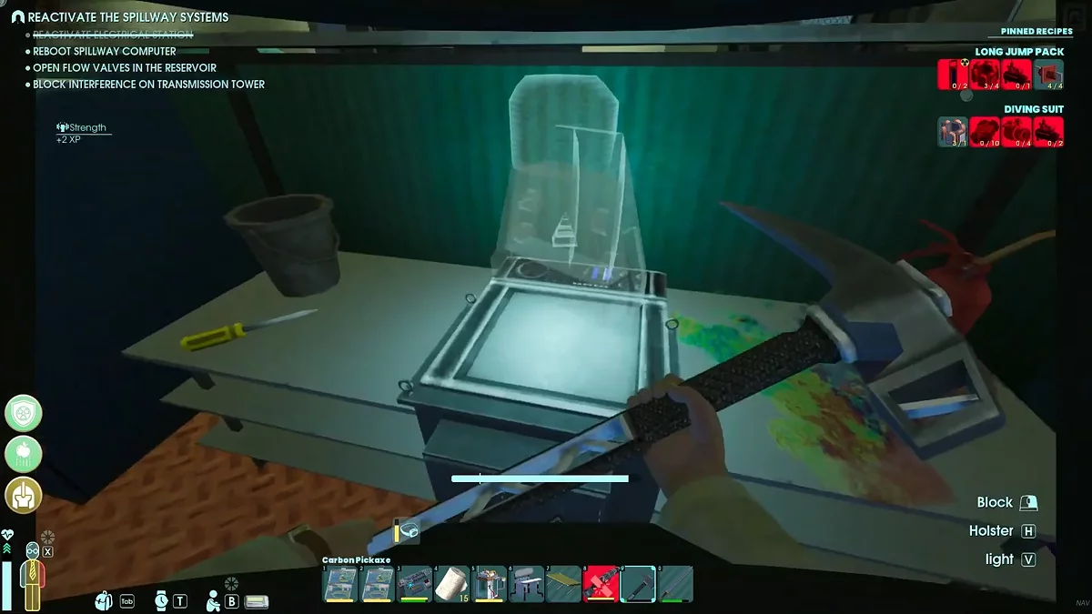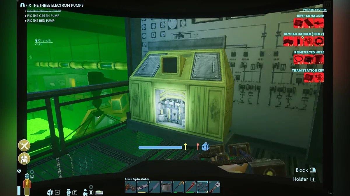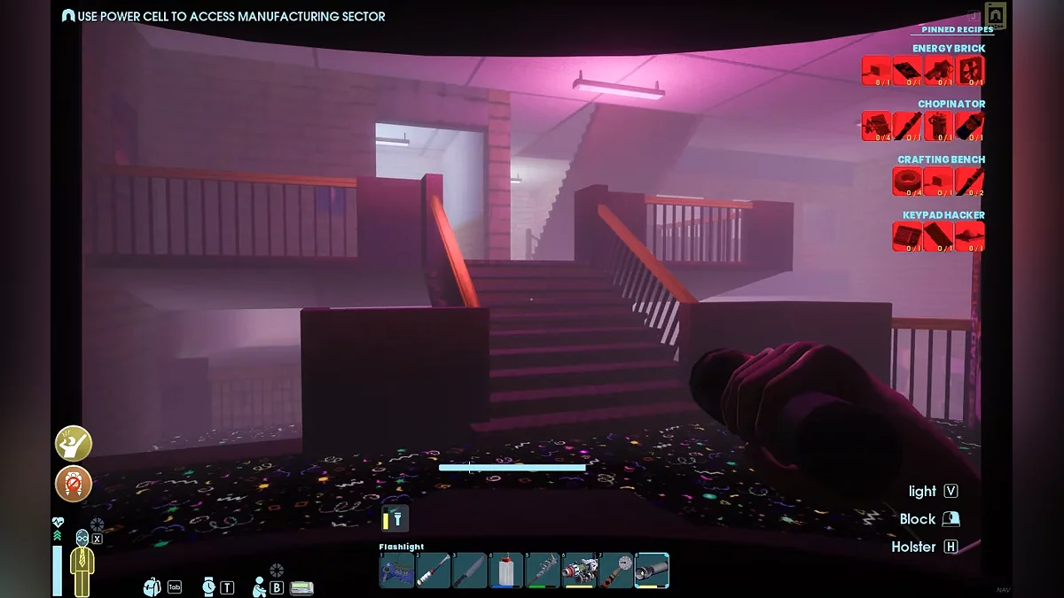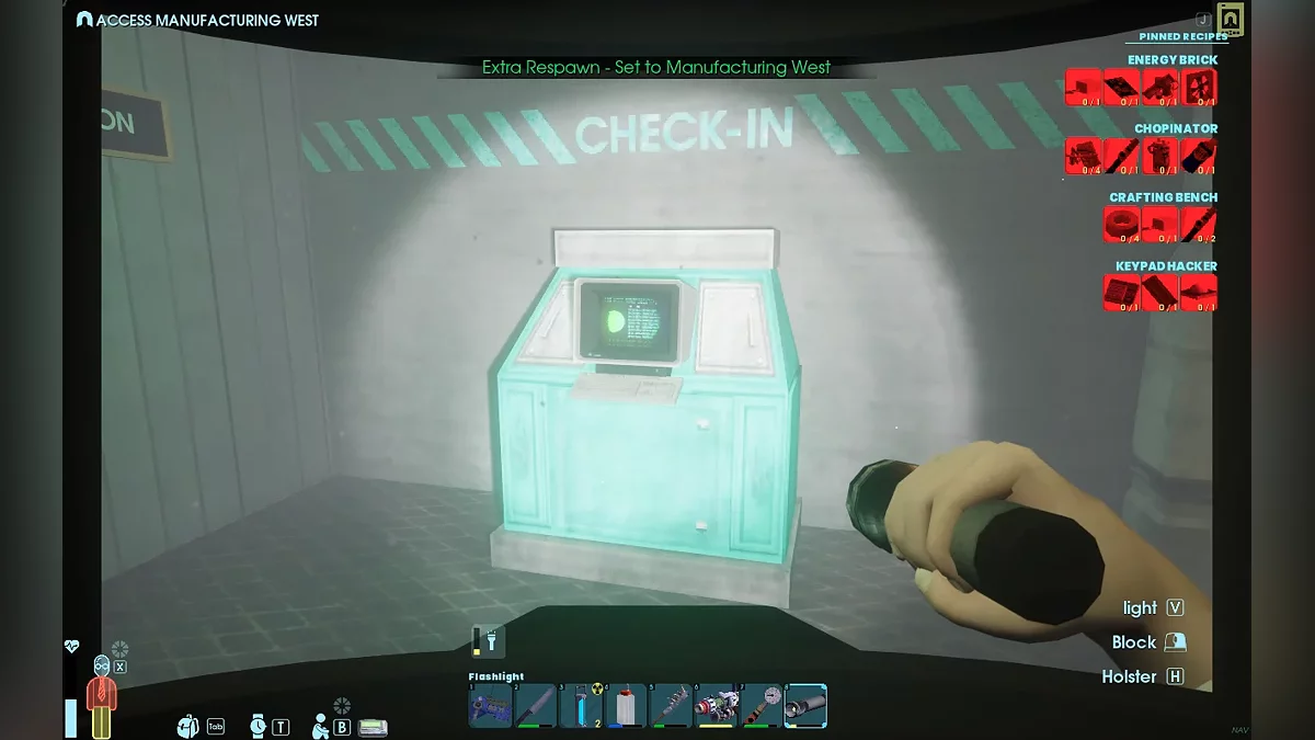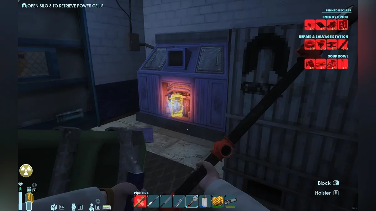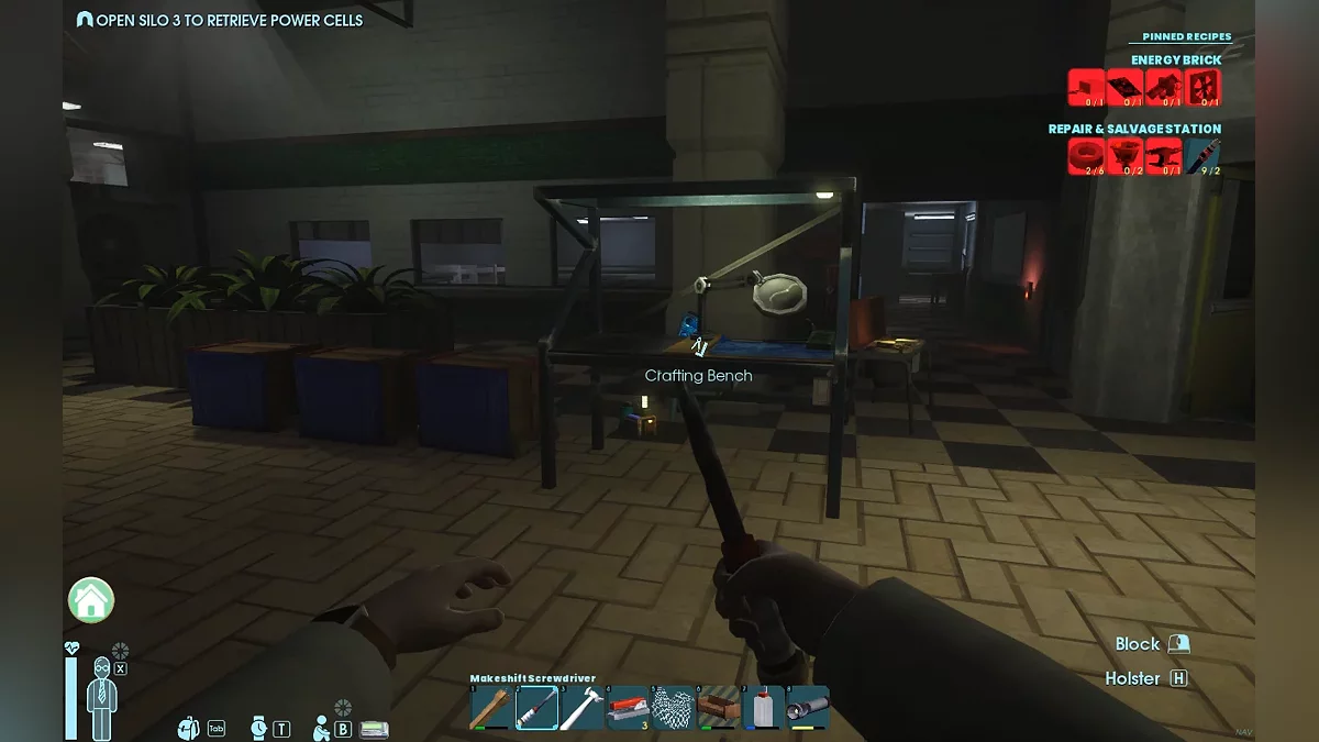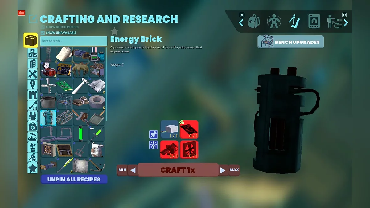Поставьте верстак неподалеку от розетки. Впервые взаимодействуя с ним, вы откроете множество полезных предметов, в том числе рюкзак, увеличивающий объем инвентаря. Когда будете готовы, изготовьте энергоблок.
