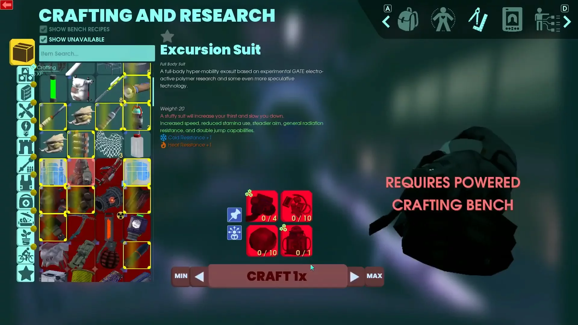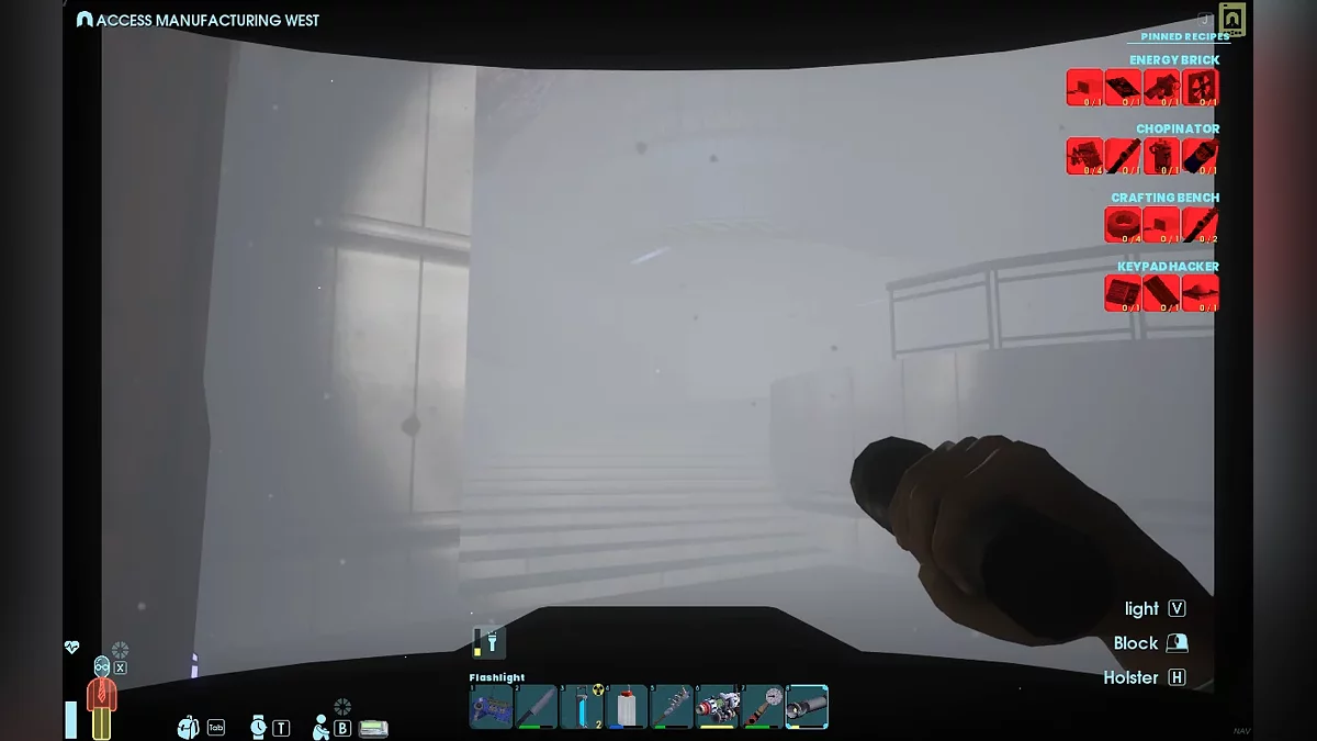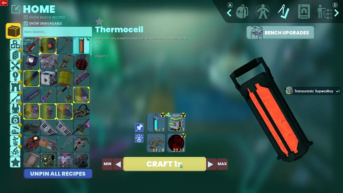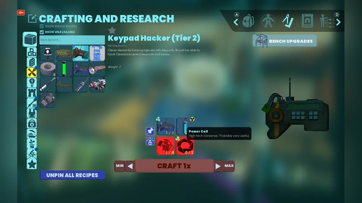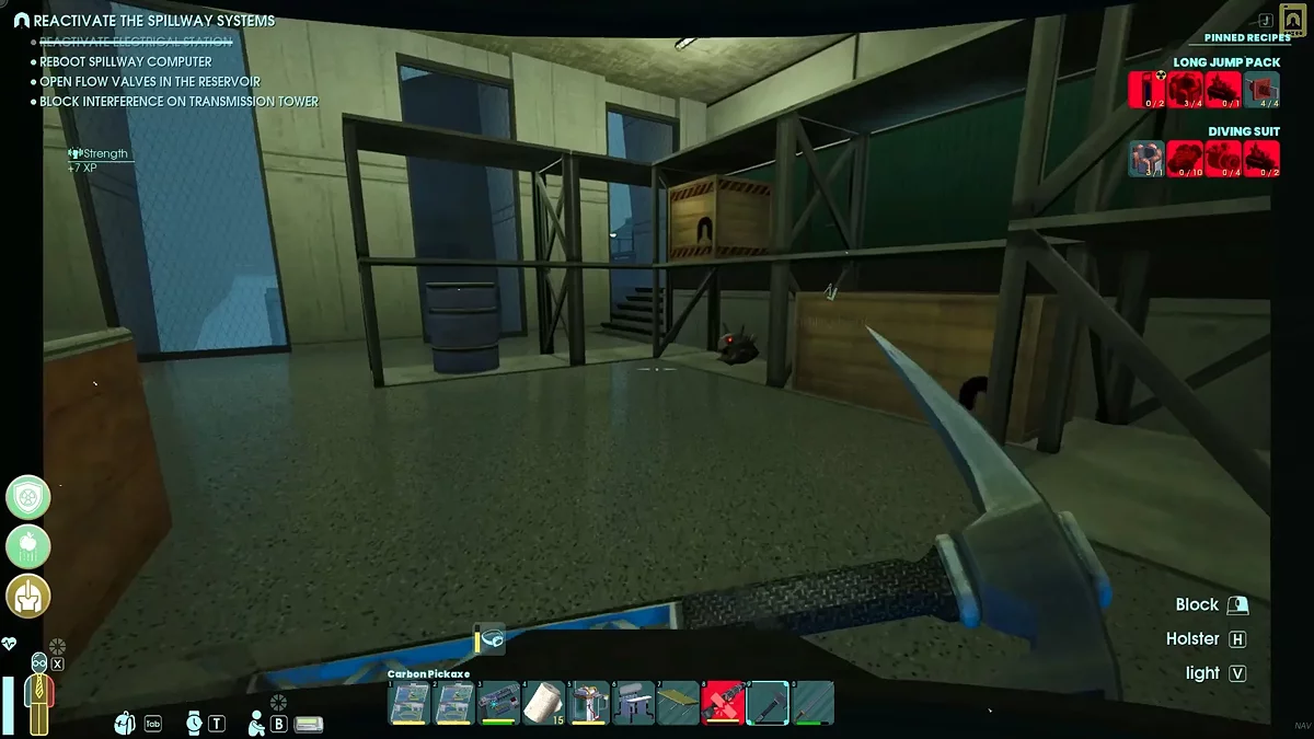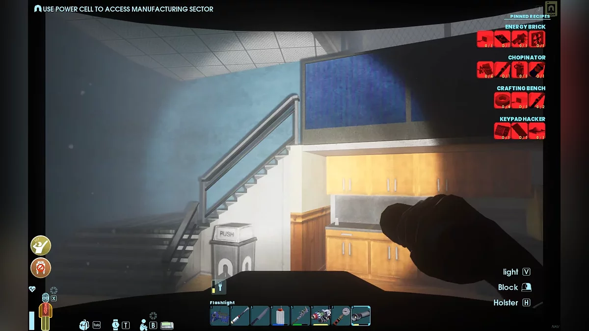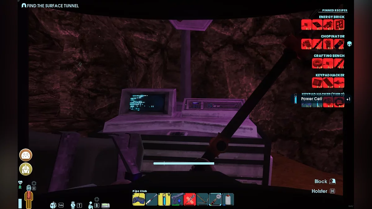Поставьте верстак неподалеку от розетки. Впервые взаимодействуя с ним, вы откроете множество полезных предметов, в том числе рюкзак, увеличивающий объем инвентаря. Когда будете готовы, изготовьте энергоблок.