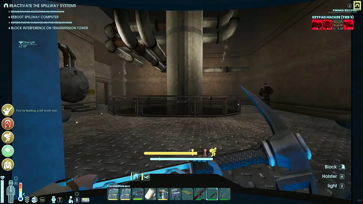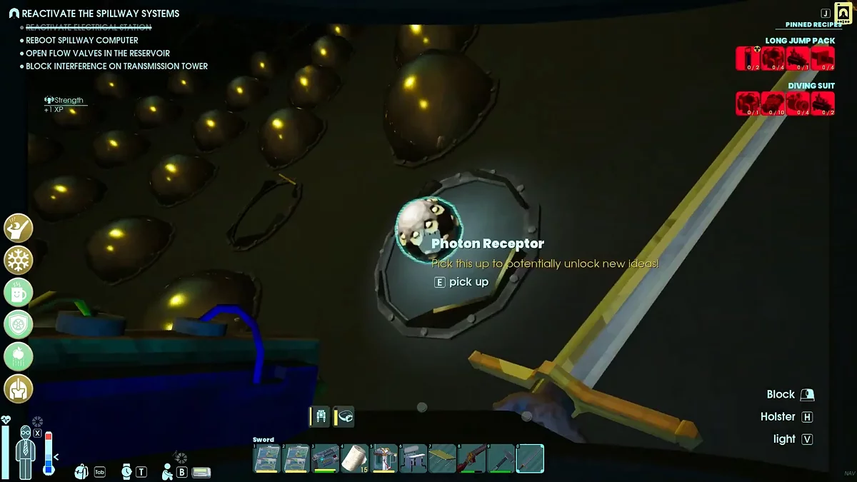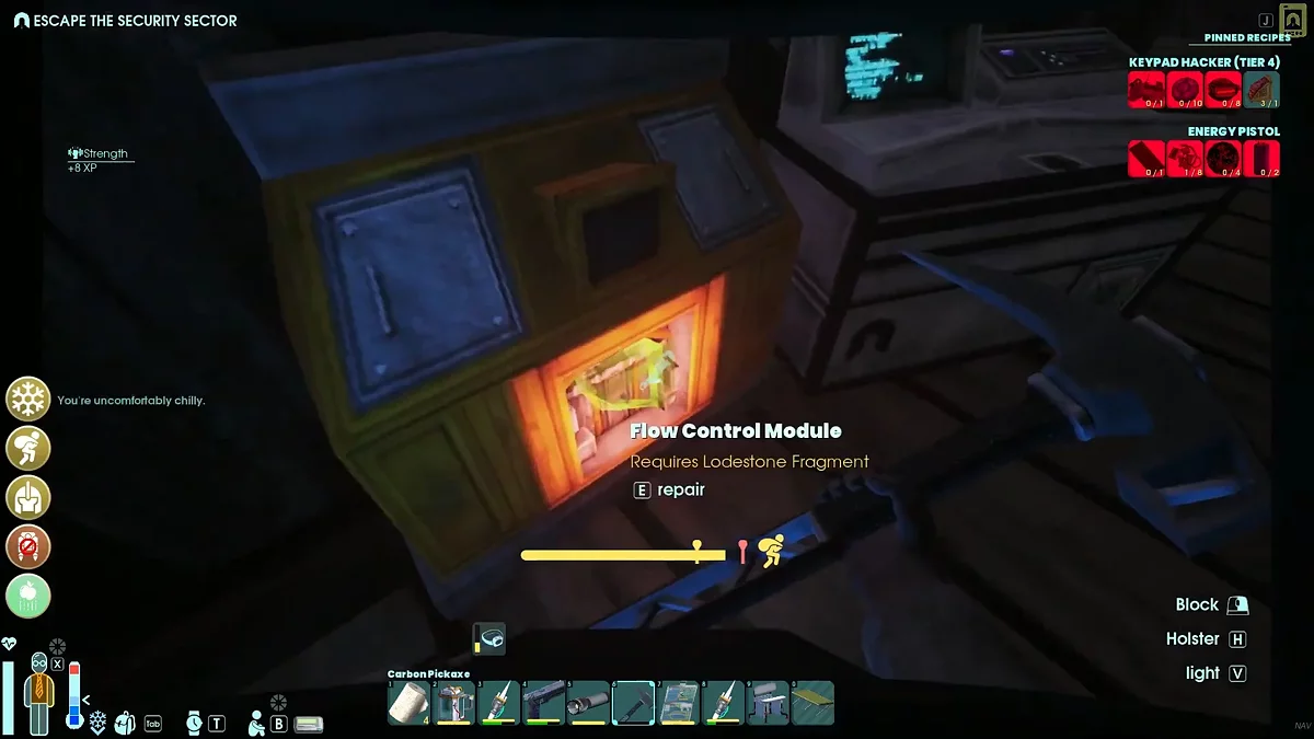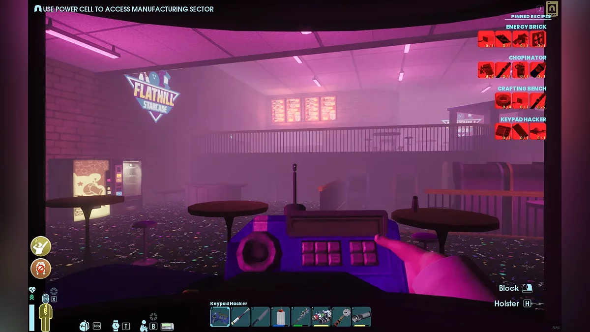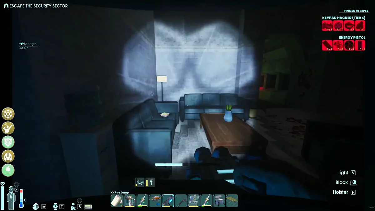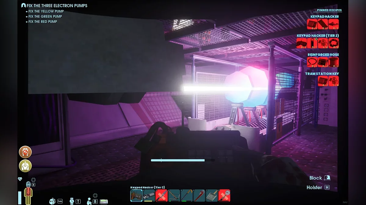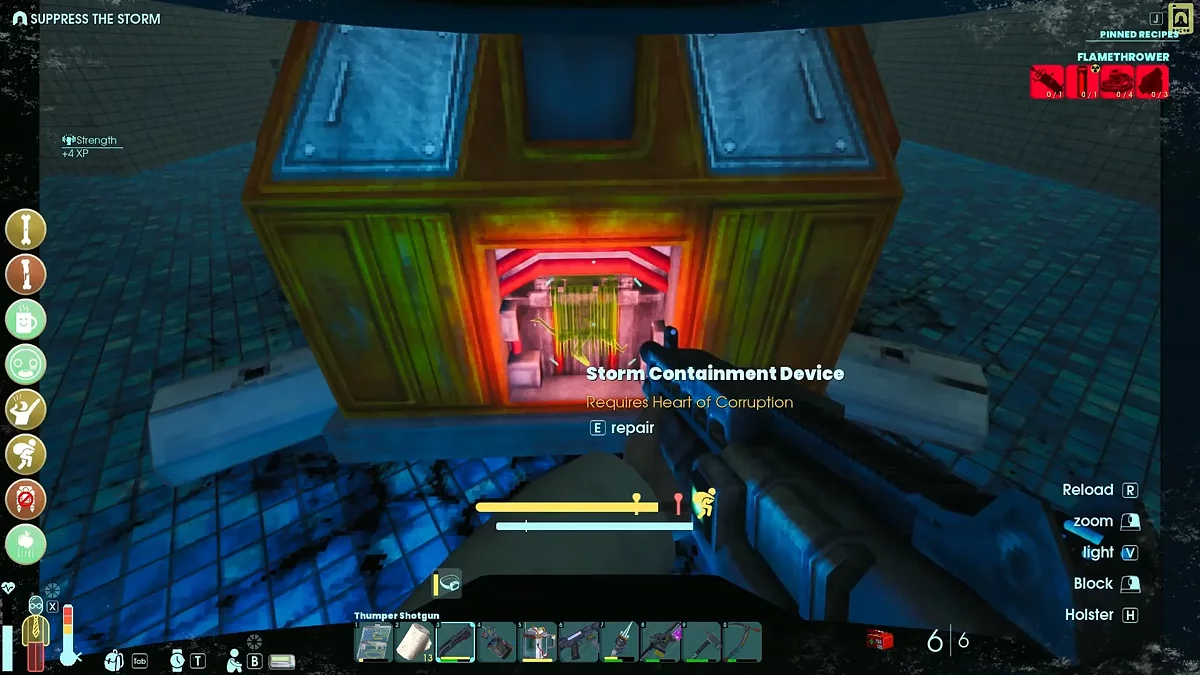 Поставьте верстак неподалеку от розетки. Впервые взаимодействуя с ним, вы откроете множество полезных предметов, в том числе рюкзак, увеличивающий объем инвентаря. Когда будете готовы, изготовьте энергоблок.