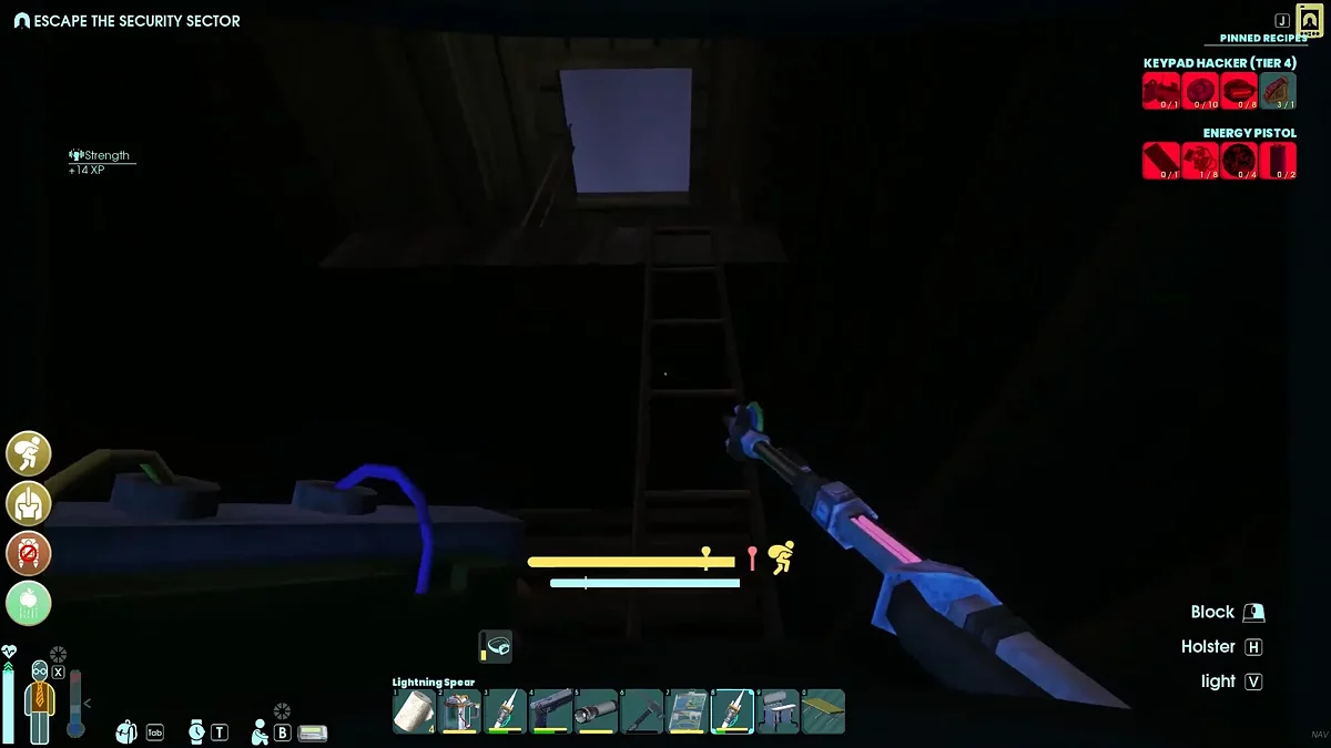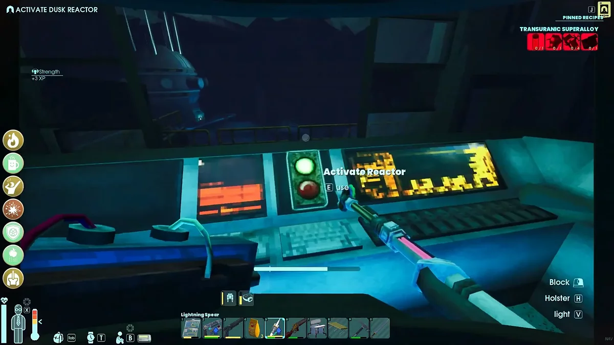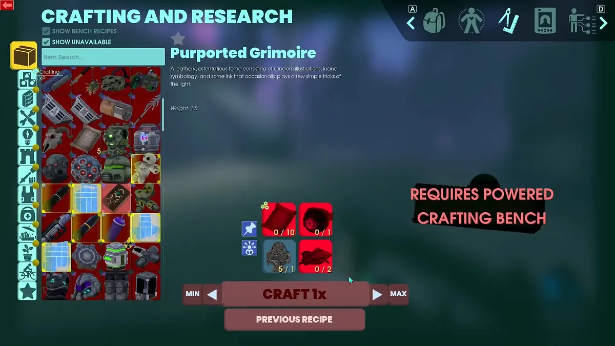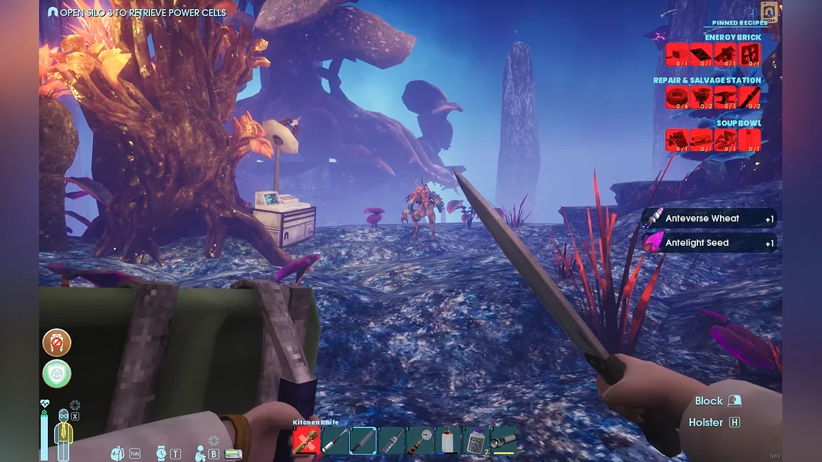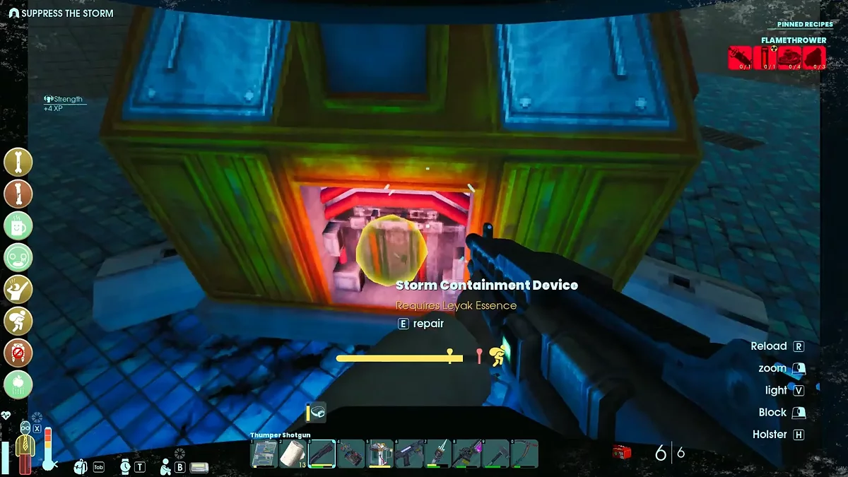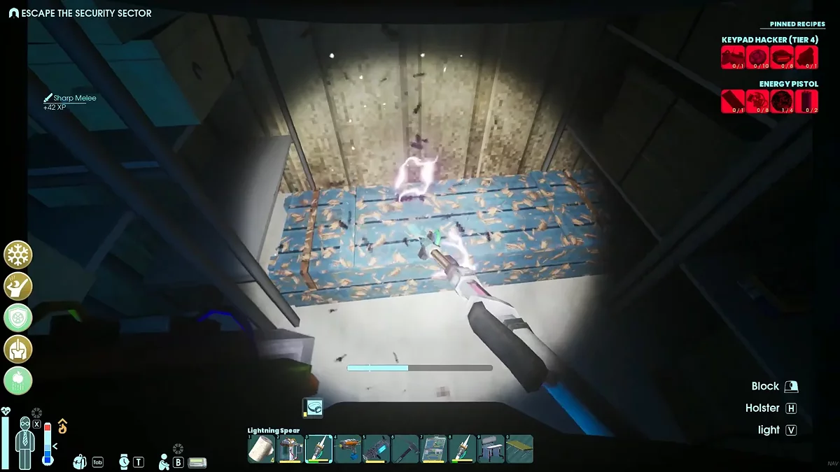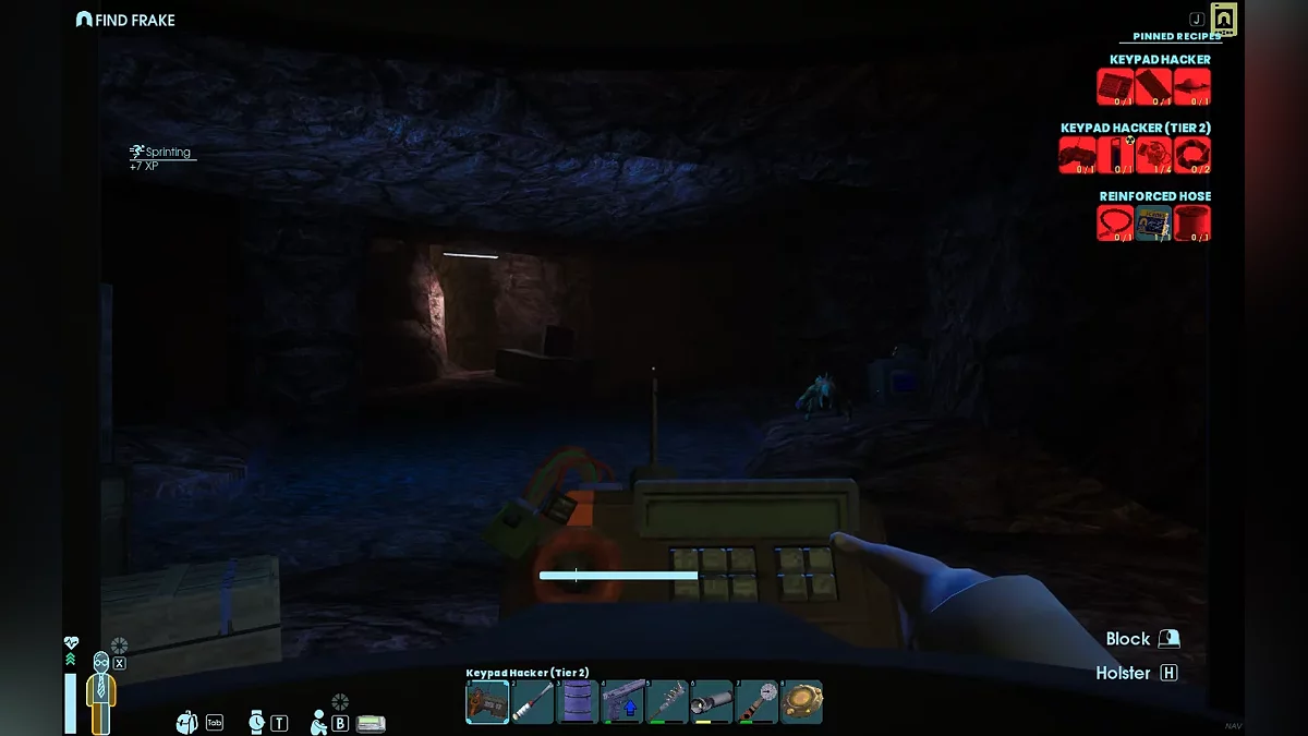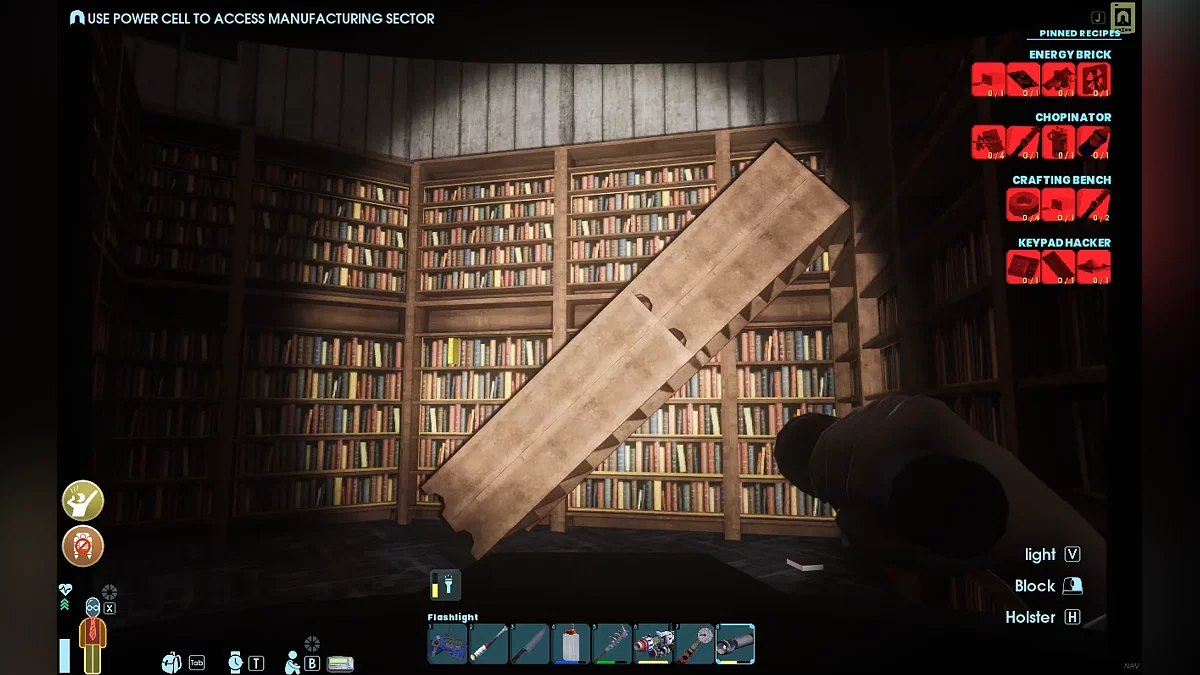 Поставьте верстак неподалеку от розетки. Впервые взаимодействуя с ним, вы откроете множество полезных предметов, в том числе рюкзак, увеличивающий объем инвентаря. Когда будете готовы, изготовьте энергоблок.