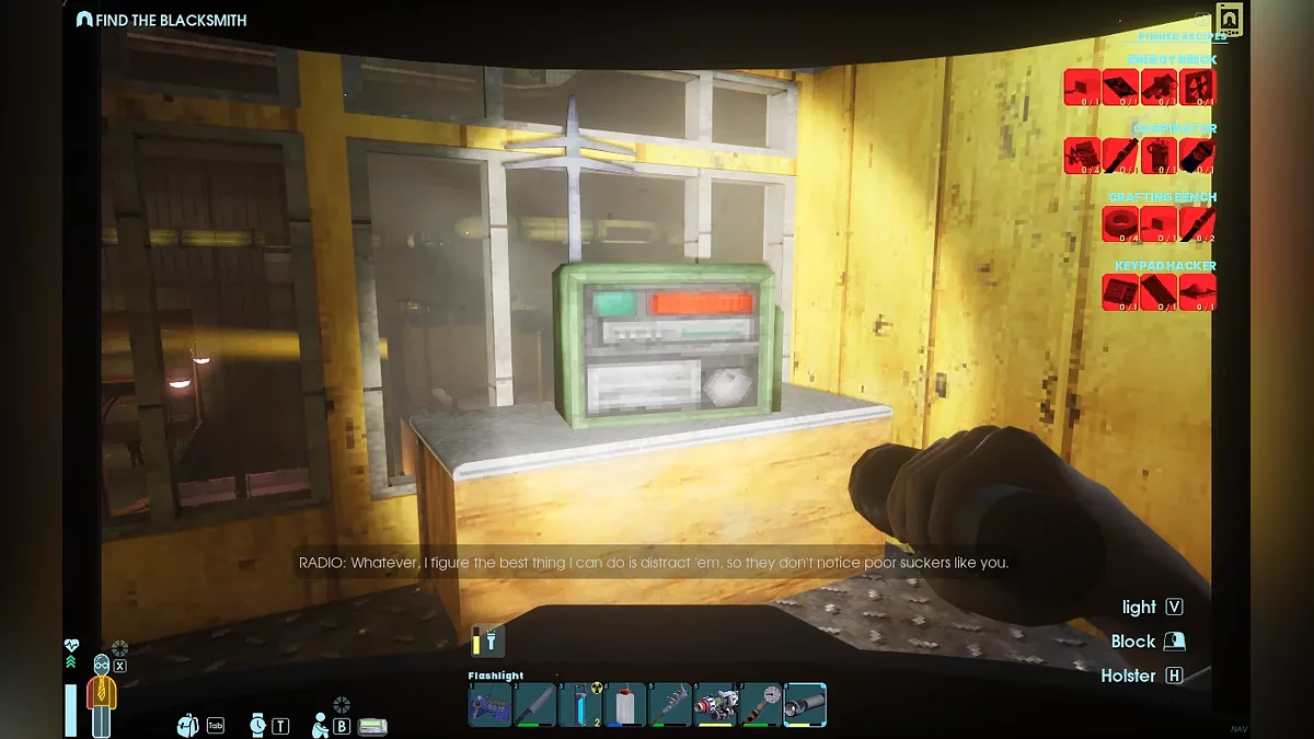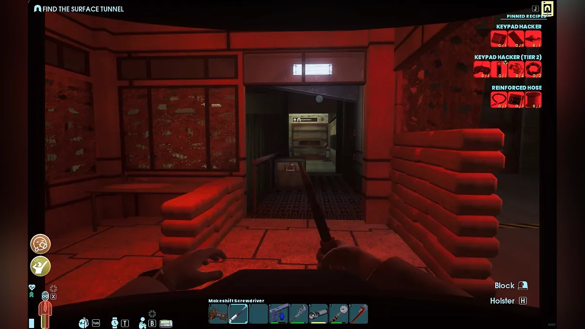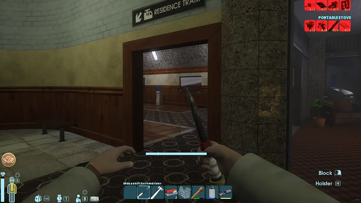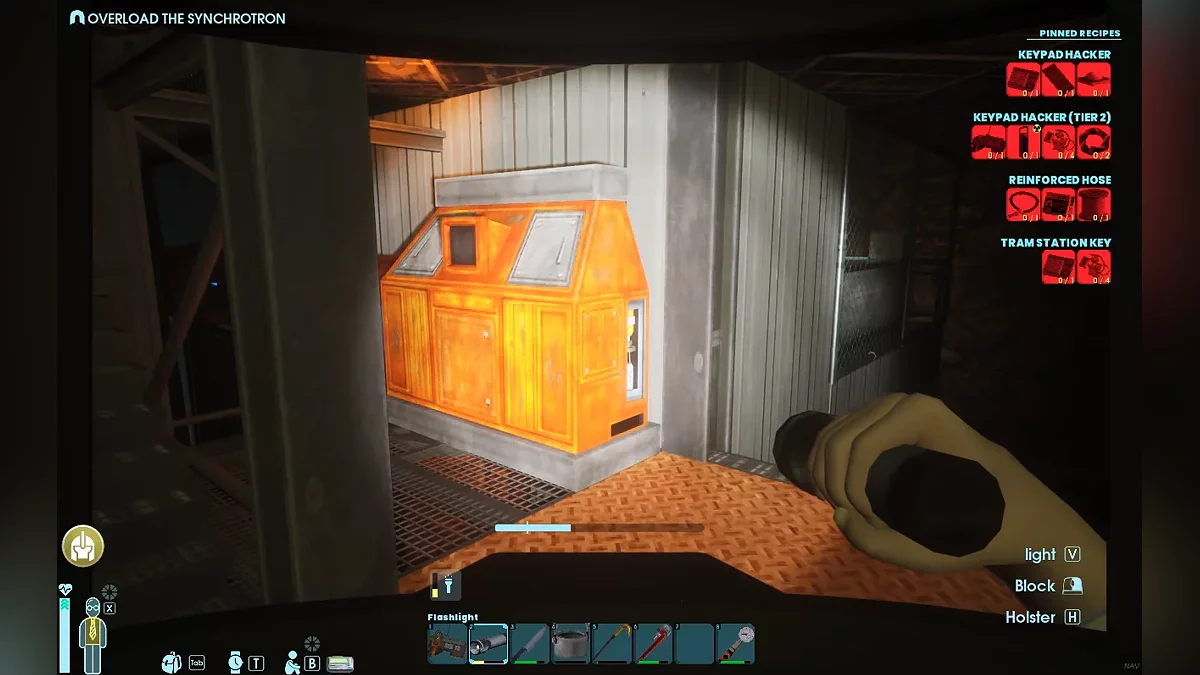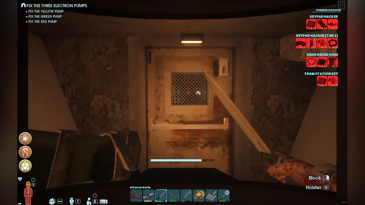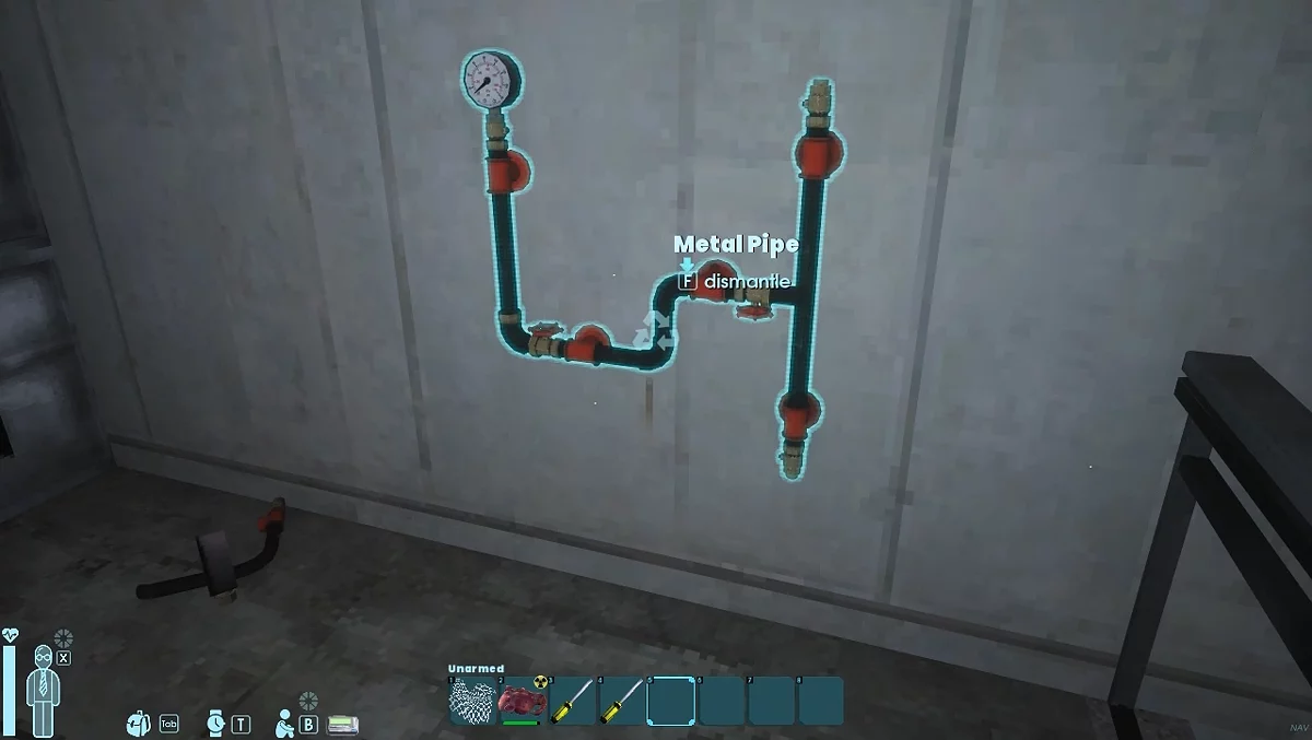 В следующем отсеке можно встретить множество металлических труб. Демонтируйте их, чтобы запастись манометрами и самими трубами. Также в левом секторе не пройдите мимо фонарика. Перед входом на кухню включите терминал и откройте прикрепленную к письму фотографию, чтобы разблокировать рецепт заточки, а затем взаимодействуйте с настольной лампой для добычи других чертежей.