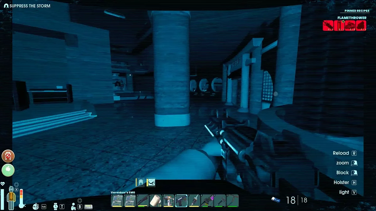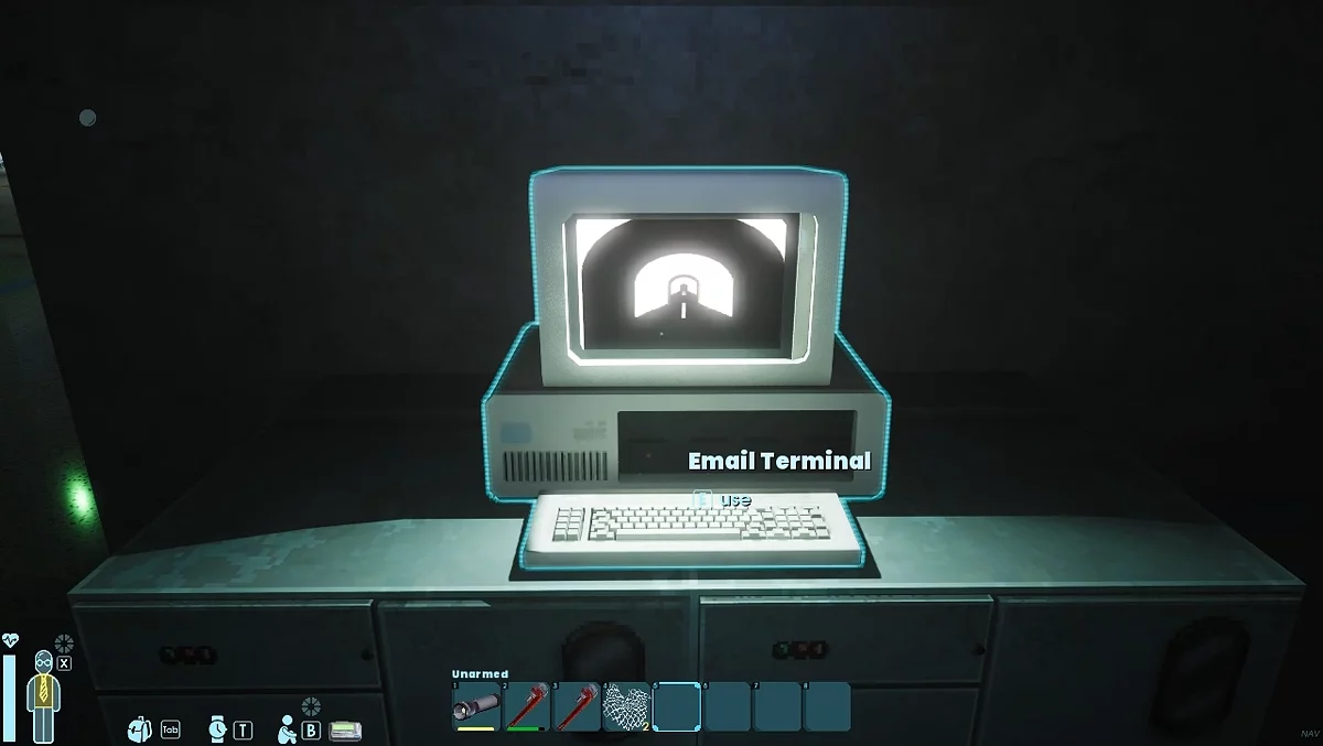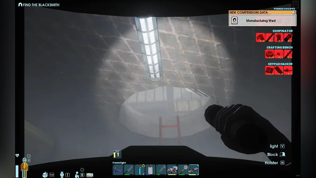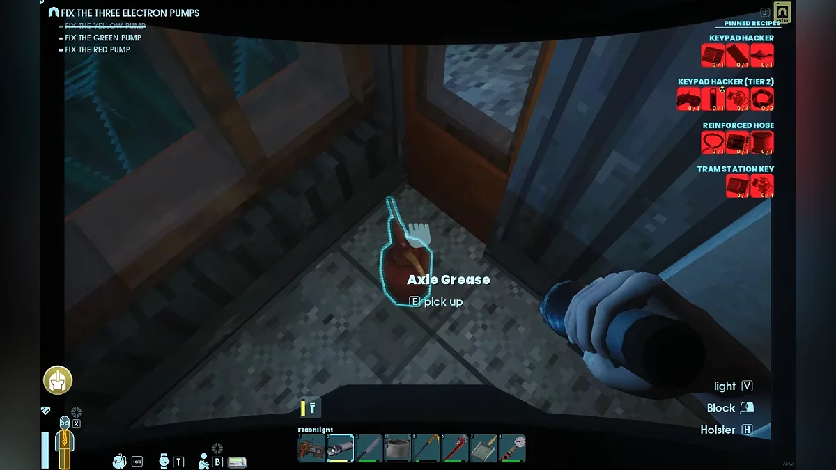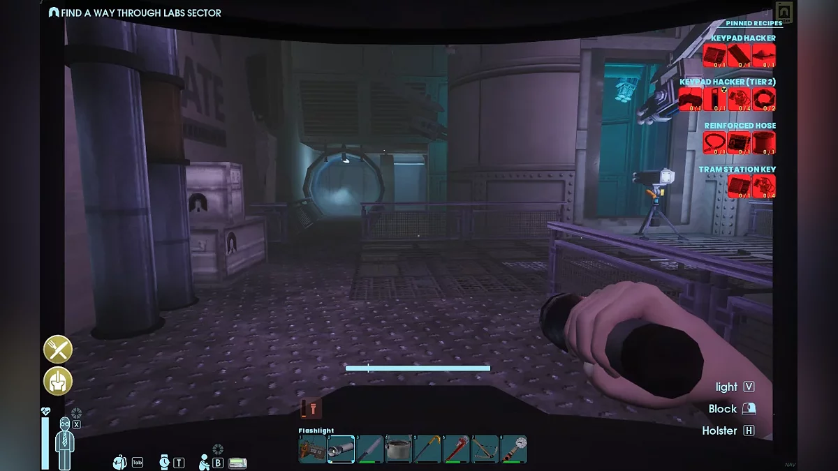 В следующем отсеке можно встретить множество металлических труб. Демонтируйте их, чтобы запастись манометрами и самими трубами. Также в левом секторе не пройдите мимо фонарика. Перед входом на кухню включите терминал и откройте прикрепленную к письму фотографию, чтобы разблокировать рецепт заточки, а затем взаимодействуйте с настольной лампой для добычи других чертежей.
