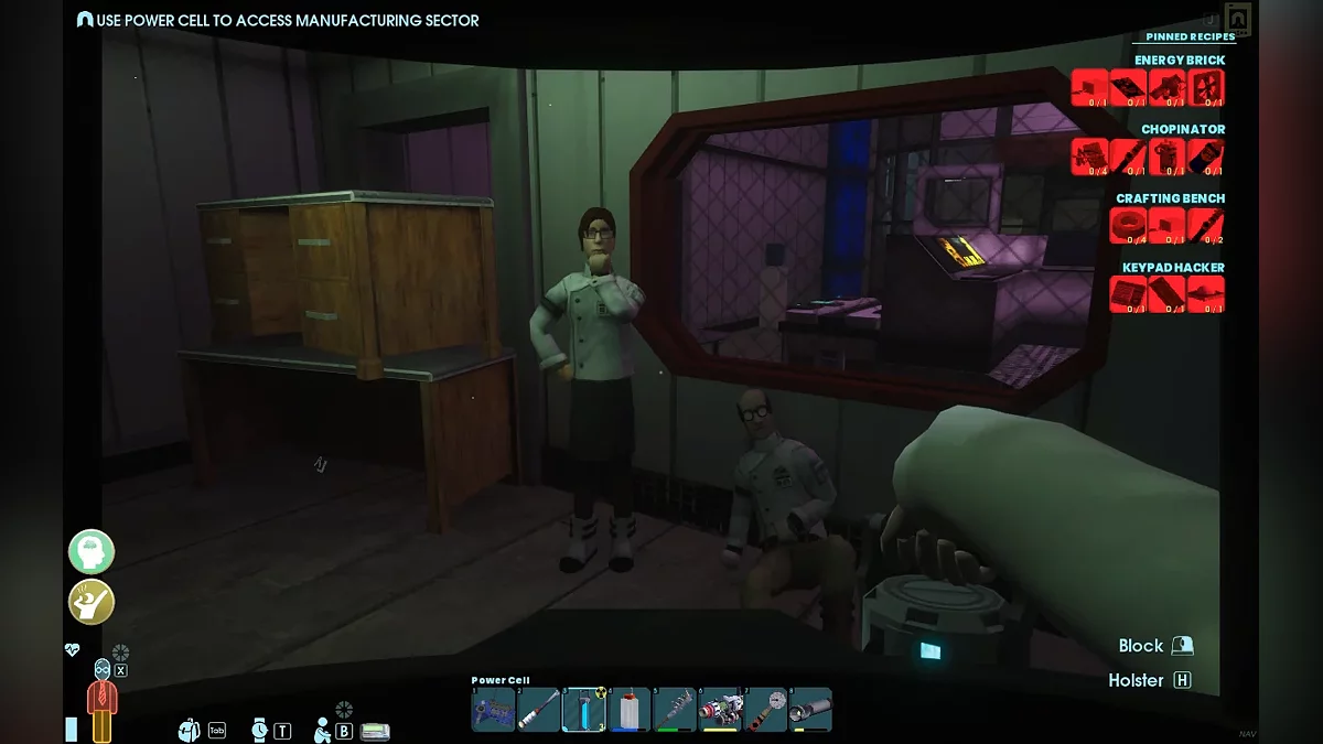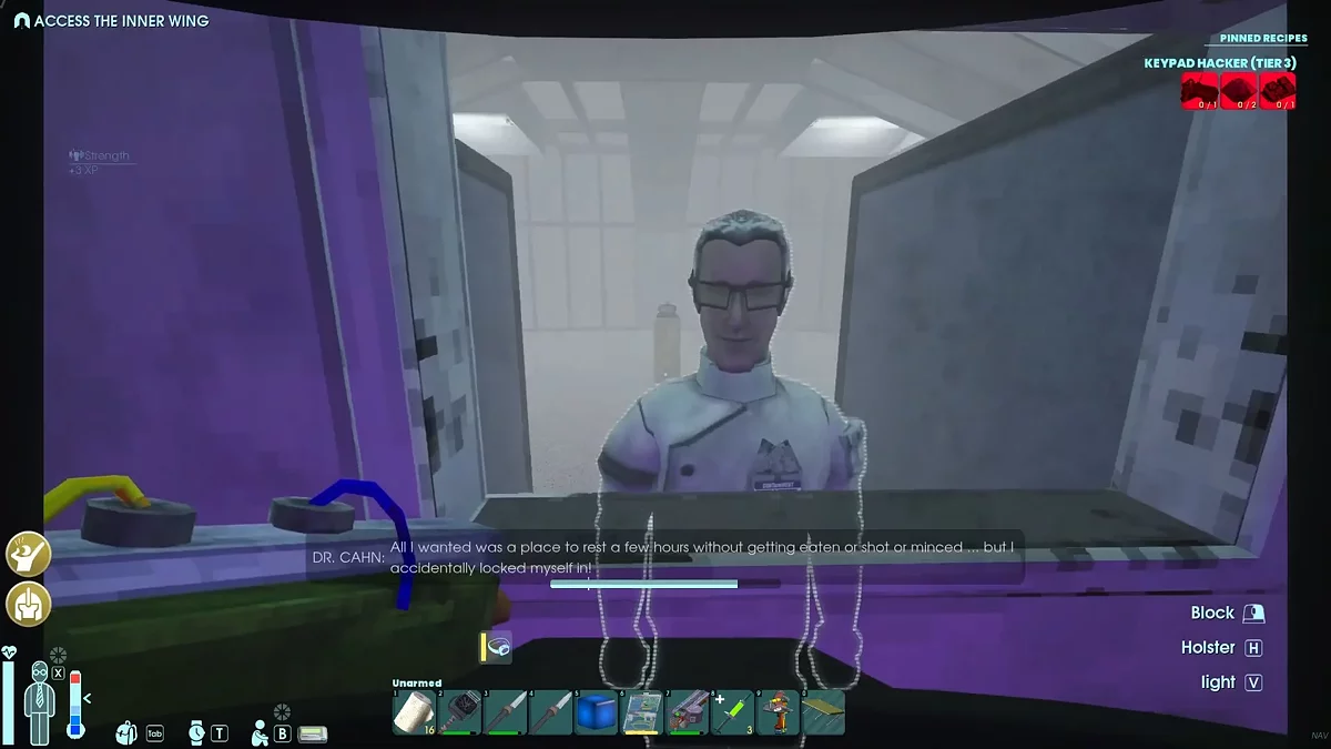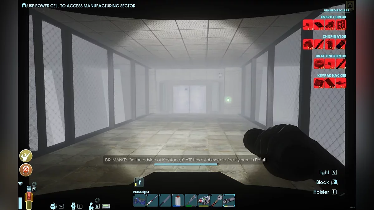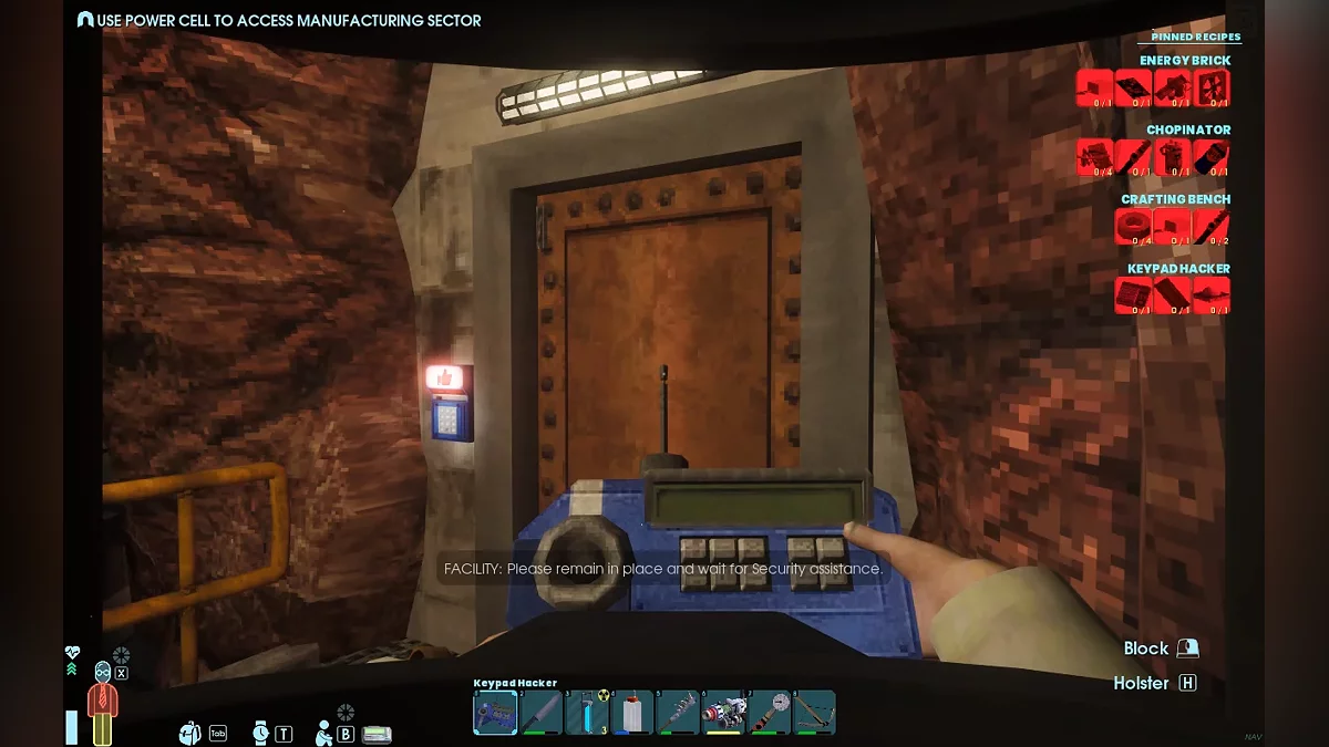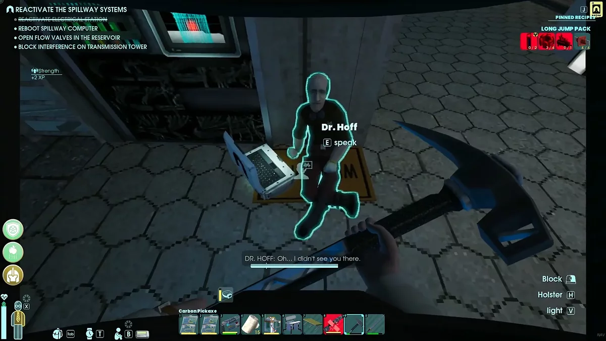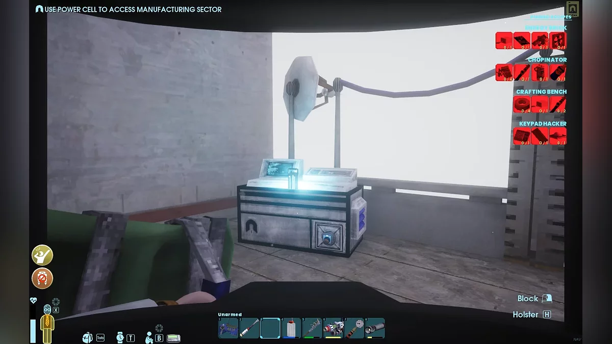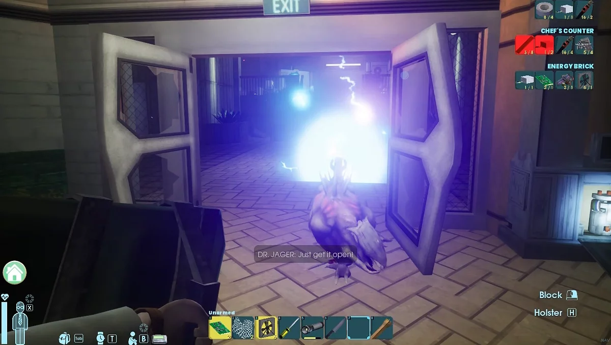 Снаружи вас ждет доктор Джагер. Чтобы попасть к нему, необходимо изготовить энергоблок и вставить его в отсек справа от дверей. Для этого надо предварительно поставить верстак где-нибудь неподалеку.