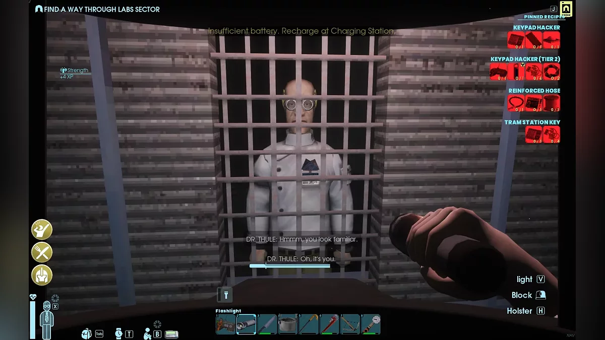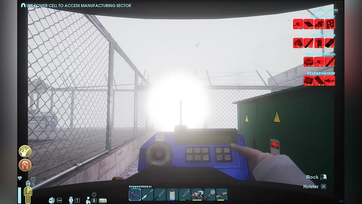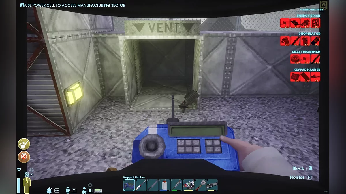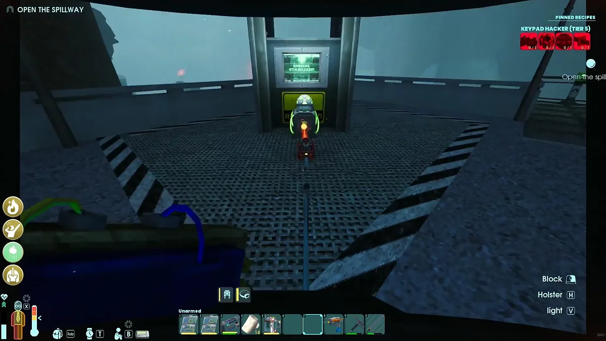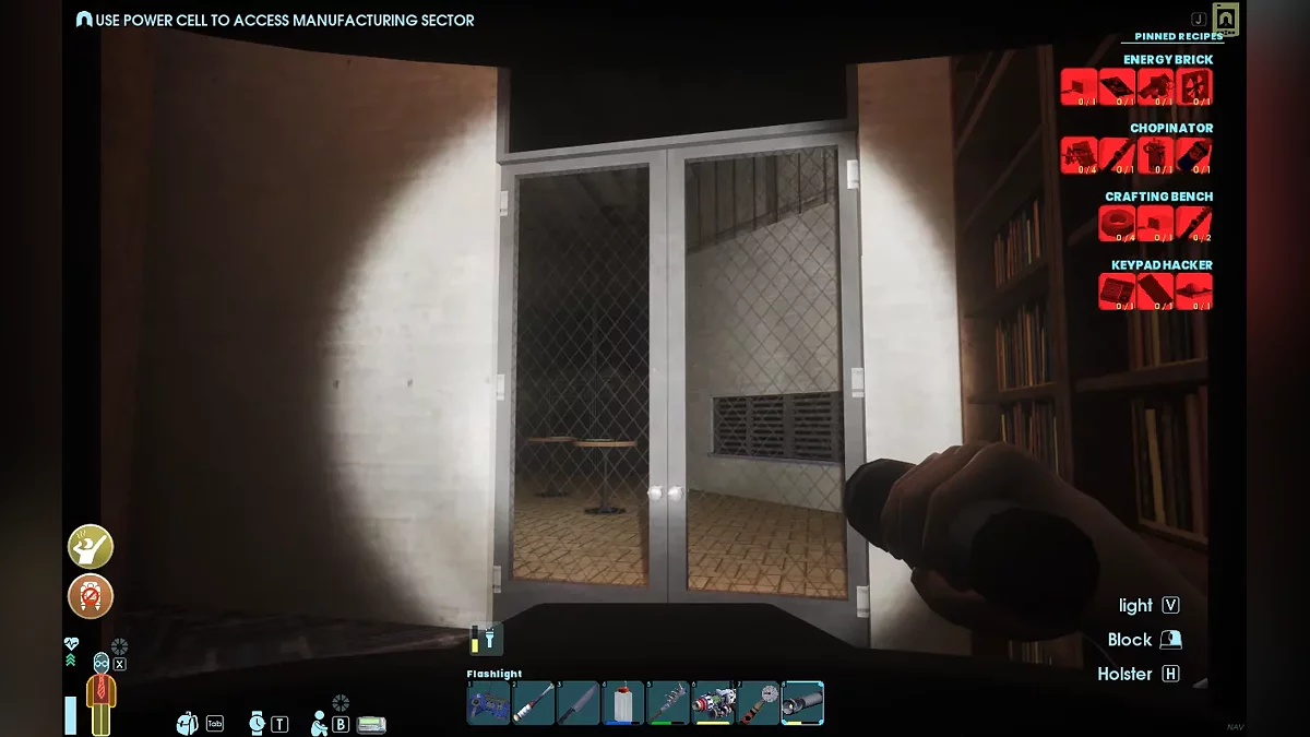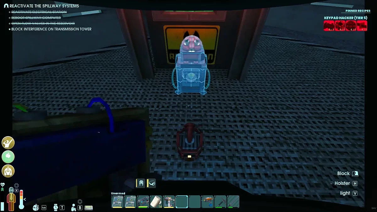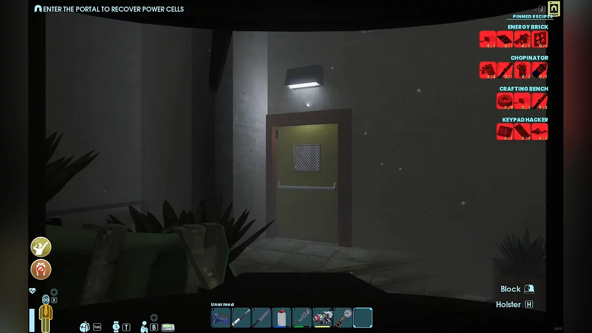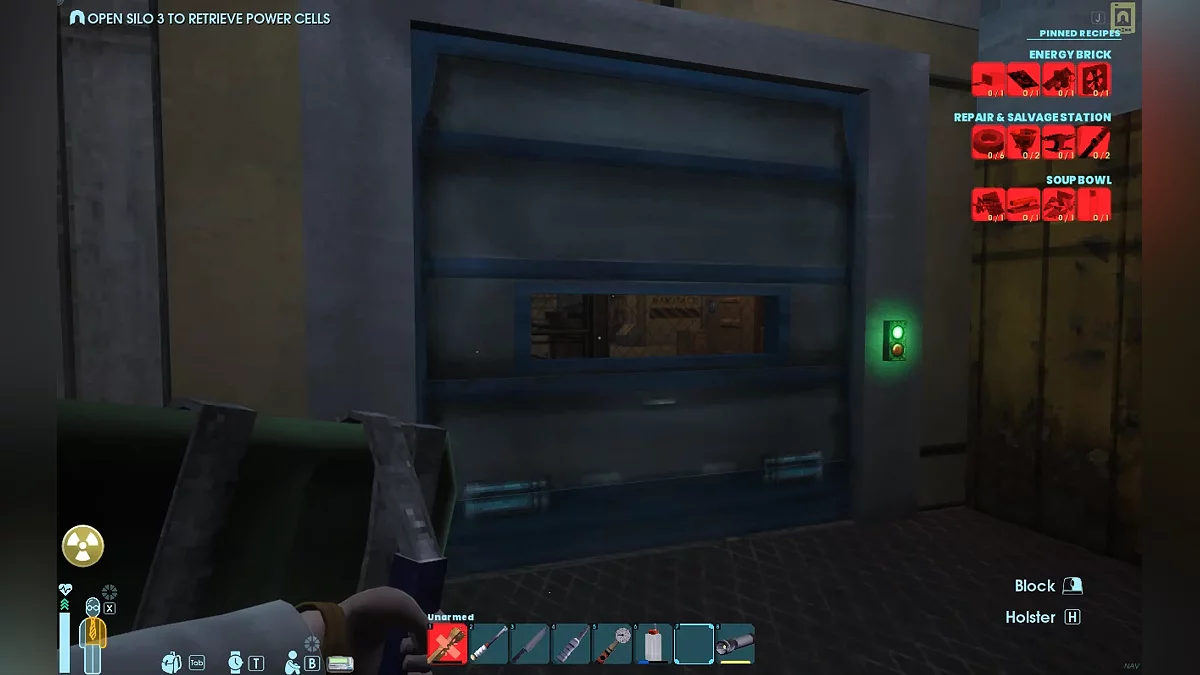 Снаружи вас ждет доктор Джагер. Чтобы попасть к нему, необходимо изготовить энергоблок и вставить его в отсек справа от дверей. Для этого надо предварительно поставить верстак где-нибудь неподалеку.
