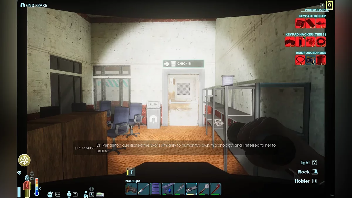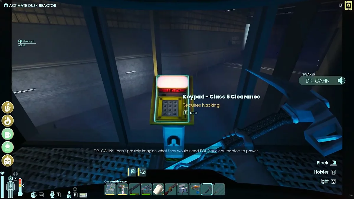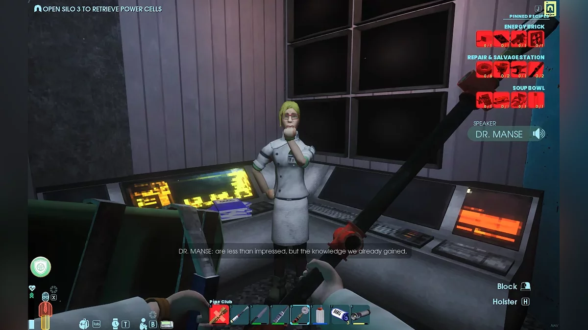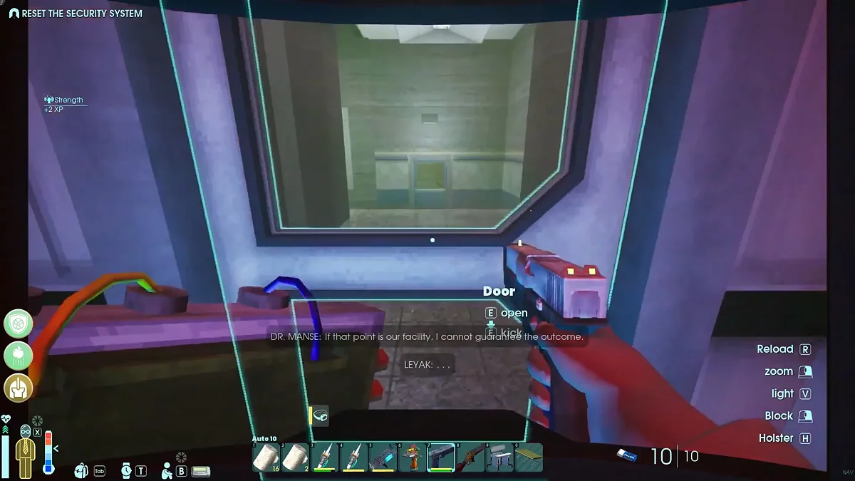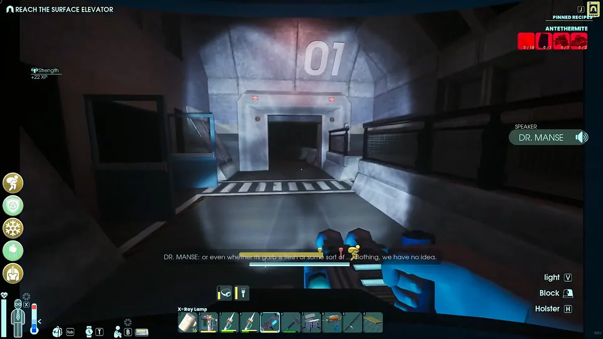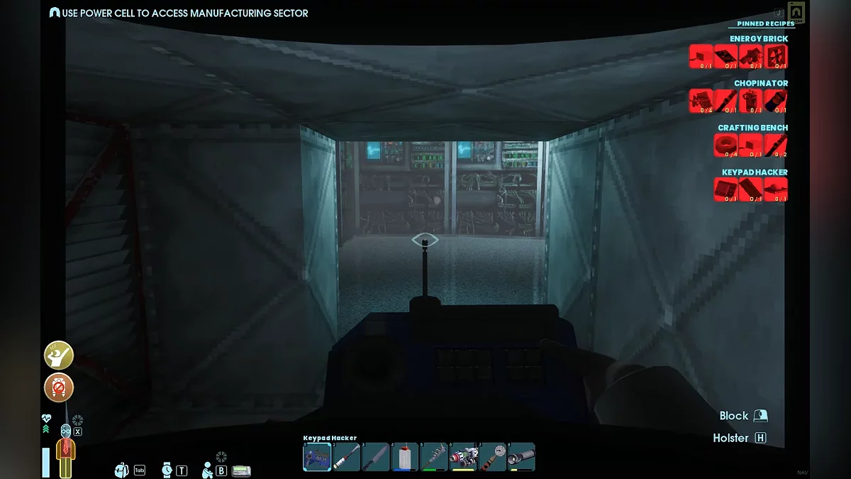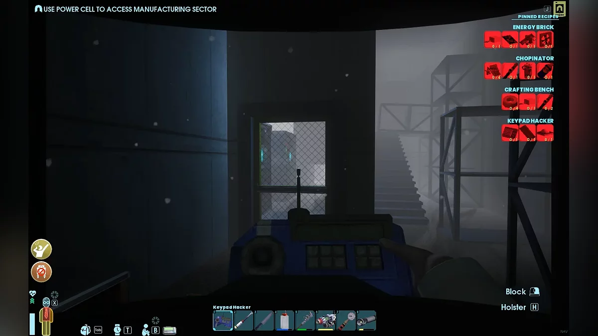 Снаружи вас ждет доктор Джагер. Чтобы попасть к нему, необходимо изготовить энергоблок и вставить его в отсек справа от дверей. Для этого надо предварительно поставить верстак где-нибудь неподалеку.